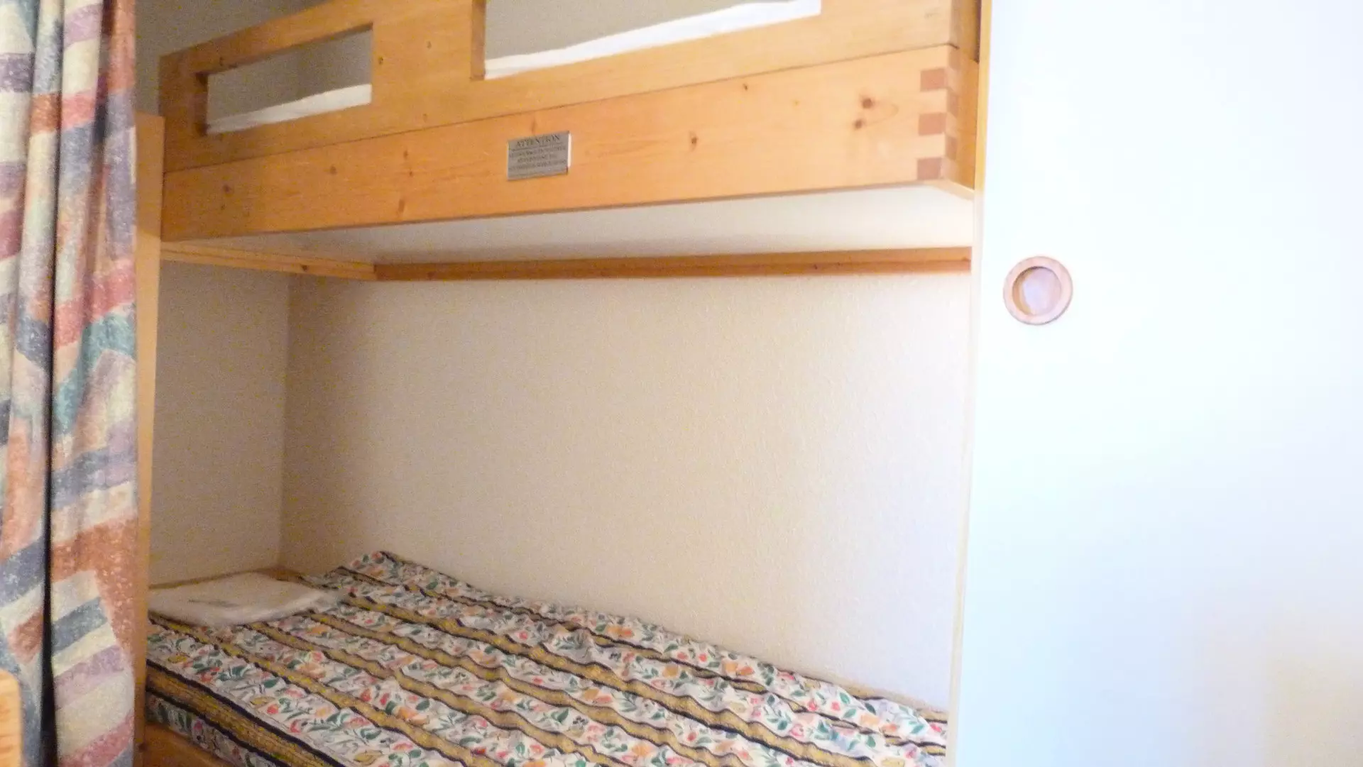 The upper floor offers you a bedroom with a double bed (2x80) and a mountain corner with 1 set of bunk beds (80).