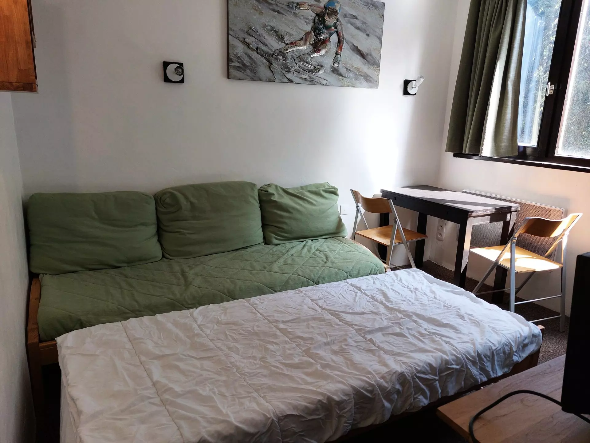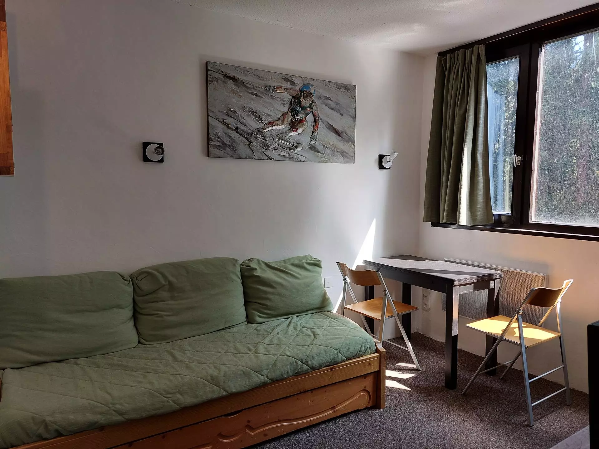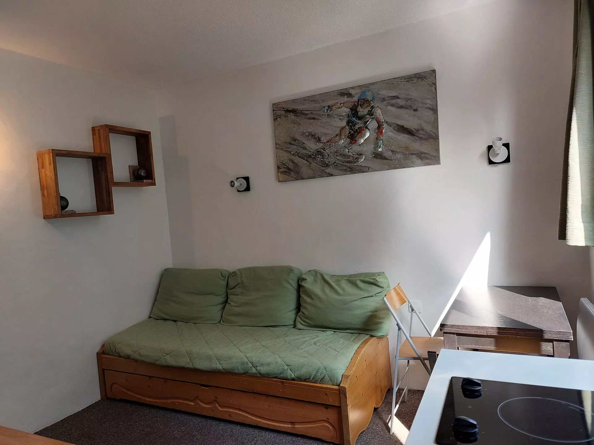 In the living room there is a pull-out sofa bed.