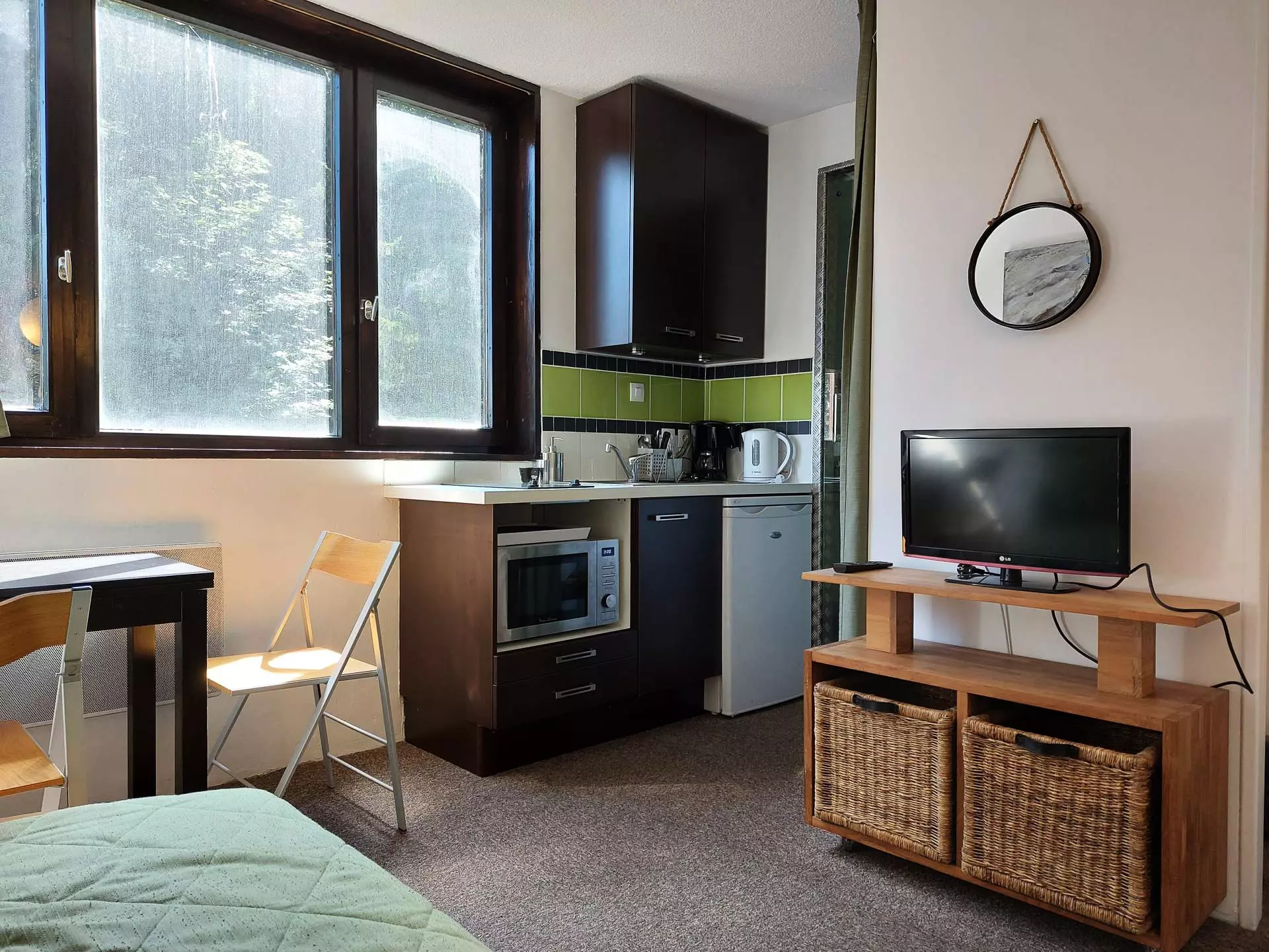 It is fully equipped with a combination microwave oven, refrigerator, toaster, kettle and coffee maker.