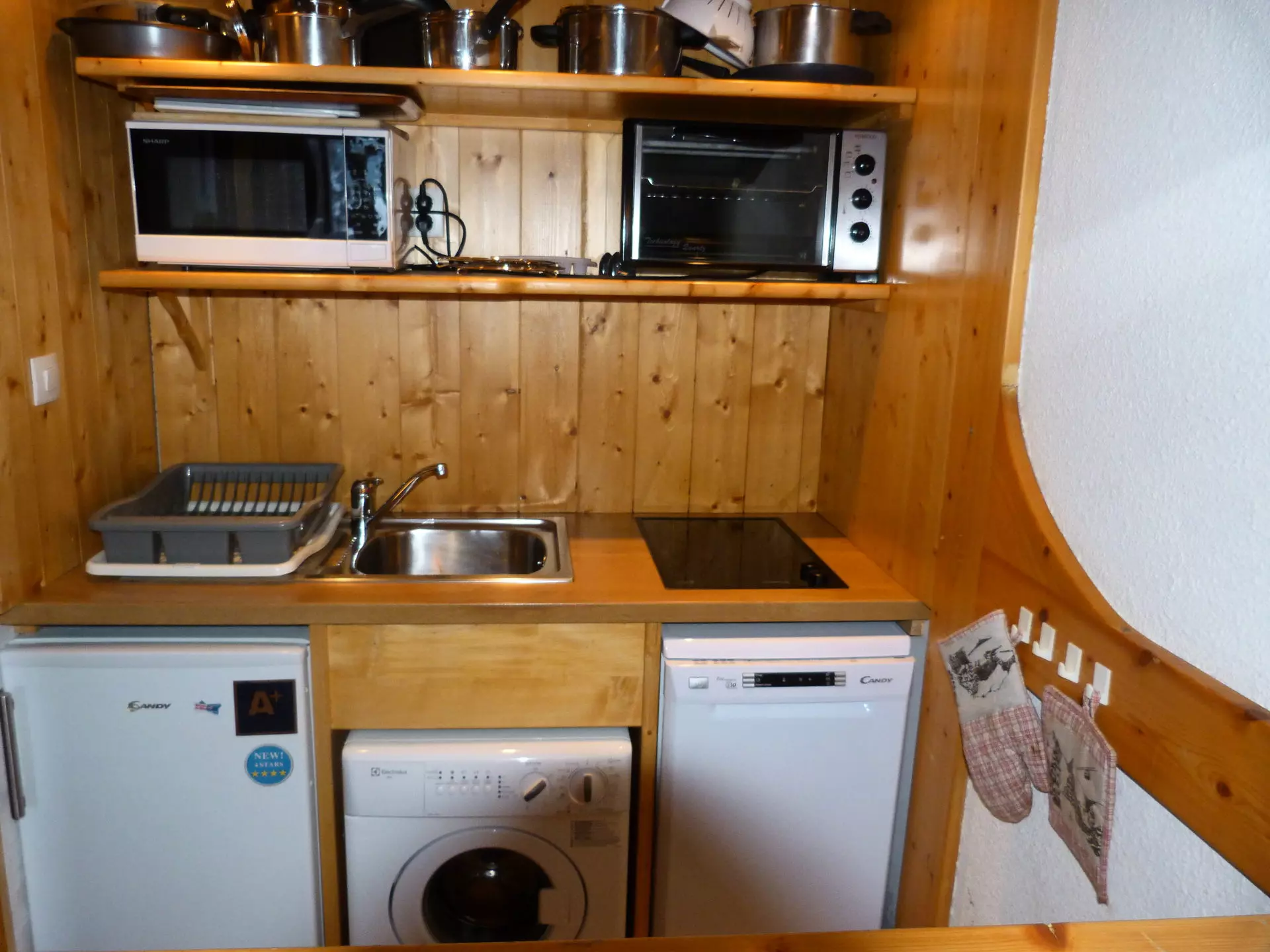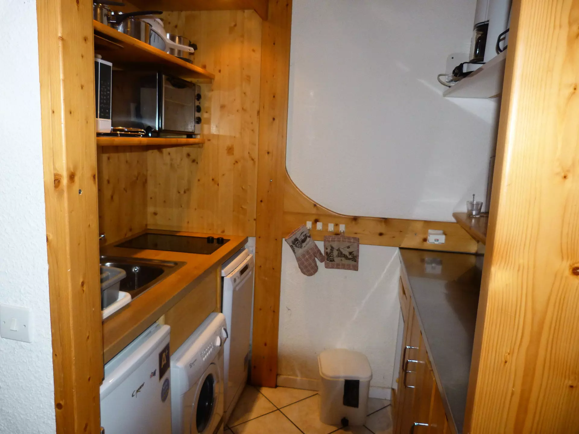 It is fully equipped with electric hobs, a microwave, a refrigerator, a dishwasher and an oven.