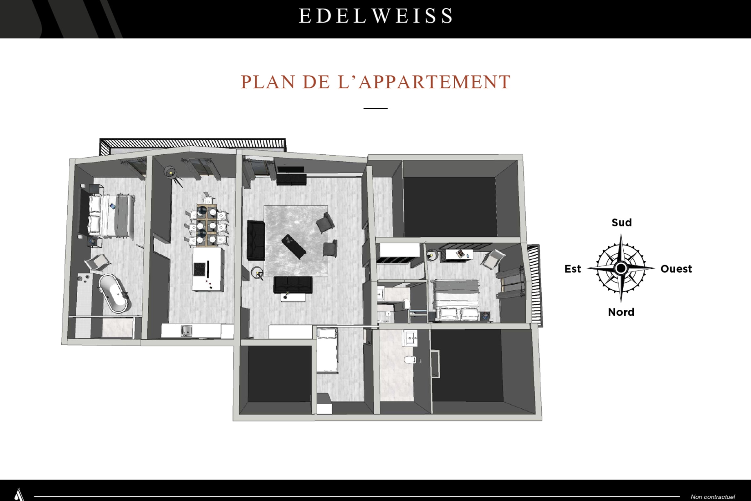 Located on the fourth floor, with lift (lift till third fllor and 16 steps) in Residence Alticîmes, perfect for 1 to 6 people, it includes :
