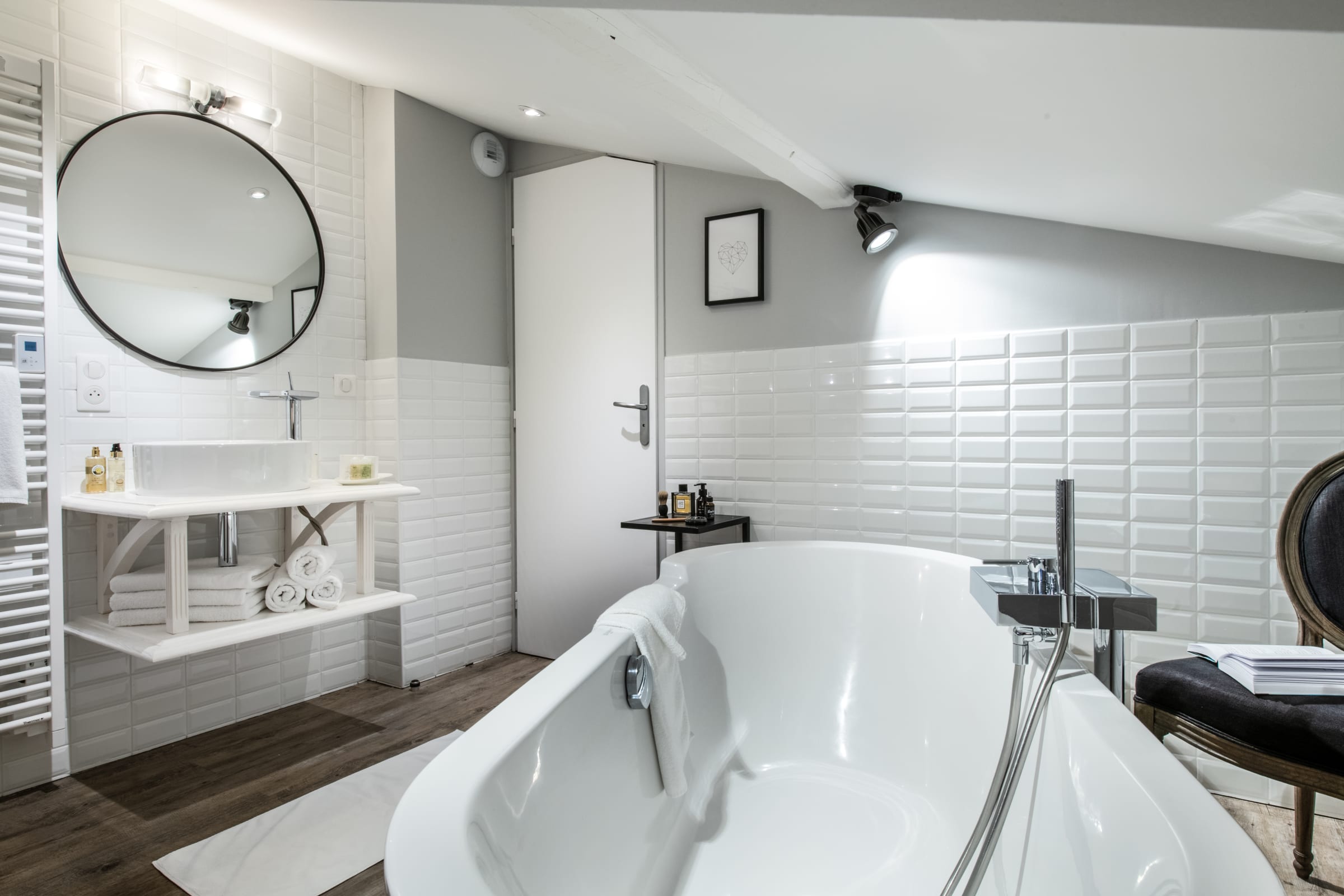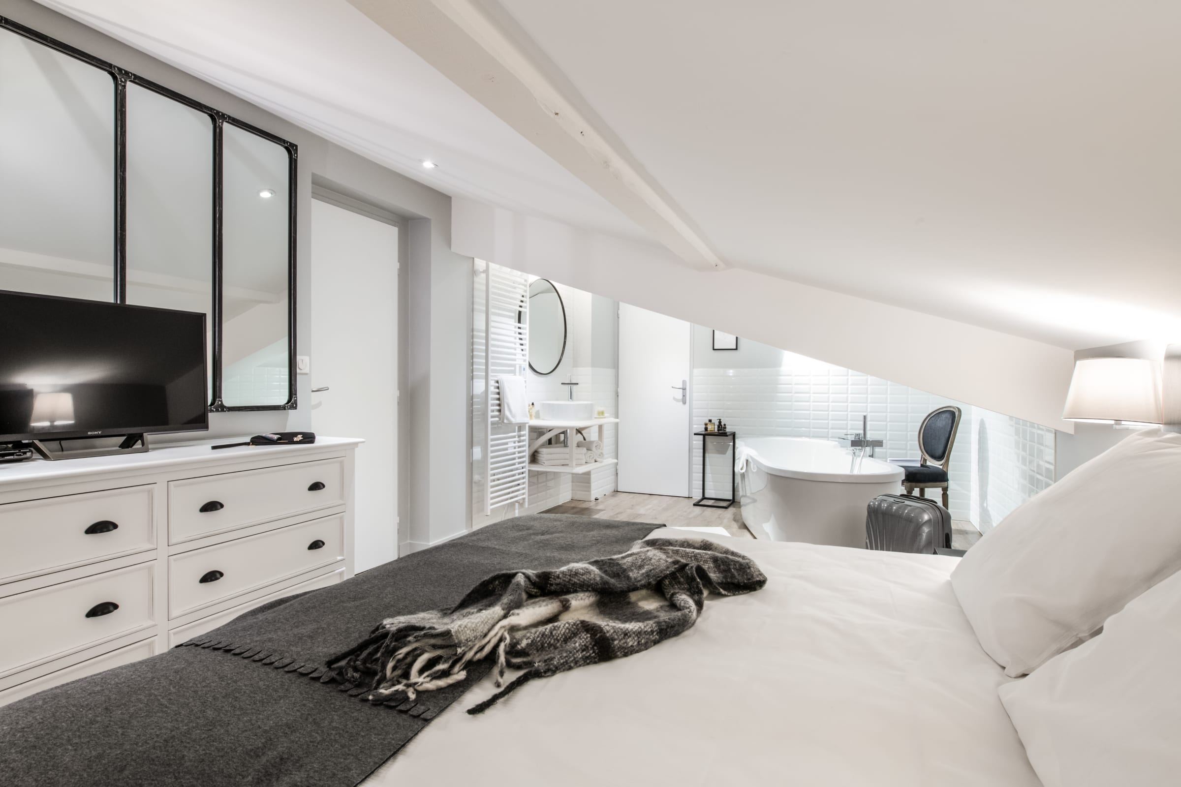 • Roof slope suite east facing, queen-size bed 180 x 200 cm with two separated 90 x 180 cm beds can be put together or not. Flat screen TV, private ensuite bathroom, private toilets.