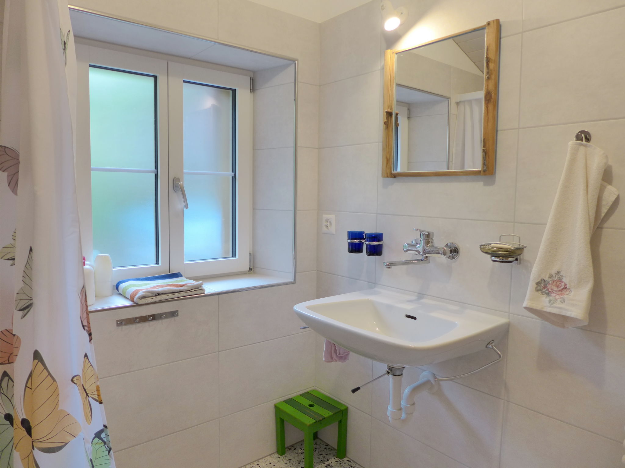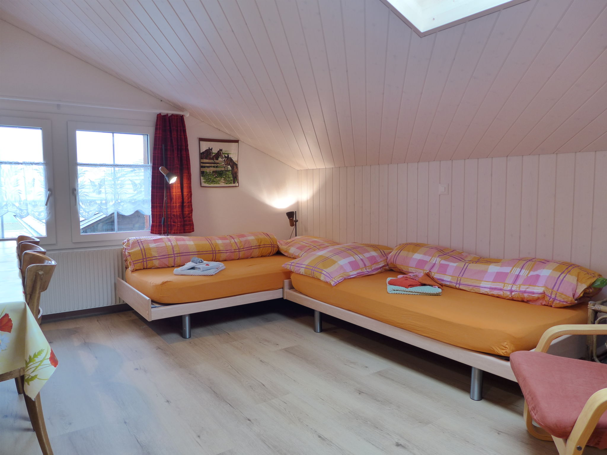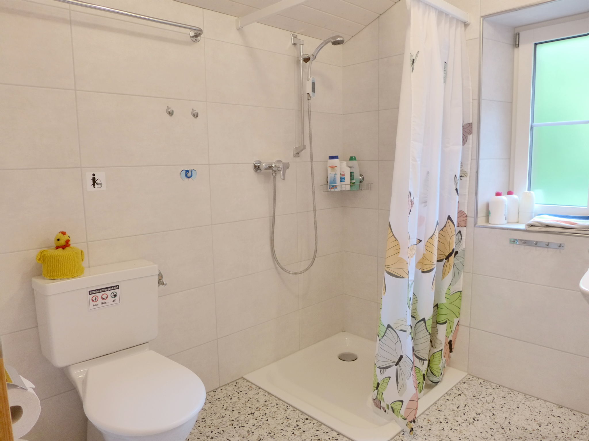"Beim Thor Klein", 2-room apartment 40 m2, on the upper floor. Spacious and bright, simple and cosy furnishings: open large living/sleeping room with 2 beds (90 cm, length 200 cm), dining table, flat screen, radio, hi-fi system and DVD. 1 room with 1 x 2 bunk beds (90 cm, length 200 cm). Open kitchen (oven, dishwasher, 3 ceramic glass hob hotplates, toaster, kettle, microwave, electric coffee machine, Capsules for coffee machine (Delizio) extra, raclette grill, fondue Set (cheese)). Shower/WC. Small terrace. Balcony furniture. Beautiful view of the mountains and the countryside. Facilities: baby cot for up to 2 year olds (extra), hair dryer. Internet (WiFi, free). Parking (1 car). Please note: non-smokers only. Maximum 1 pet/ dog allowed.
