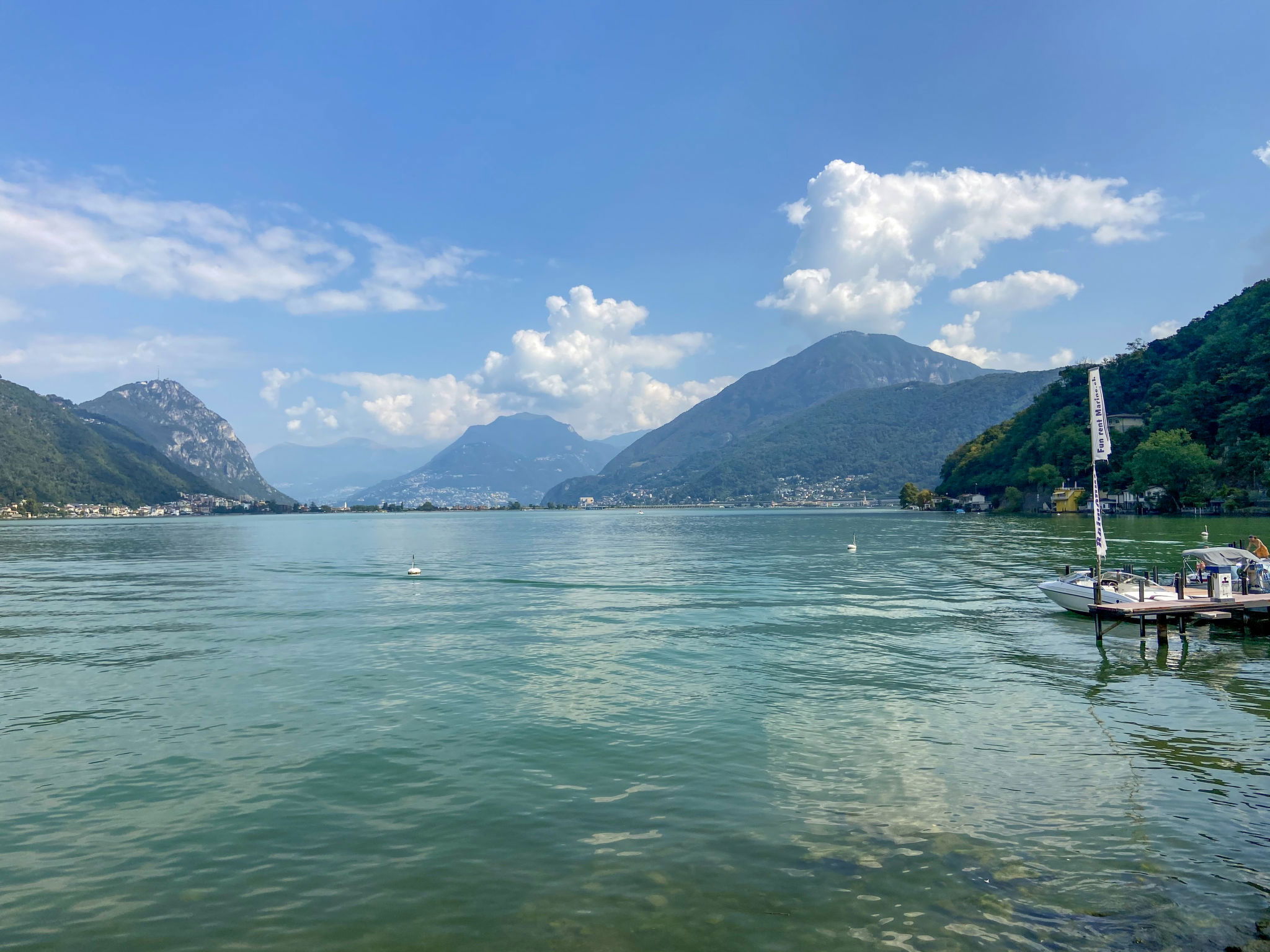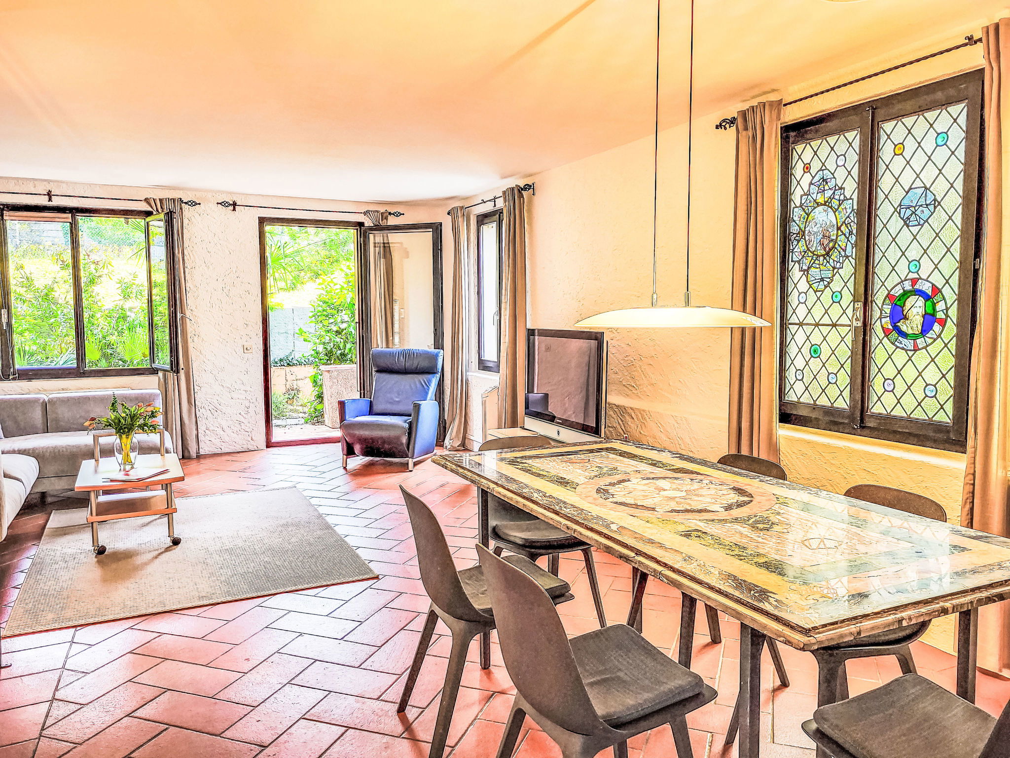 "Fiorita", 3-room apartment 92 m2. Spacious and bright, partly renovated in 2020, comfortable and cosy furnishings: open large living/dining room with dining table and cable TV (flat screen), radio. Exit to the terrace, to the patio. 1 double bedroom with 1 double bed (2 x 90 cm, length 200 cm). Exit to the balcony. 1 room with 2 beds (90 cm, length 200 cm). Exit to the balcony. Open kitchen (4 hot plates, oven, dishwasher, toaster, kettle, electric coffee machine, Capsules for coffee machine (Nespresso) extra) with hatch. Bathroom, sep. WC, double hand-basin. Terrace partly roofed, small garden. Terrace furniture, barbecue, sitting area. Partial view of the lake, the mountains and the countryside. Facilities: washing machine, iron, children's high chair, baby cot for up to 2 year olds (extra), hair dryer. Internet (WiFi, free). Parking at the house. Please note: non-smokers only. Maximum 2 pets/ dogs allowed. Fire blanket! There is a parking space in front of the double garage for the apartment. By crossing the Seestrasse you have direct access to the lake! NL-00004332