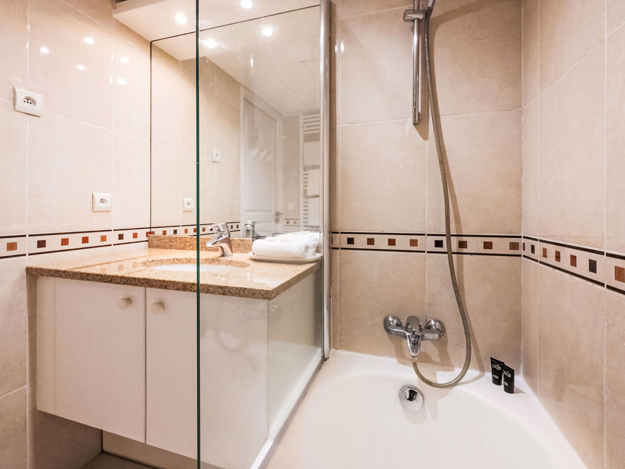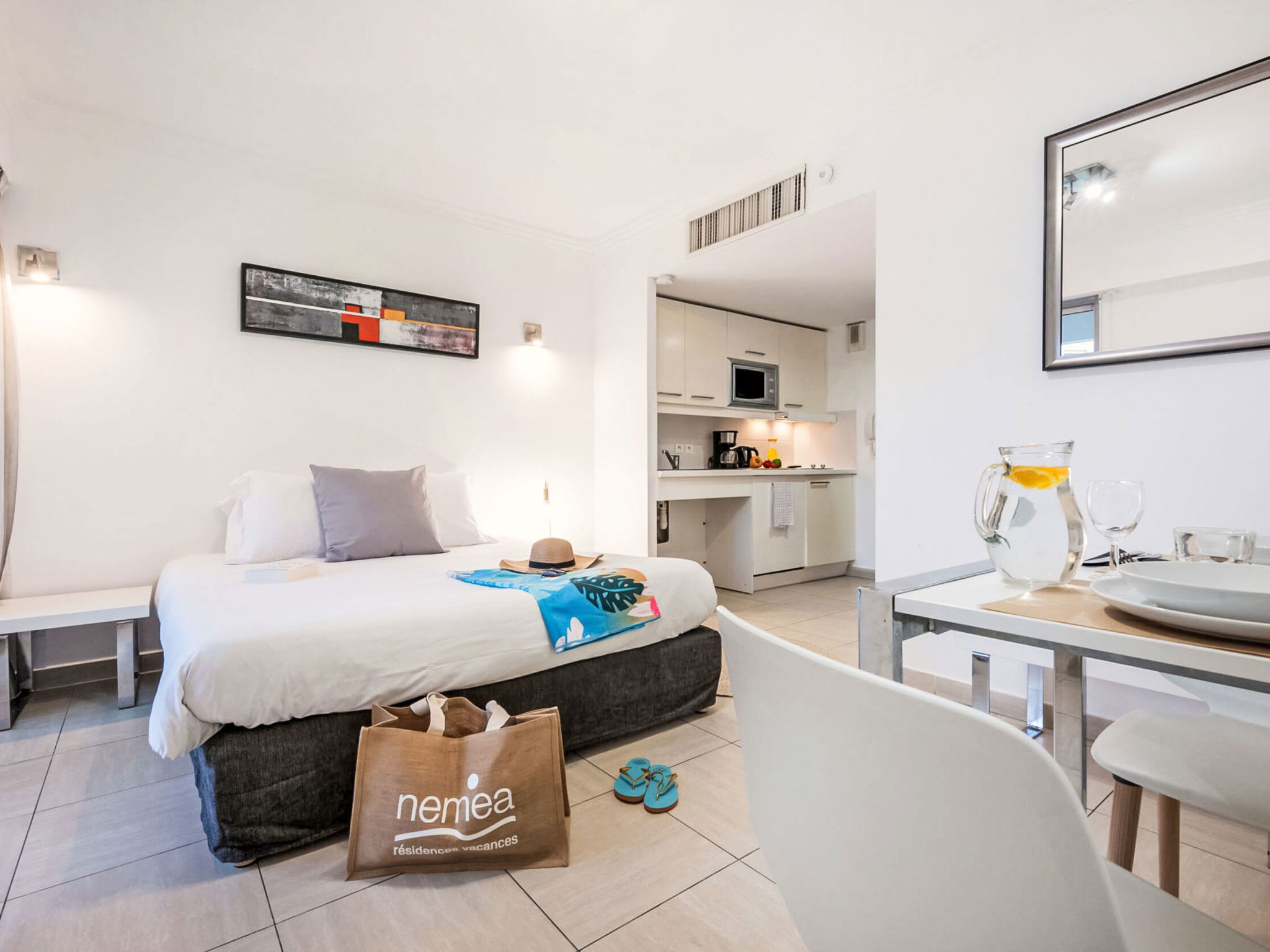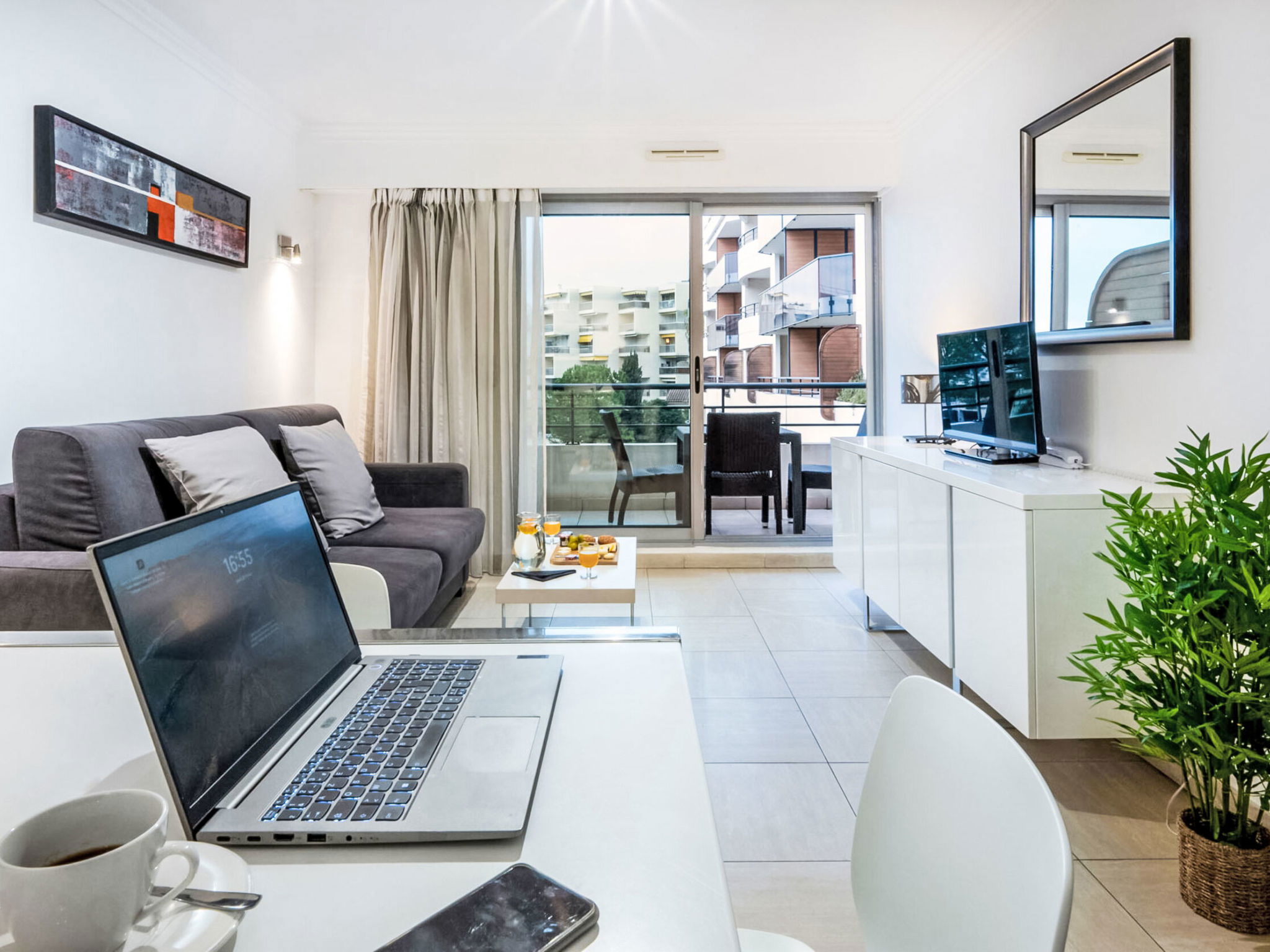 "Le Lido", 1-room apartment 28 m2. Bright, modern furnishings: living/sleeping room with 1 french bed (160 cm), dining table and TV. Kitchenette (dishwasher, 2 ceramic glass hob hotplates, toaster, kettle, microwave, electric coffee machine). Bath/WC. Heating, air-conditioning. Balcony or terrace. Terrace furniture, balcony furniture. Facilities: Internet (WiFi, extra). Please note: non-smokers only. Maximum 1 pet/ dog allowed. Smoke alarm, fire extinguisher. The property is one of a type of property or apartment.