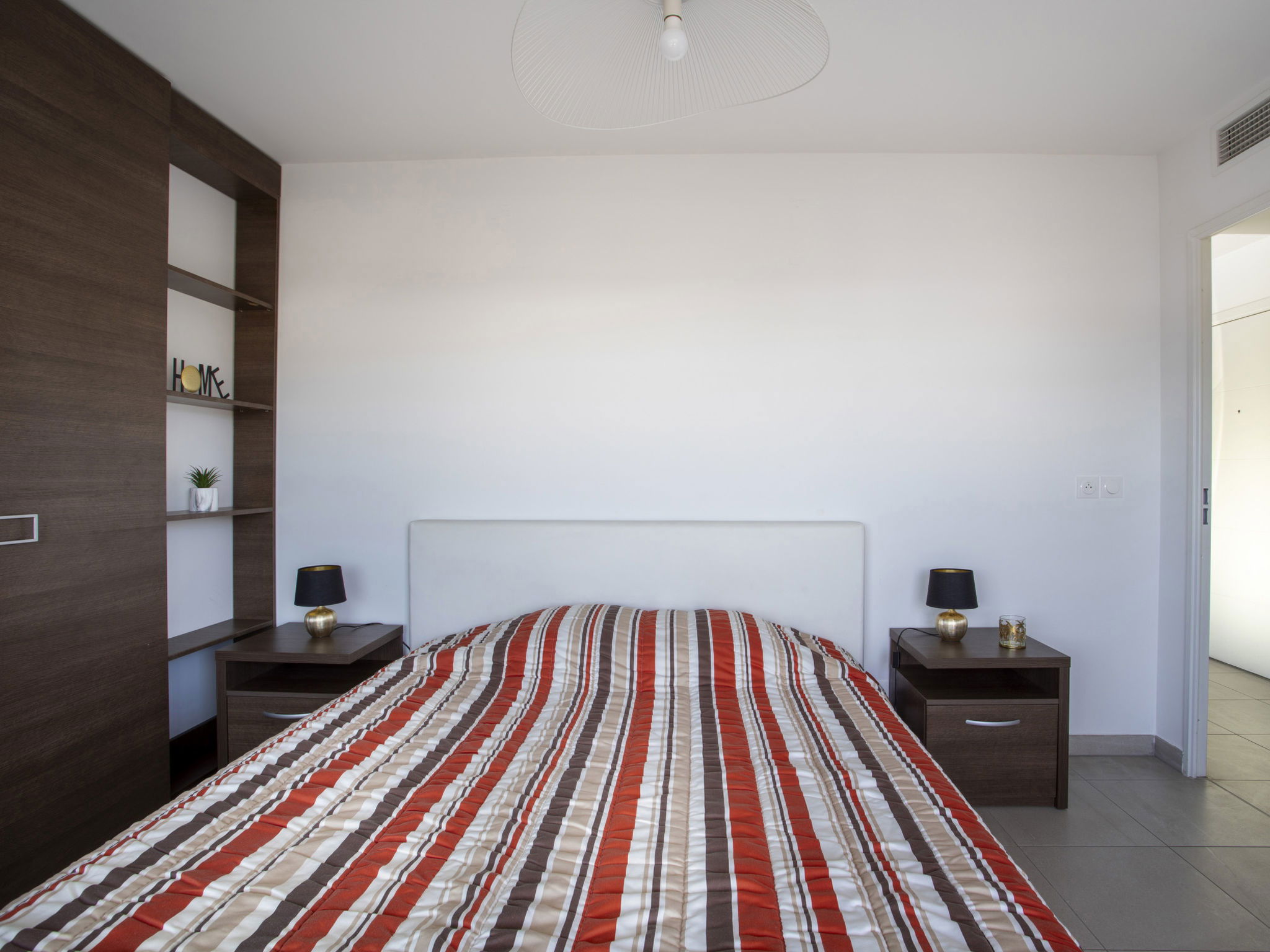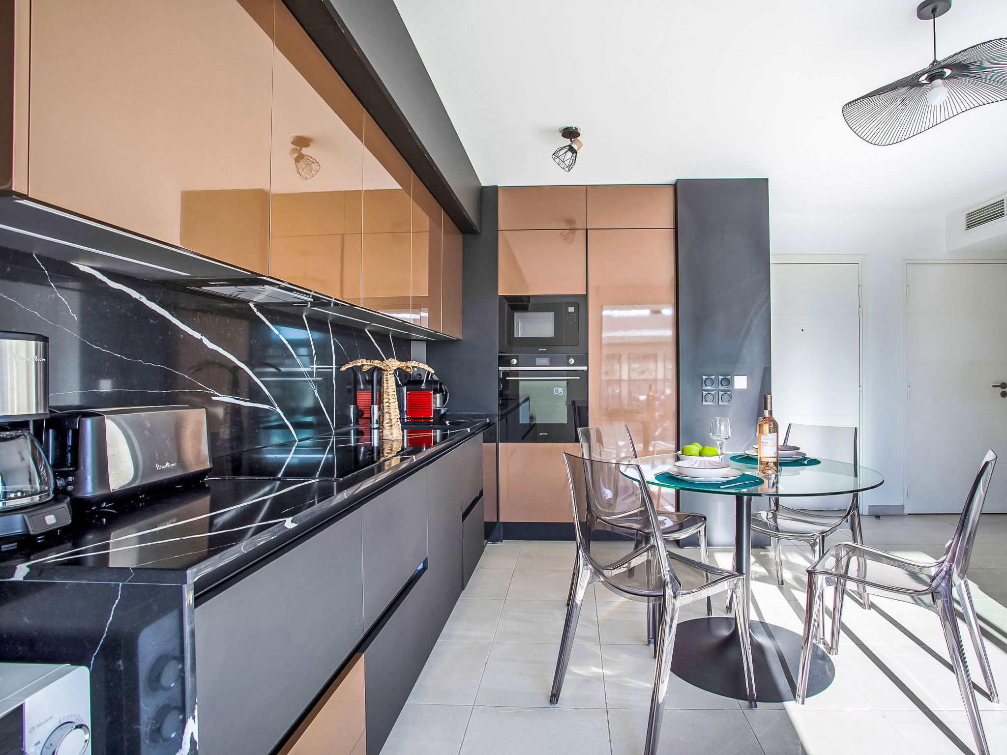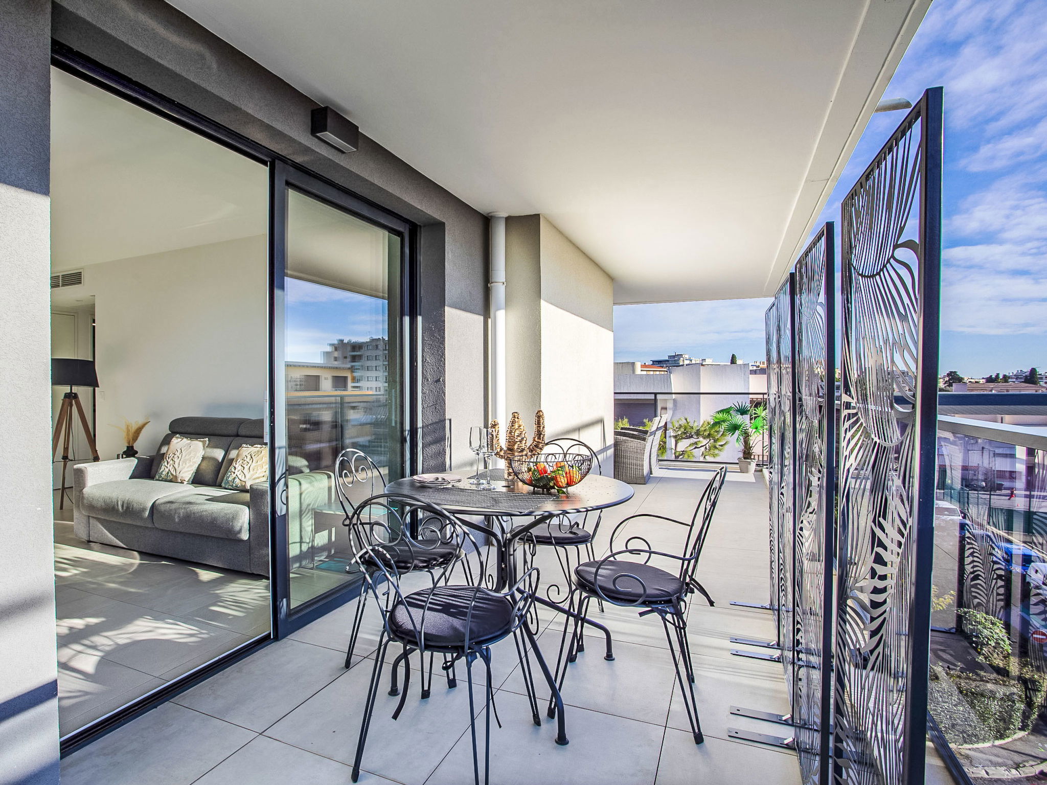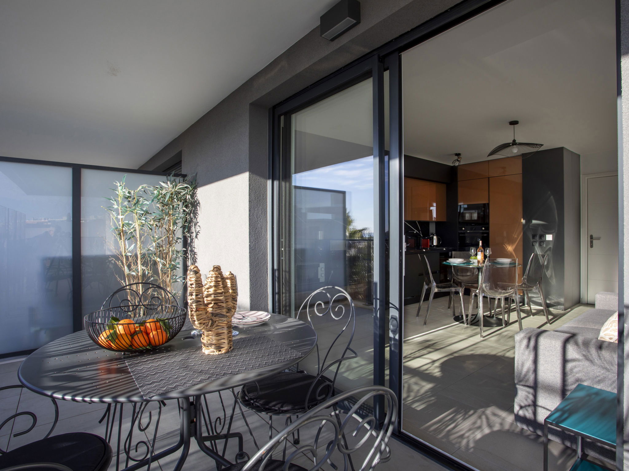 "Le Grey Pearl", 2-room apartment 40 m2 on 3rd floor. Bright, comfortable and beautiful furnishings: living/dining room with TV (flat screen). Exit to the terrace. 1 large room 12 m2 with 1 french bed (160 cm, length 200 cm). Exit to the terrace. Open kitchen (oven, dishwasher, 4 induction hot plates, toaster, kettle, microwave, freezer, electric coffee machine, Capsules for coffee machine (Nespresso) extra). Exit to the terrace. Shower, sep. WC. Heating, electric heating, air-conditioning. Large terrace 28 m2, east facing position and south facing position. Terrace furniture, deck chairs. View of the resort. Facilities: washing machine, iron, hair dryer. Internet (WiFi, free). Garage space n 207 NIVEAU -2 (2 cars). Please note: maximum 1 pet/ dog allowed. Smoke alarm. 06027017706AK