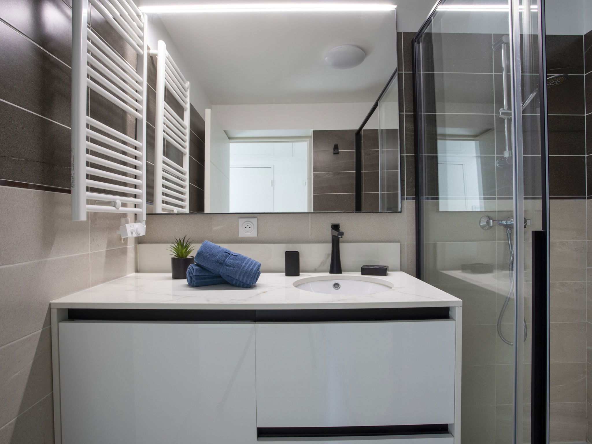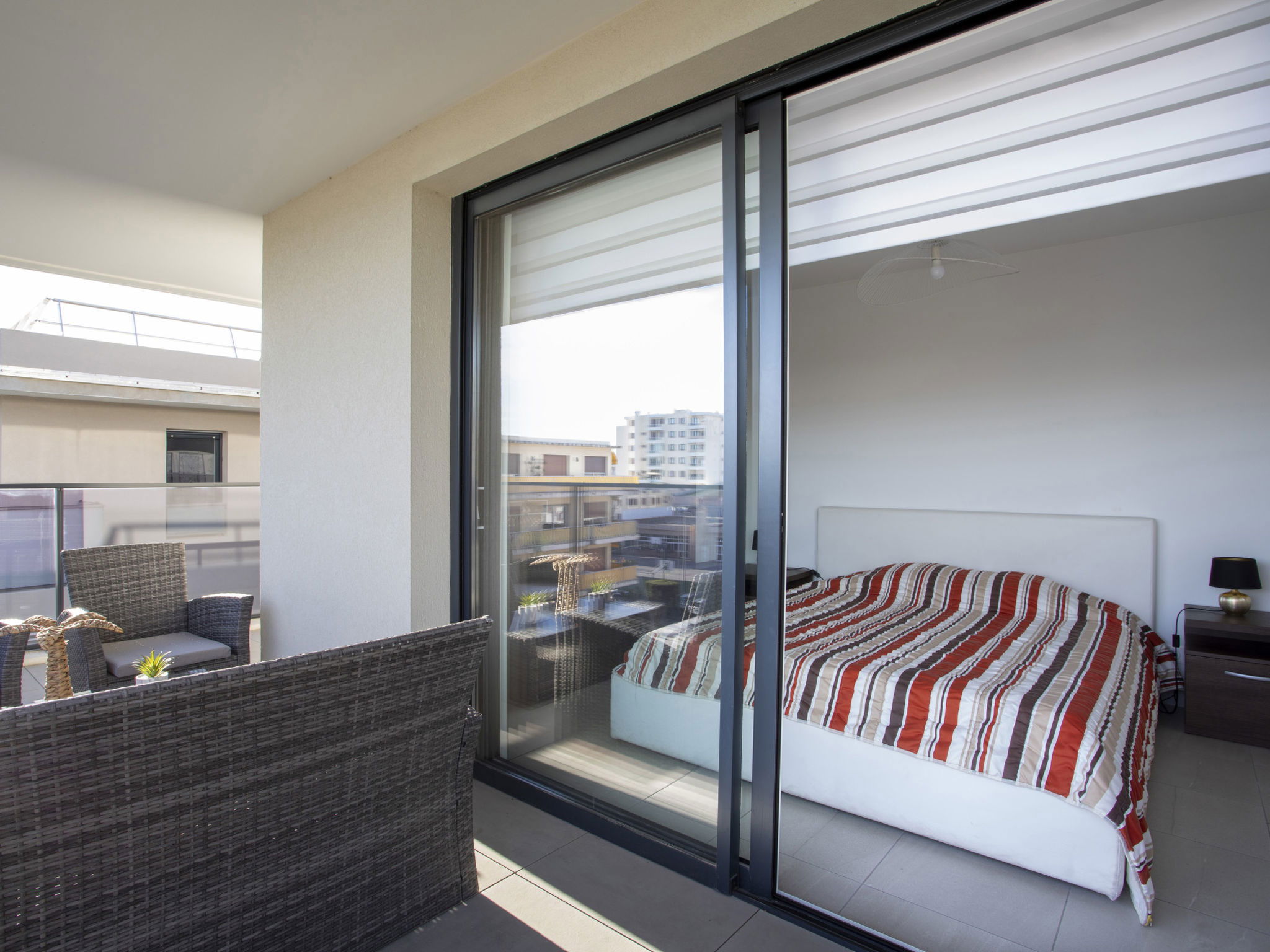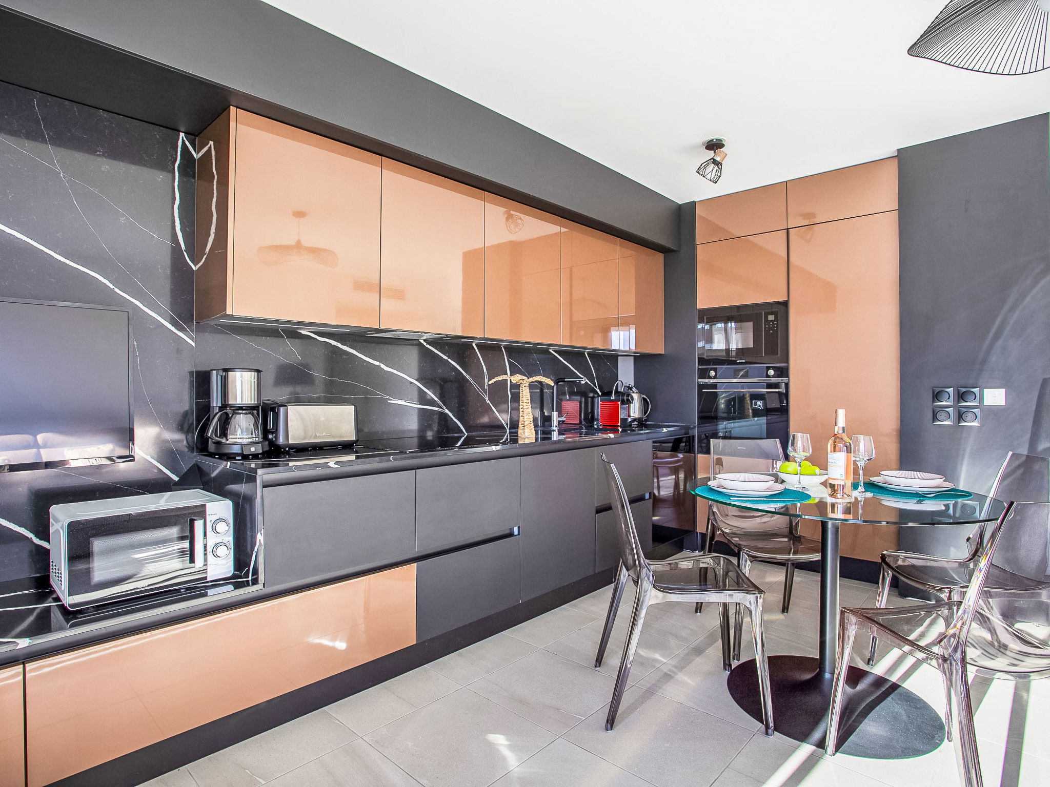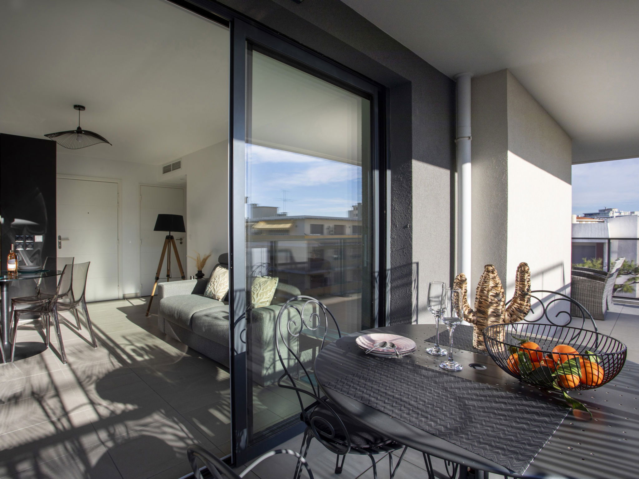 "Le Grey Pearl", 2-room apartment 40 m2 on 3rd floor. Bright, comfortable and beautiful furnishings: living/dining room with TV (flat screen). Exit to the terrace. 1 large room 12 m2 with 1 french bed (160 cm, length 200 cm). Exit to the terrace. Open kitchen (oven, dishwasher, 4 induction hot plates, toaster, kettle, microwave, freezer, electric coffee machine, Capsules for coffee machine (Nespresso) extra). Exit to the terrace. Shower, sep. WC. Heating, electric heating, air-conditioning. Large terrace 28 m2, east facing position and south facing position. Terrace furniture, deck chairs. View of the resort. Facilities: washing machine, iron, hair dryer. Internet (WiFi, free). Garage space n 207 NIVEAU -2 (2 cars). Please note: maximum 1 pet/ dog allowed. Smoke alarm. 06027017706AK