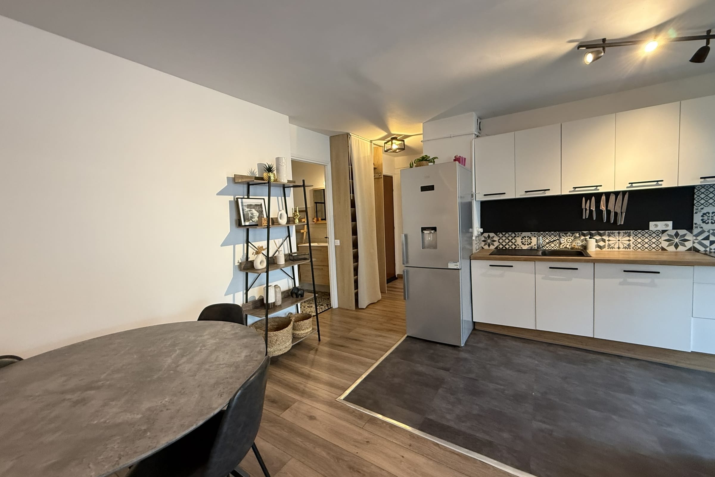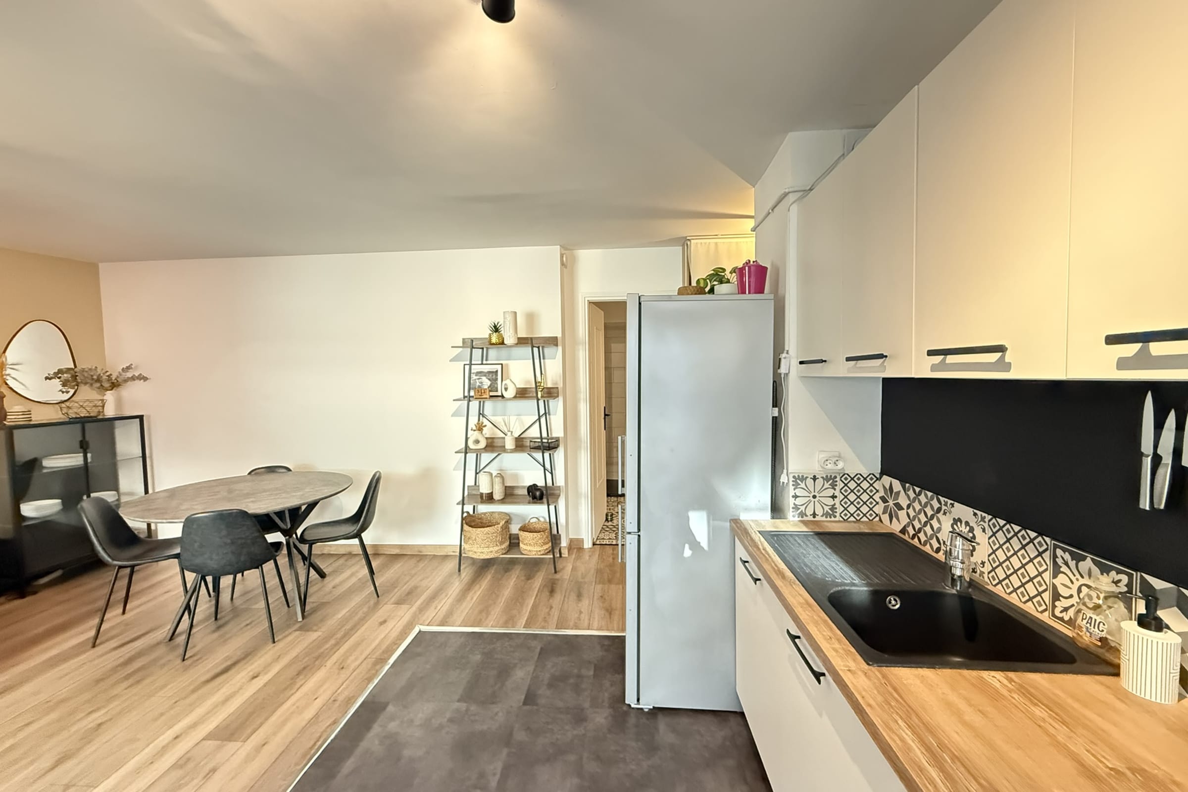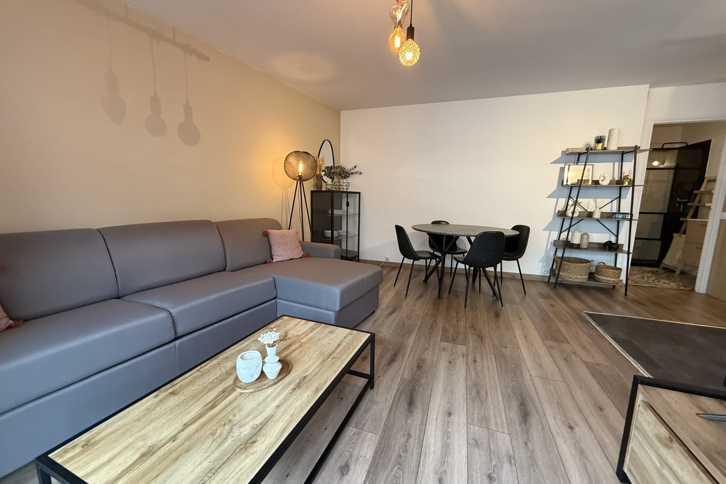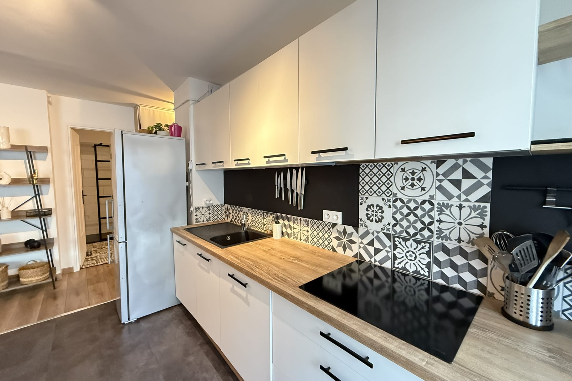 The bedroom offers a comfortable queen-size bed for restful nights, while the living room has a sofa that converts into a real bed, perfect for entertaining family or colleagues. The open-plan, fully equipped kitchen (dishwasher, Nespresso coffee machine, oven, microwave, etc.) blends harmoniously into the living space and invites you to share good times, whether over morning coffee or dinner after a busy day.