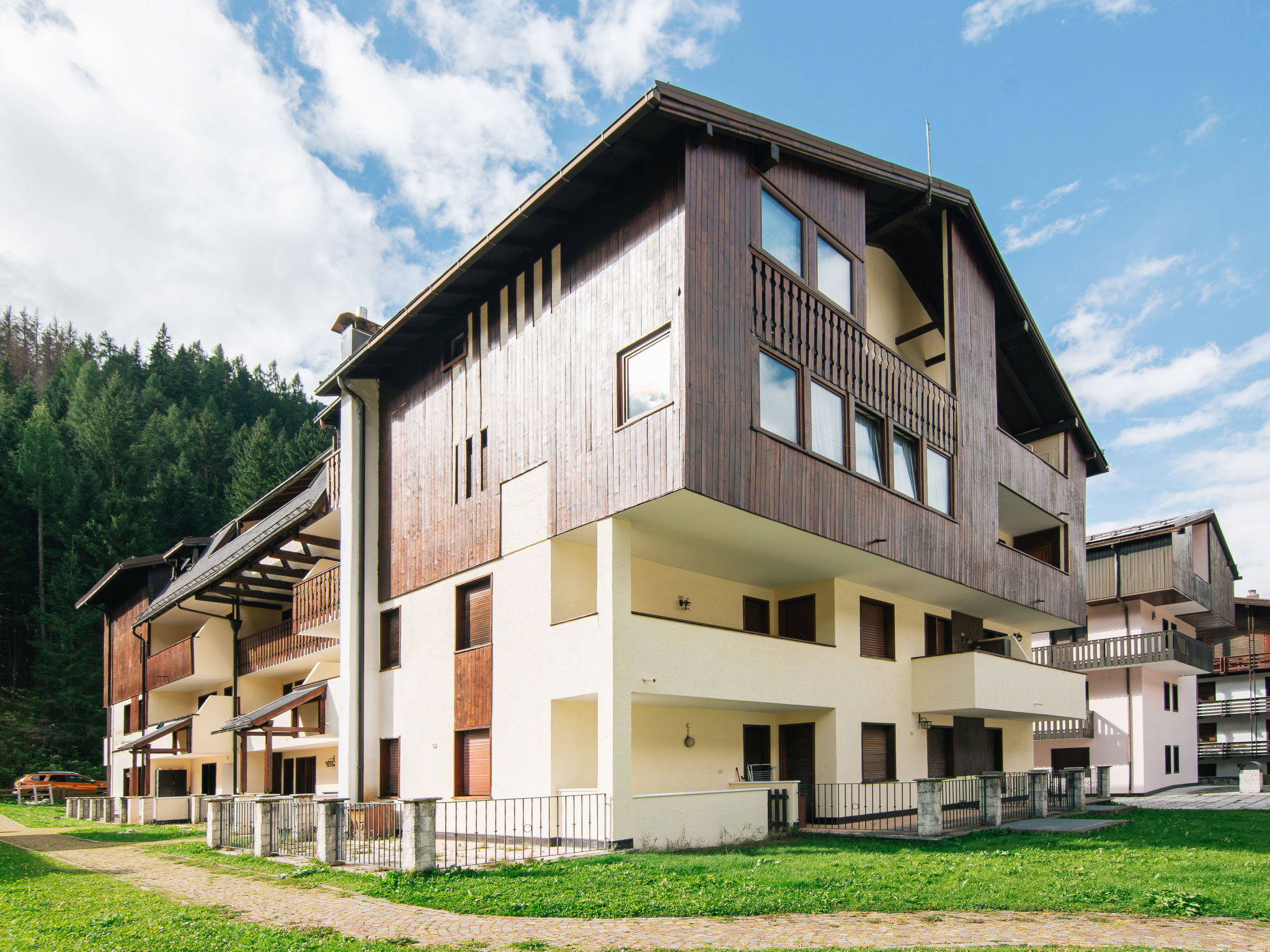 Beautiful, comfortable residence "Des Alpes". 3 houses in the residence. In the resort Campitello, 400 m from the centre of Canazei, in a quiet position, along the wooded area, 600 m from the skiing area, in a cul-de-sac. In the house: central heating system, heating available only from 01.Dec. - 01.May.. In Winter: please take snow chains. Parking at the house, public parking on the road. Shop, supermarket, restaurant, bar, café 400 m, bus stop "ski bus" 350 m. Gondola lift 900 m, ski rental 600 m, cross country ski track 150 m. Nearby attractions: Sella Ronda 1 km, Bolzano 51 km, Passo Sella 14 km, Passo Pordoi 13 km. Well-known ski regions can easily be reached: Cabinovia Belvedere 1 km, Funivia Col Rodella 3 km, Funivia Doleda 3 km. Well-known lakes can easily be reached: Lago di Carezza 24 km, Lago di Fedaia 14 km. Please note: no lift. Additional accommodations can be booked.