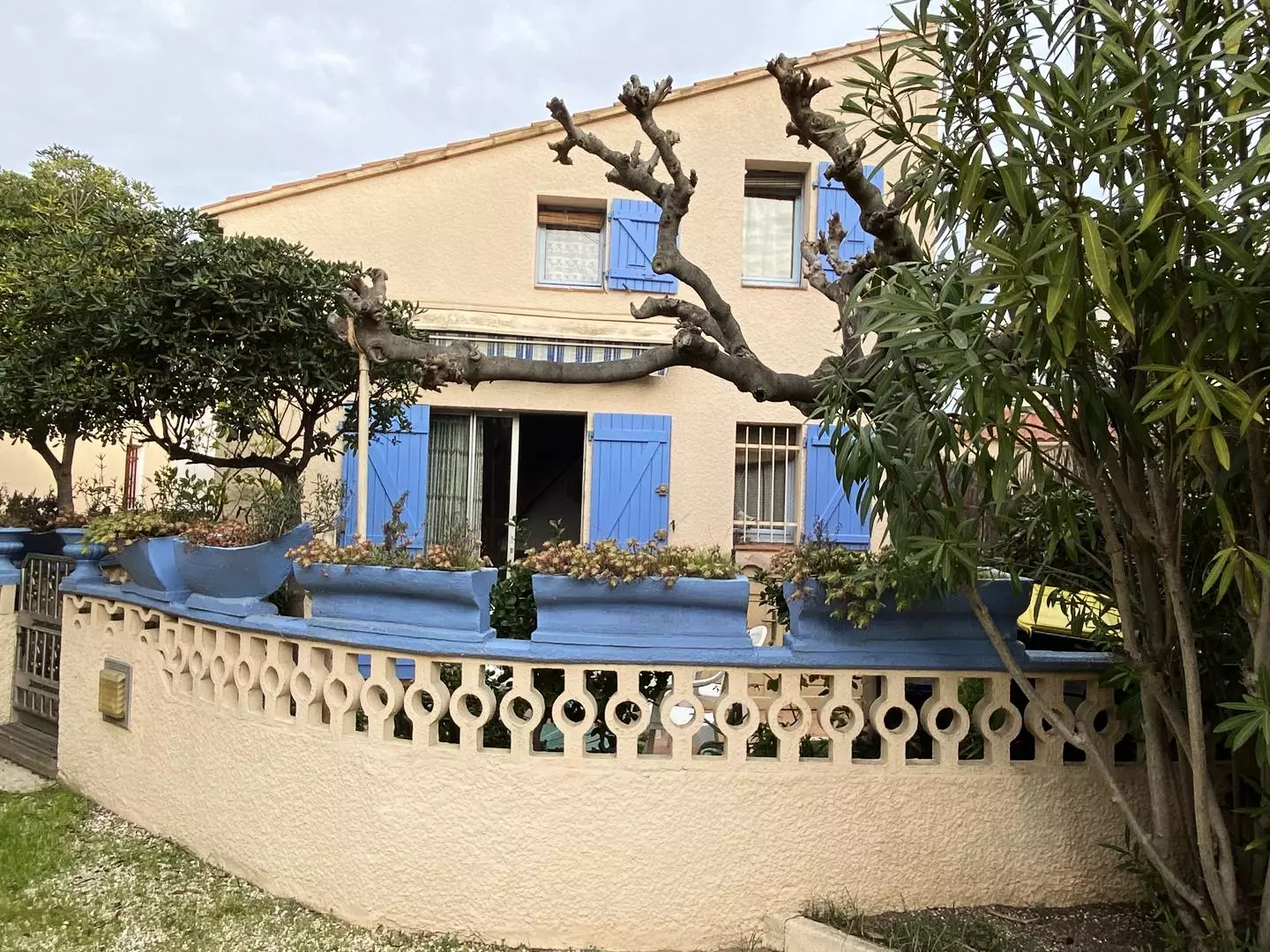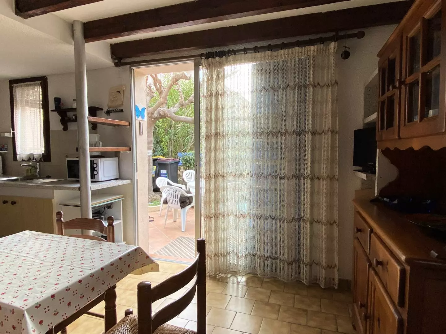 The villa features a 25 m² tree-lined terrace equipped with garden furniture and sun loungers. All rooms face south, providing ample natural light.
