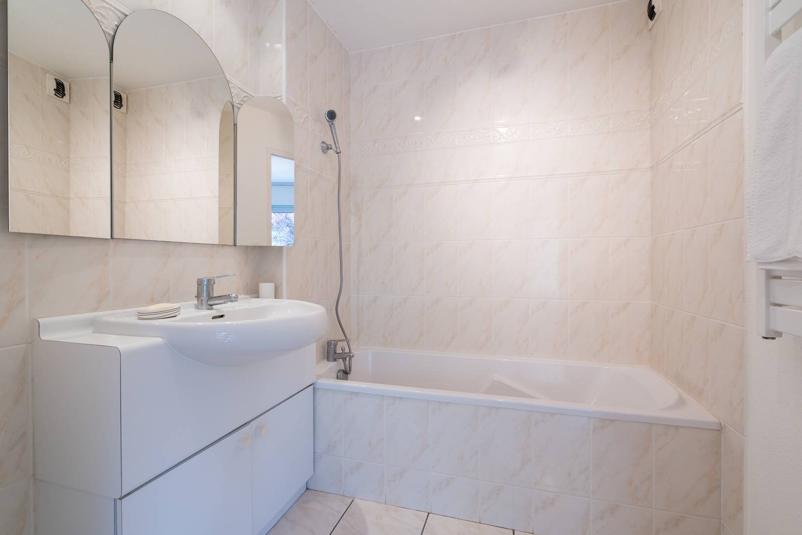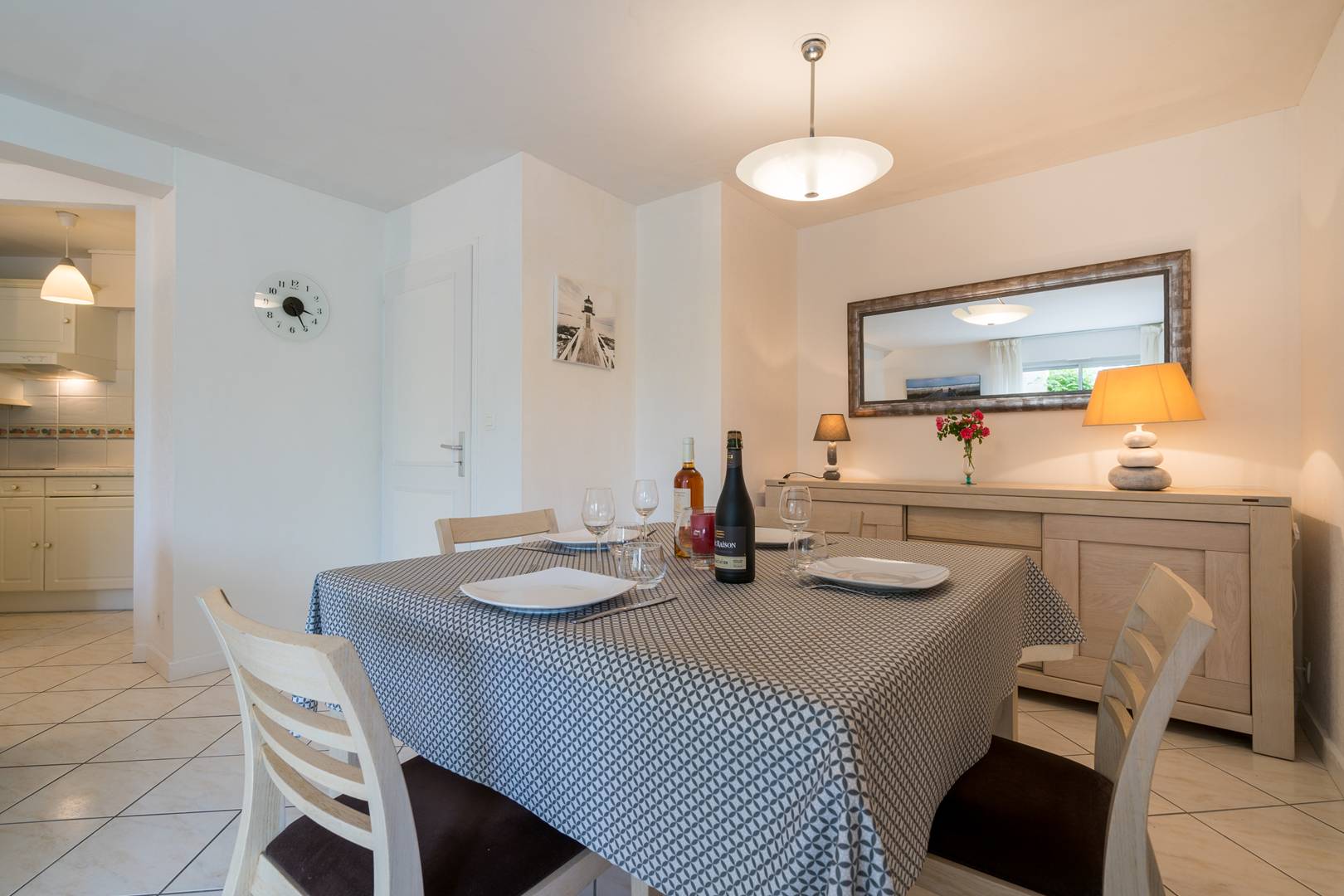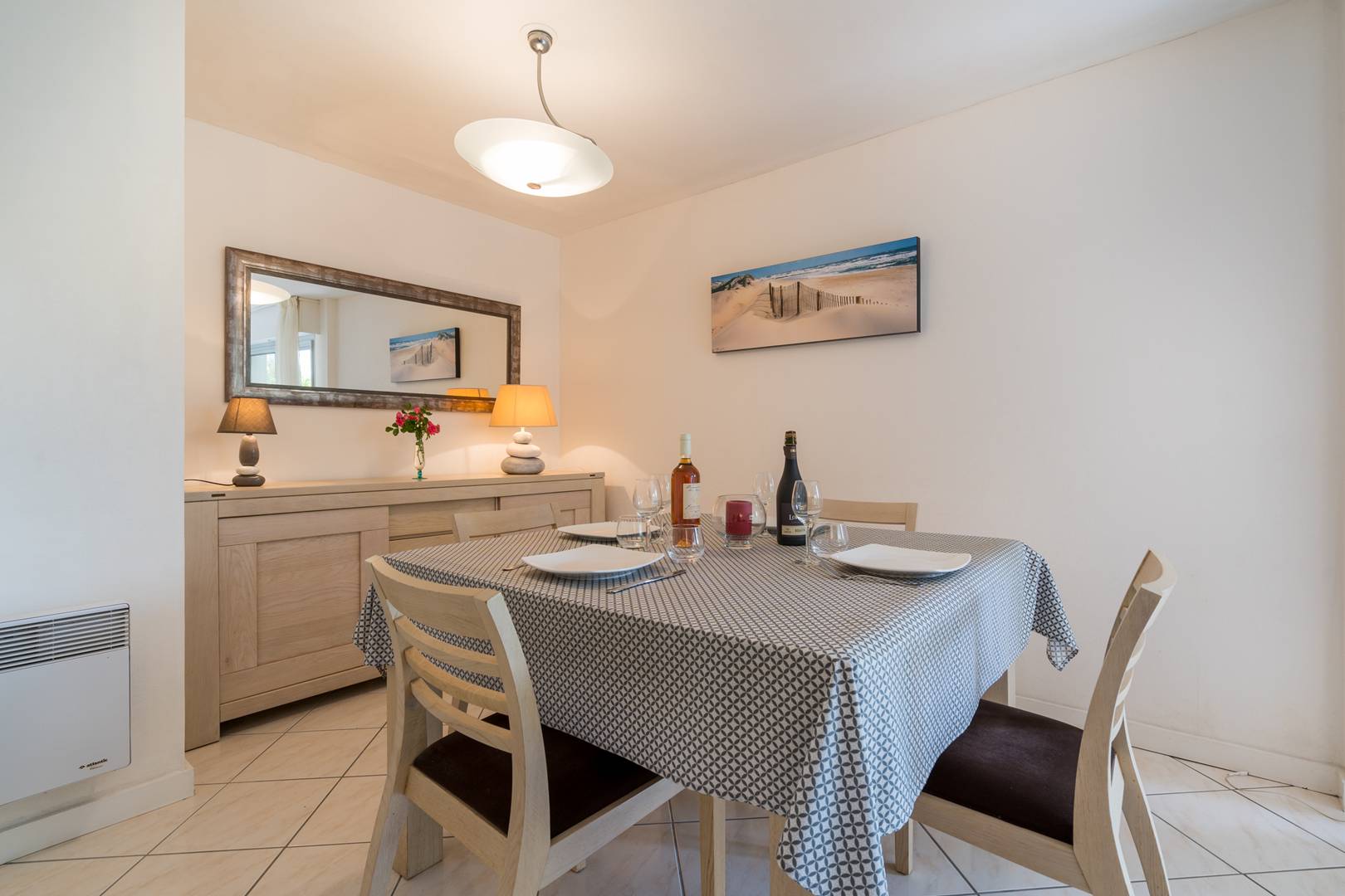 - Open-plan and equipped kitchen (4-ring induction hob, combined oven and microwave, fridge-freezer, dishwasher)