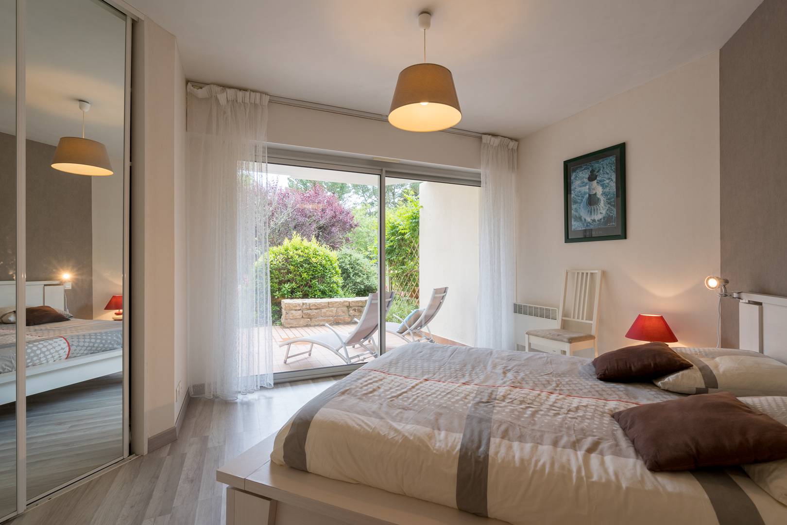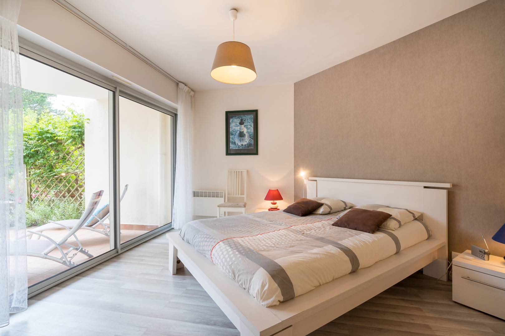 - 1 master suite with 1 double bed (140cm, duvet) and en-suite bathroom, opening onto a south-facing terrace