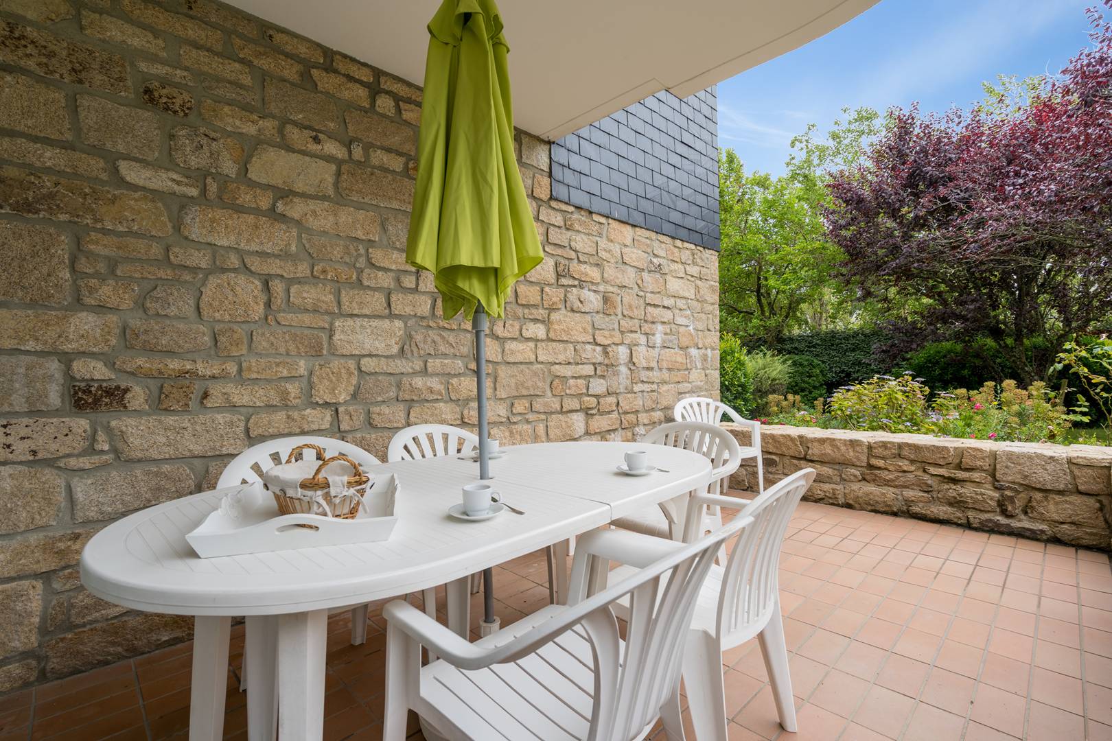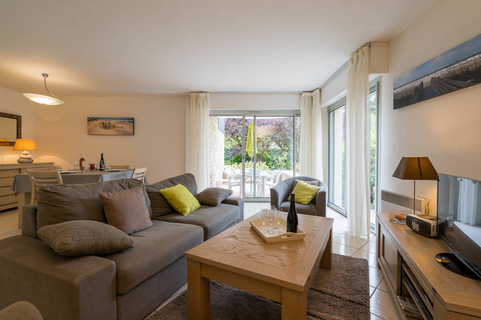 - Spacious living area with dining space (table and chairs) and lounge area (TV, sofa bed: 2-person sleeping, 140, duvet), opening onto two south-facing terraces overlooking the residence’s garden