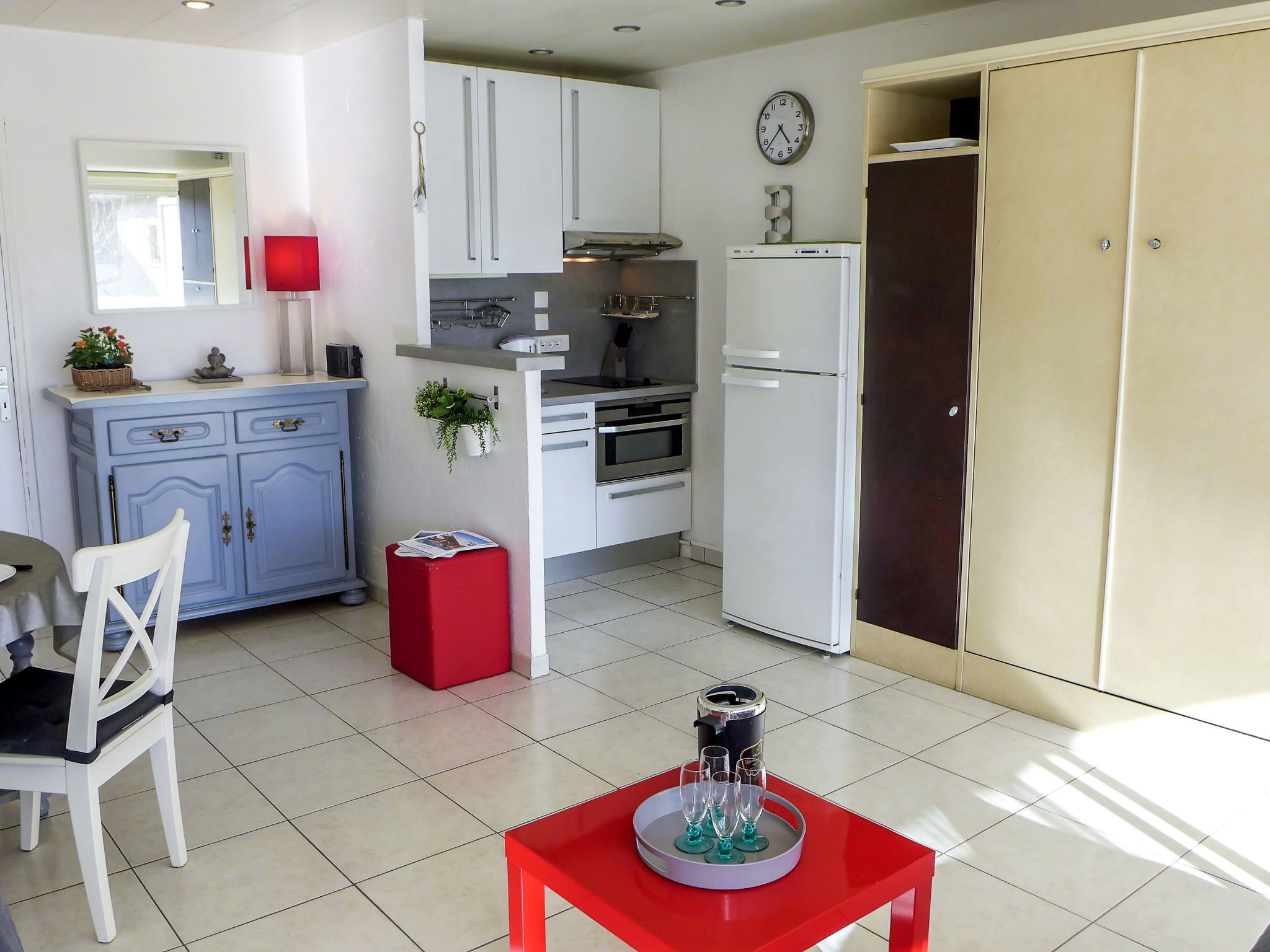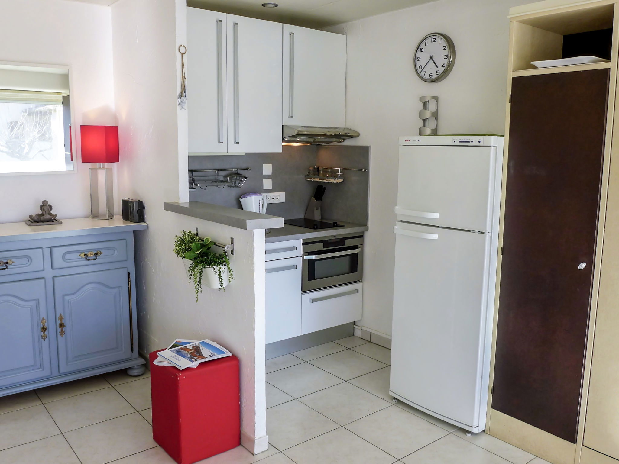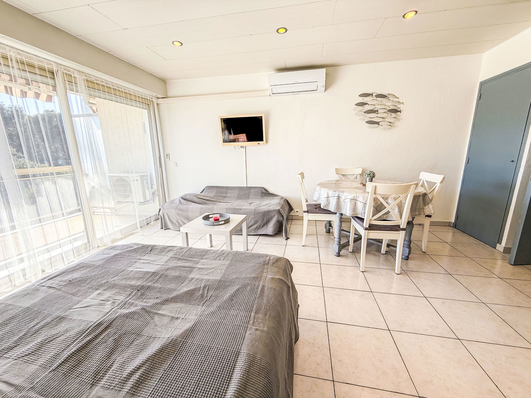 1-room apartment 40 m2 on 1st floor, south facing position. Beautiful furnishings: living/dining room with 1 sofabed (90 cm, length 190 cm), 1 double wall-trunk bed (140 cm, length 190 cm), TV (flat screen). Exit to the terrace. Kitchenette (2 ceramic glass hob hotplates, microwave, electric coffee machine). Shower/WC. Electric heating, air-conditioning. Terrace 12 m2. Terrace furniture. Side view of the sea. Facilities: iron, hair dryer. Internet (WiFi, extra). Parking space n 223 (fenced). Please note: maximum 1 pet/ dog allowed. TV only FR. Smoke alarm.