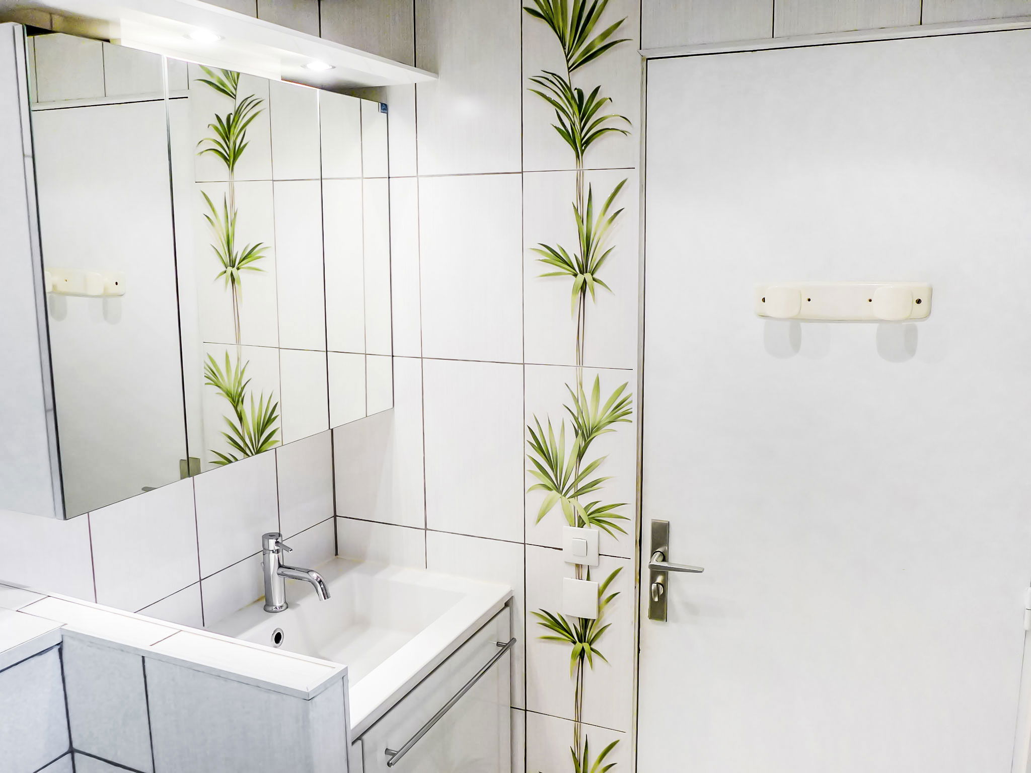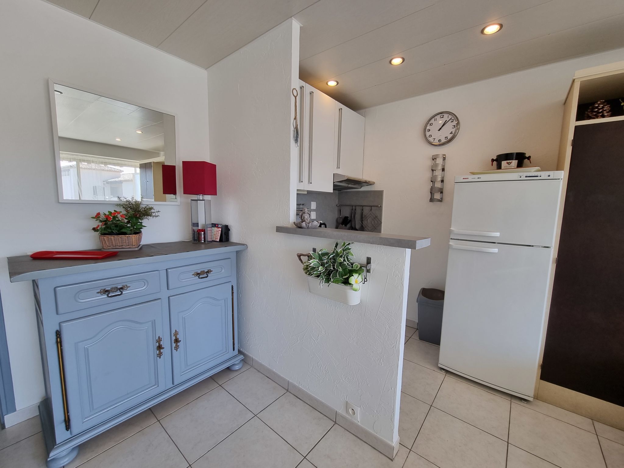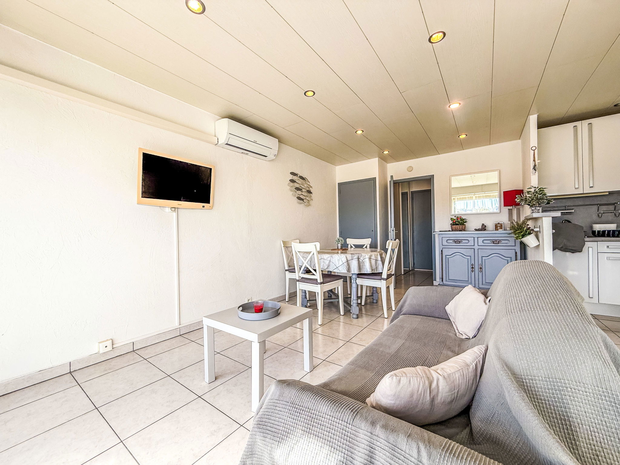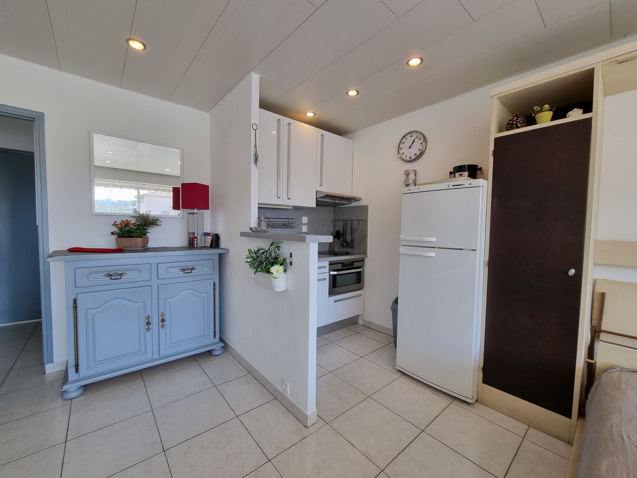 1-room apartment 40 m2 on 1st floor, south facing position. Beautiful furnishings: living/dining room with 1 sofabed (90 cm, length 190 cm), 1 double wall-trunk bed (140 cm, length 190 cm), TV (flat screen). Exit to the terrace. Kitchenette (2 ceramic glass hob hotplates, microwave, electric coffee machine). Shower/WC. Electric heating, air-conditioning. Terrace 12 m2. Terrace furniture. Side view of the sea. Facilities: iron, hair dryer. Internet (WiFi, extra). Parking space n 223 (fenced). Please note: maximum 1 pet/ dog allowed. TV only FR. Smoke alarm.