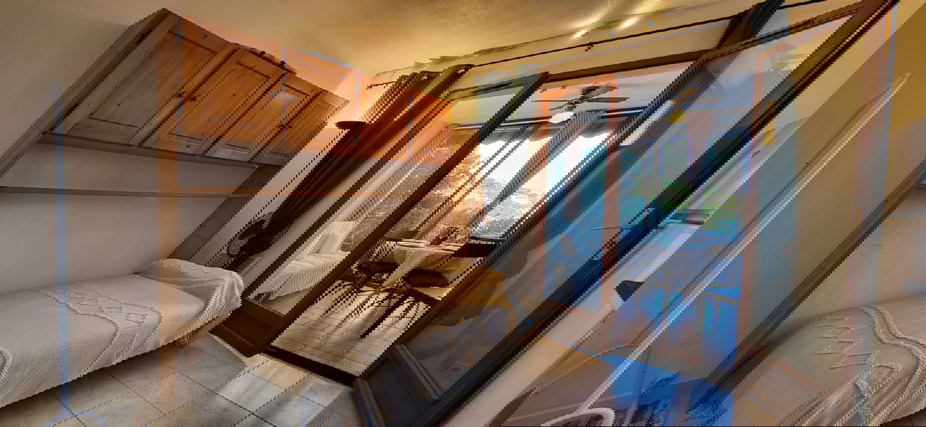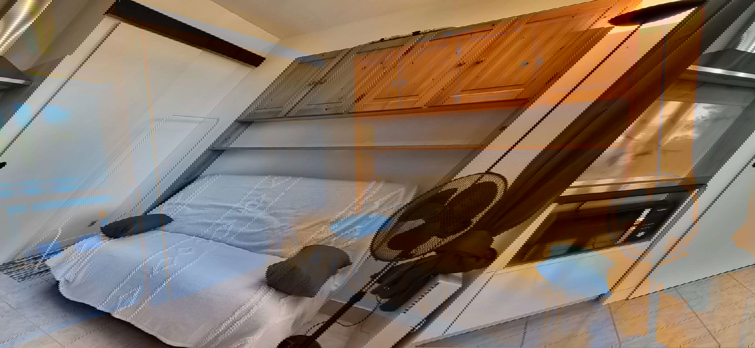 This holiday apartment, which is not air-conditioned but is equipped with fans, consists of a terrace and a furnished loggia with a table, chairs, and television, as well as a sofa bed for two people. There is also a room with a fully equipped kitchen and a second sofa bed for two people, as well as a bathroom with a shower and toilet.