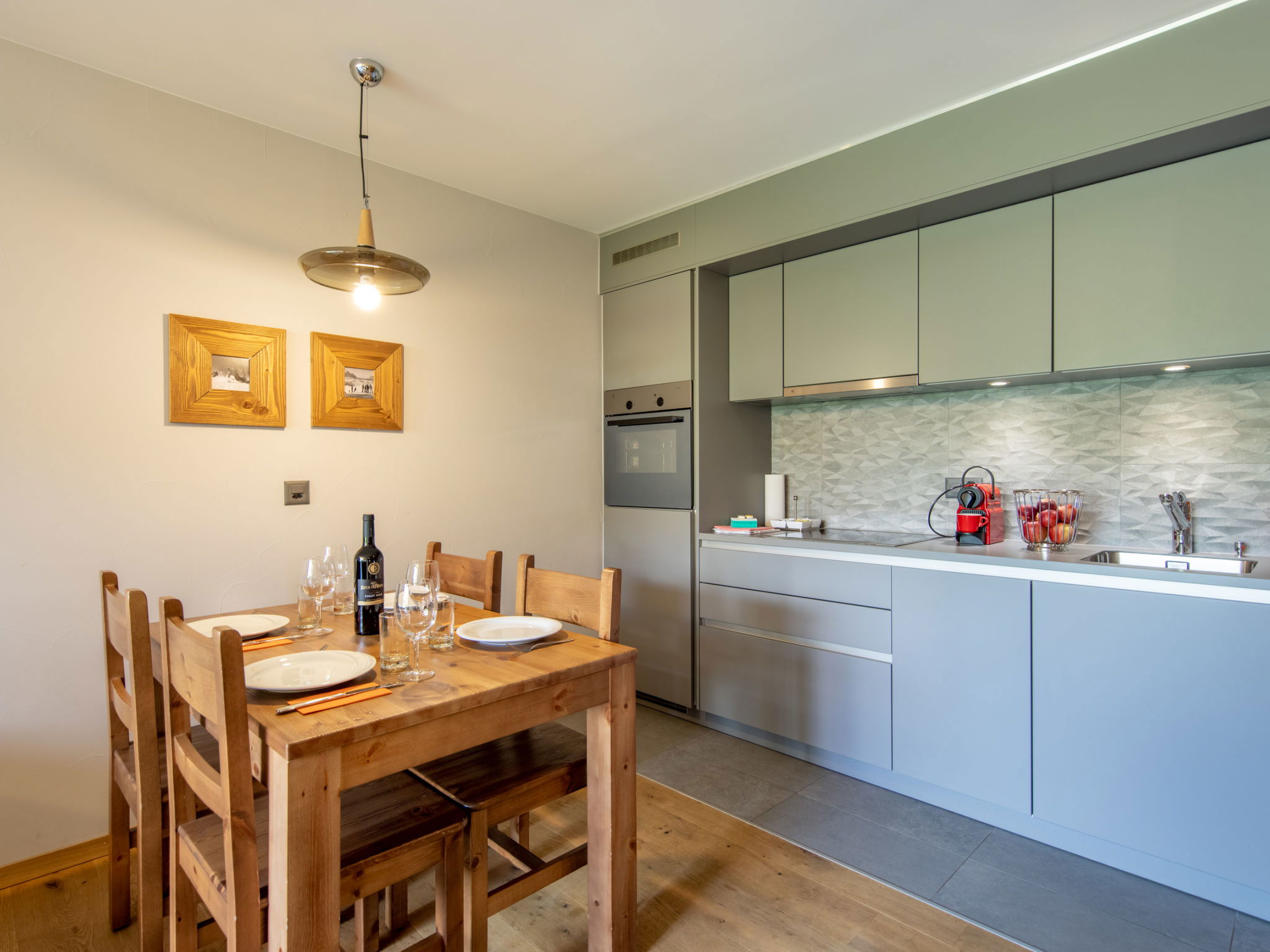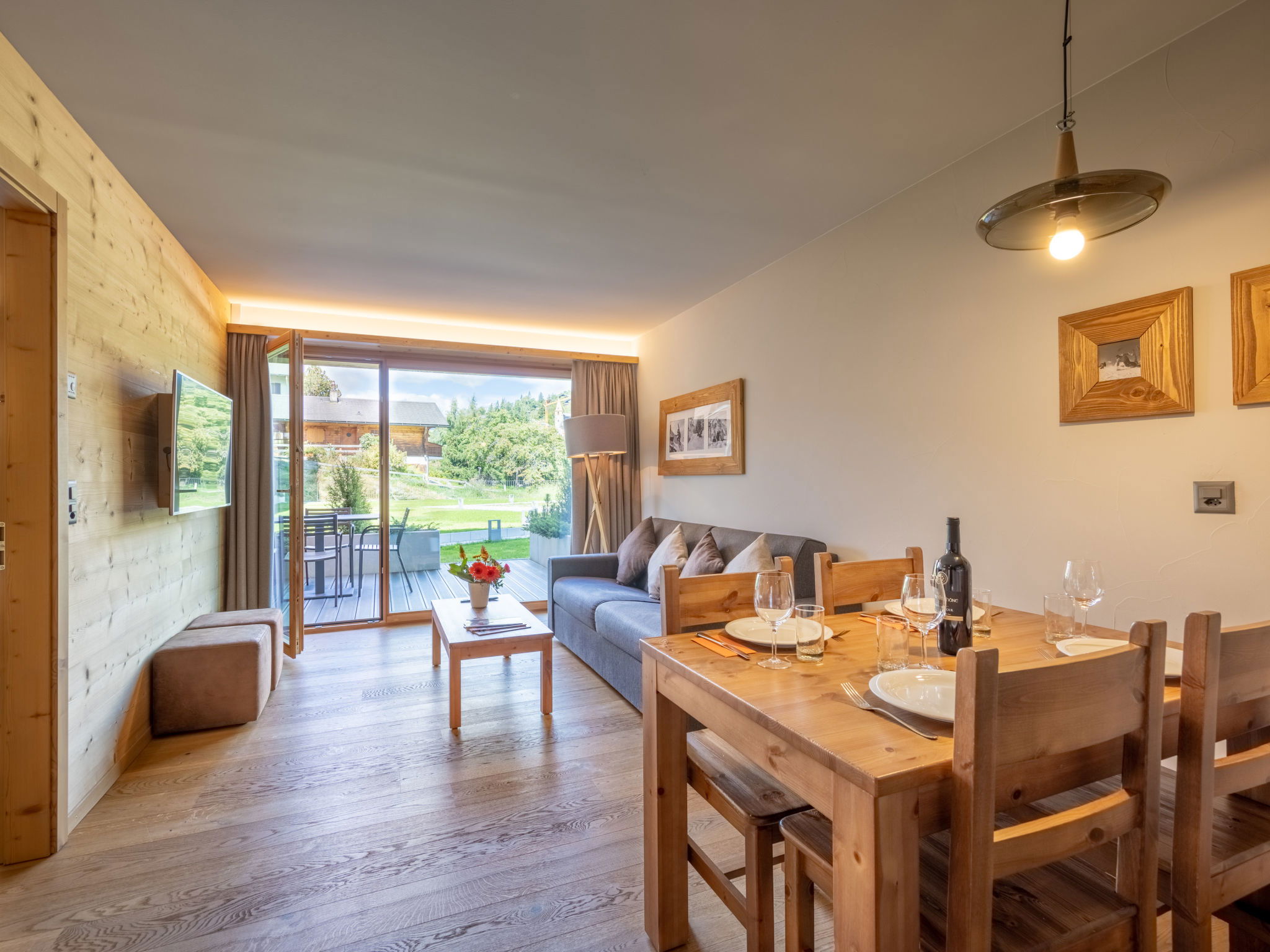 "4 personnes 1 chambre Terrasse ou balcon", 2-room apartment 35 m2. Tasteful and cosy furnishings: living/dining room with 1 double sofabed (160 cm). 1 room with 1 double bed (2 x 90 cm). Open kitchen (oven, dishwasher, 4 ceramic glass hob hotplates, electric coffee machine, Capsules for coffee machine (Nespresso) extra). Shower, sep. WC. Underfloor heating. Parquet floors. Facilities: hair dryer. Internet (WiFi, free). Please note: non-smoking house. Maximum 1 pet/ dog allowed. Smoke alarm. The property is one of a type of property or apartment. A fondue set (meet or cheese) as well as a raclette grill can be borrowed at the reception against a deposit.
