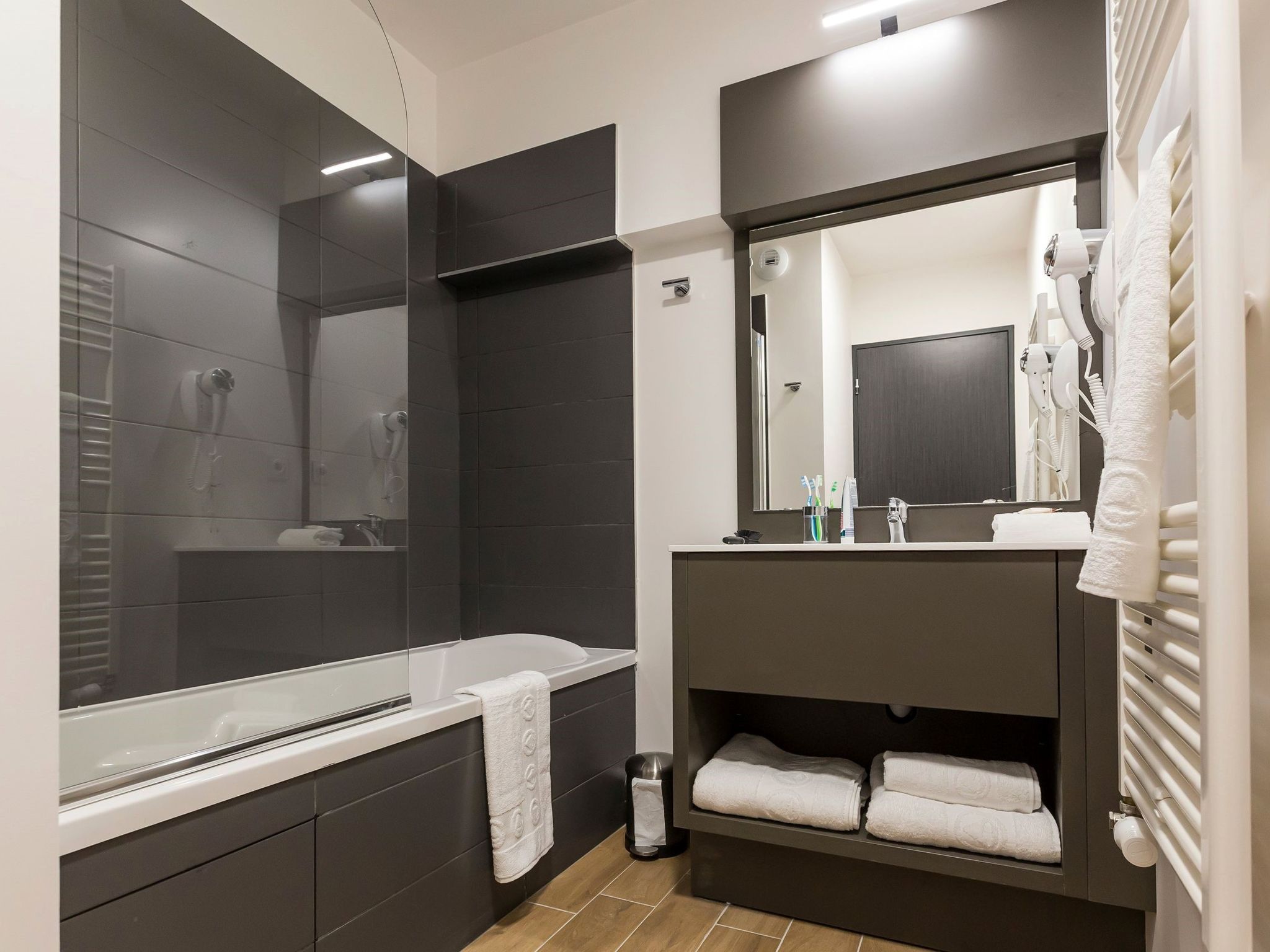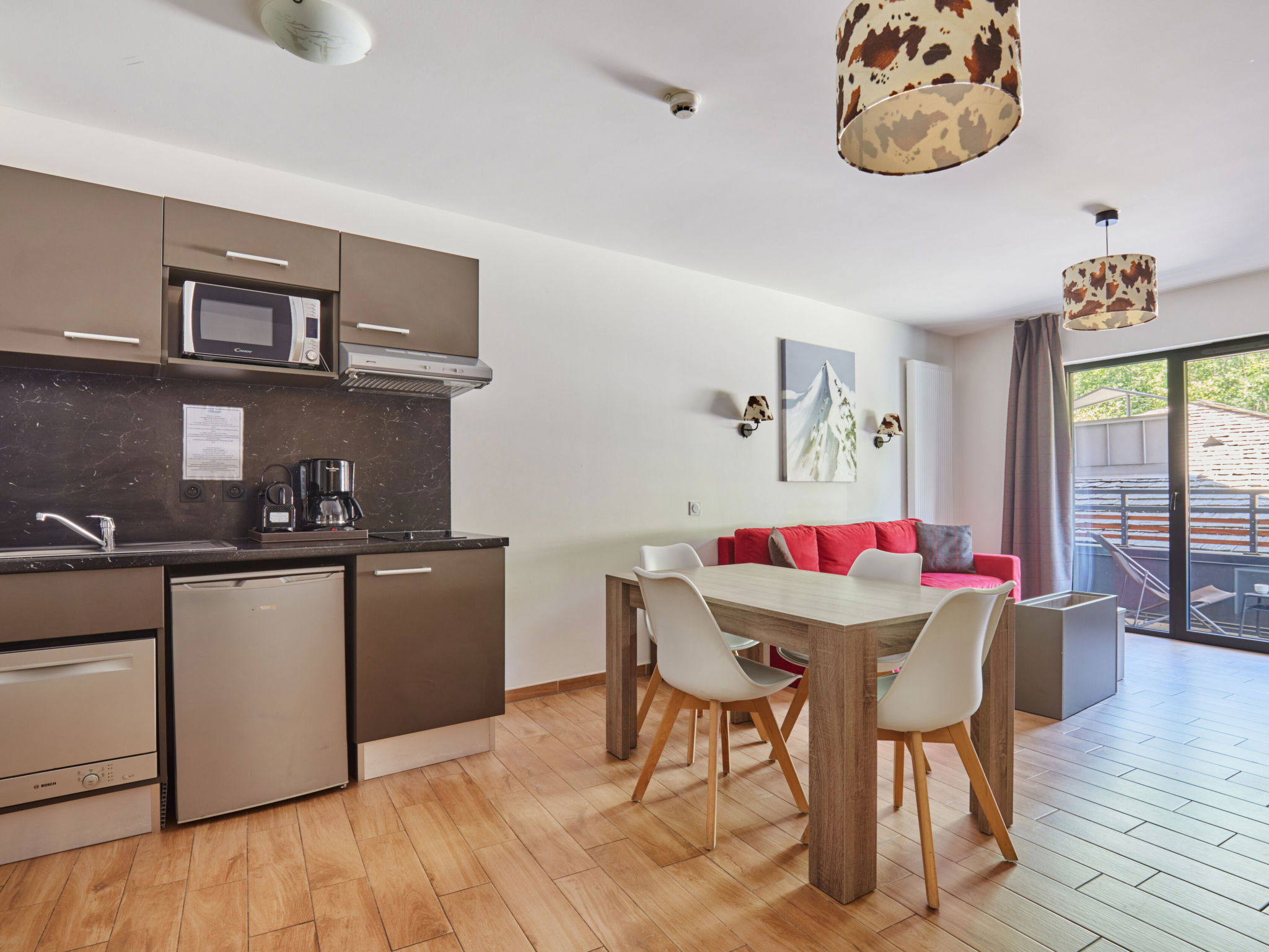 "Résidence Odalys Collection Isatis", 2-room apartment 40 m2. Modern furnishings: living/sleeping room with 1 bed, 2 pull-out beds and TV (flat screen). Exit to the balcony. 1 room with 1 french bed (140 cm, length 190 cm). Kitchenette (dishwasher, 2 ceramic glass hob hotplates, kettle, electric coffee machine, combination microwave) with dining table. Shower, sep. WC. Electric heating. Small balcony. View of the mountains. Facilities: children's high chair, baby cot (extra). Internet (WiFi, free). Parking (1 car). Please note: non-smokers only. Maximum 1 pet/ dog allowed. Smoke alarm.