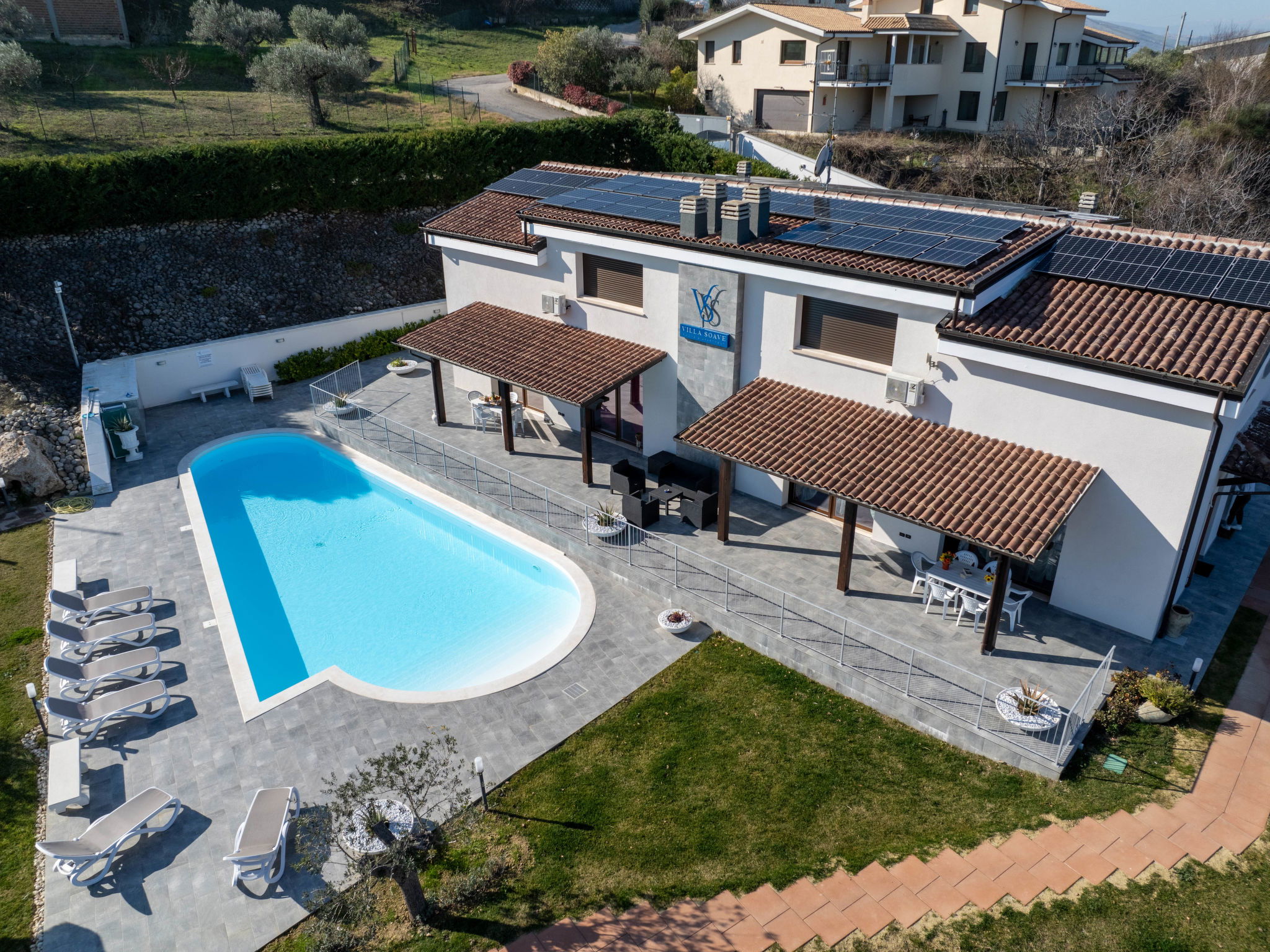 Very child friendly country house "Soave", detached, surrounded by meadows and fields. 4 apartments in the property. In the district of Madonna della Pace 5 km from the centre of Città Sant'Angelo, 18 km from the centre of Pescara, 6 km from the centre of Montesilvano, in a quiet, elevated position on a slope, 8 km from the sea. For shared use: property 3'000 m2 (fenced), well-kept garden lawn and plants, swimming pool (10 x 5 m, depth 120 - 220 cm, seasonal availability: 01.Jan. - 31.Dec.). Outdoor shower, pergola, terrace, garden furniture, barbecue. In the house: WiFi, washing machine (for shared use, extra). Parking on the premises. Grocery 1 km, shopping centre 5 km, café 1 km, bus stop 7 km, sandy beach 8 km. Nearby attractions: Centro Storico 3 km, Collegiata di san Michele arcangelo 3 km. Residence with electric gates.
