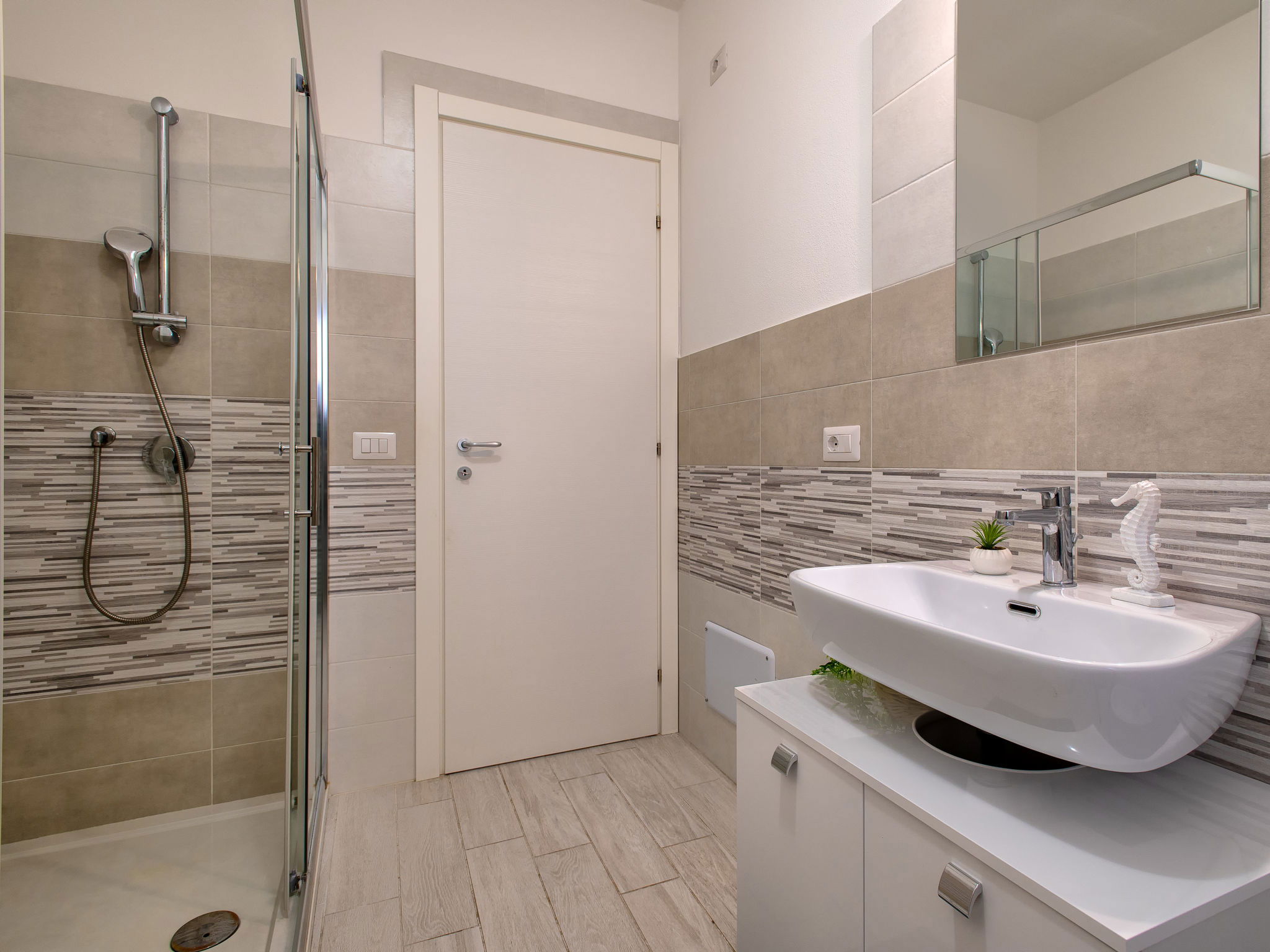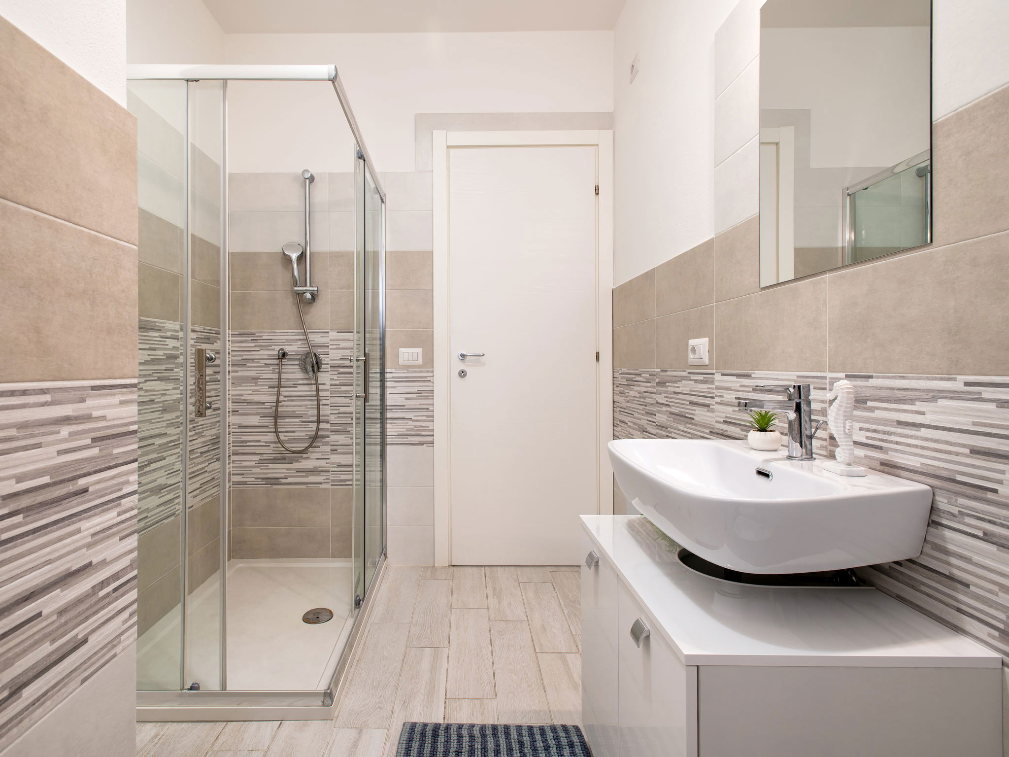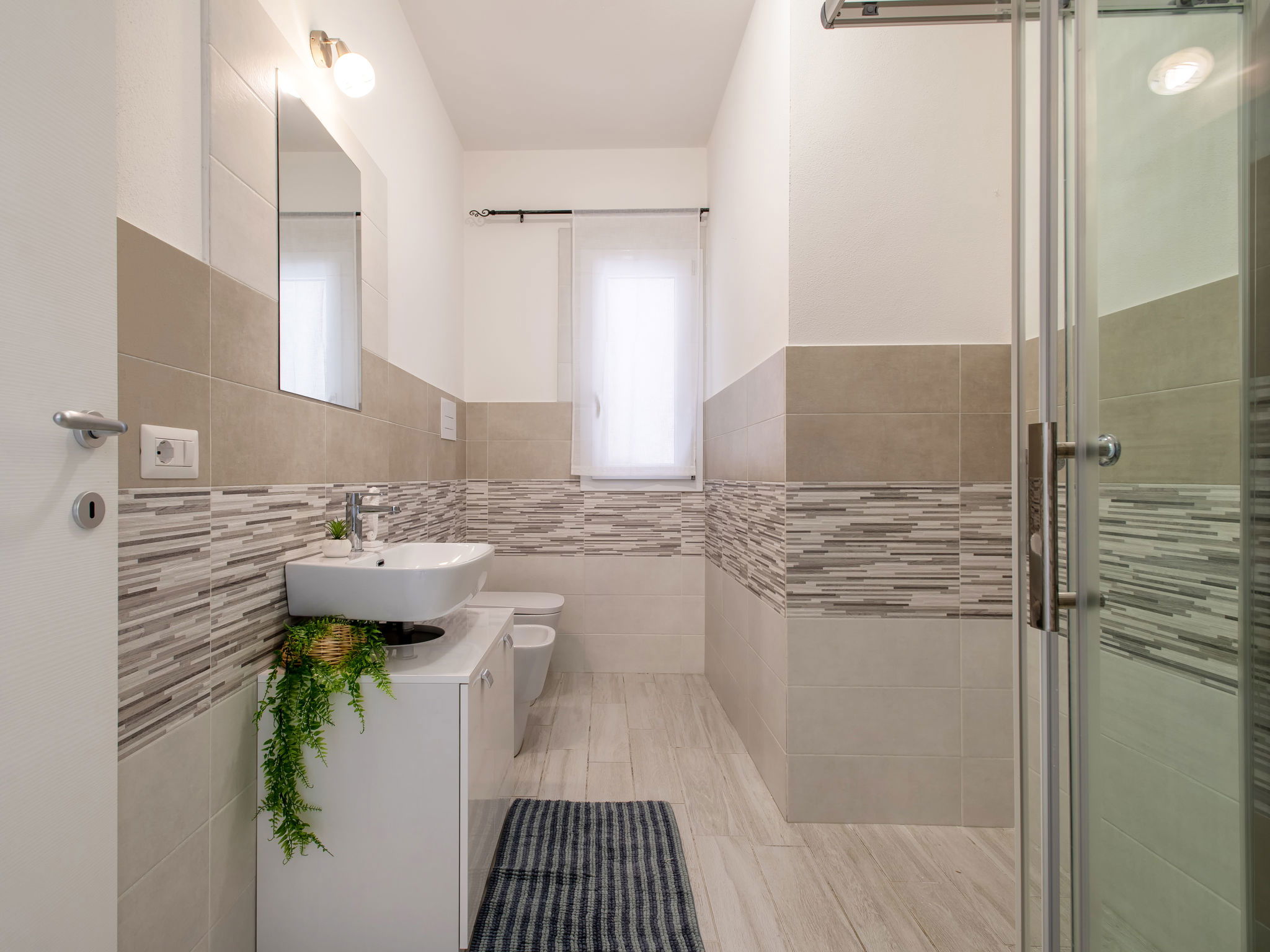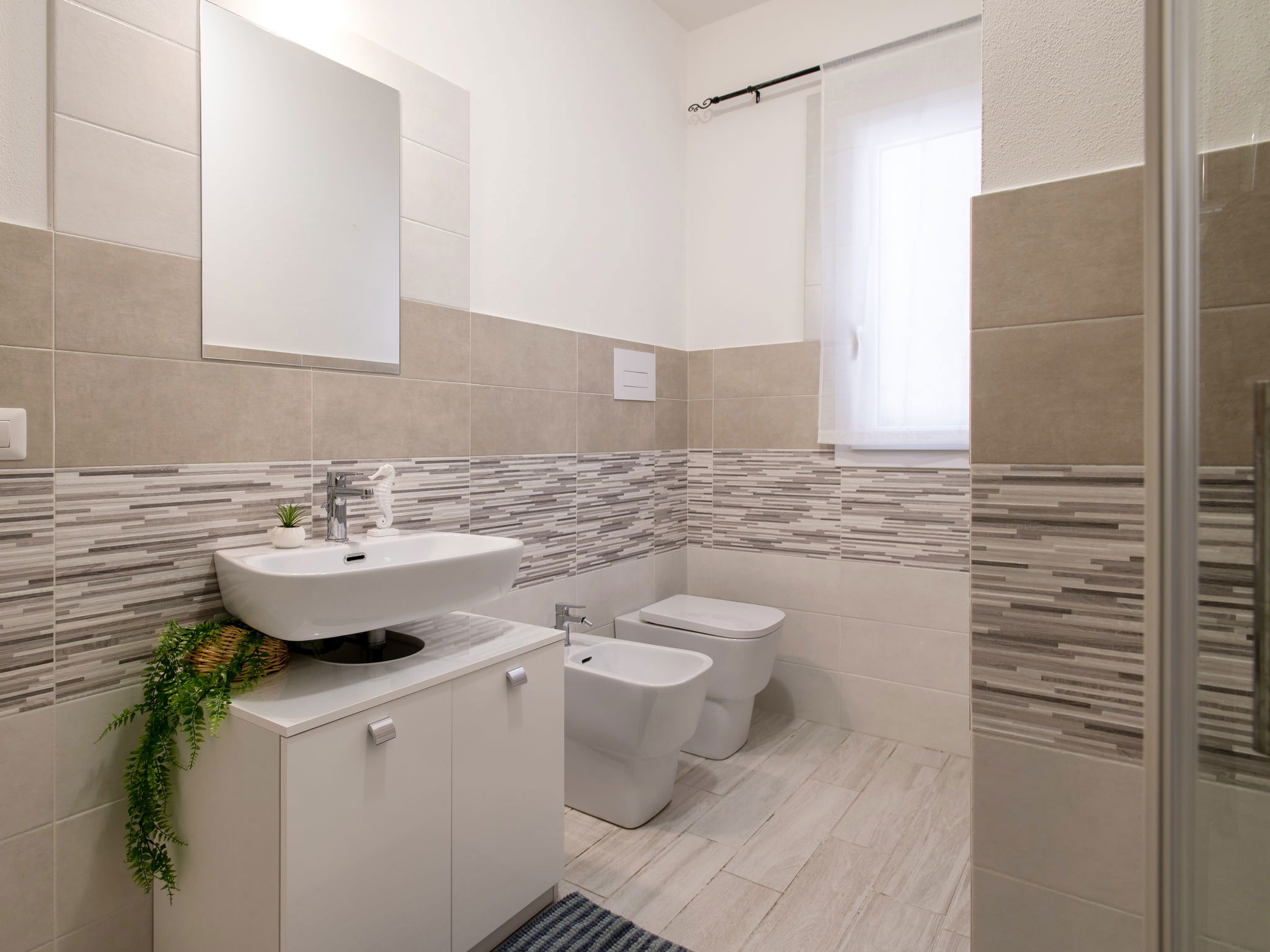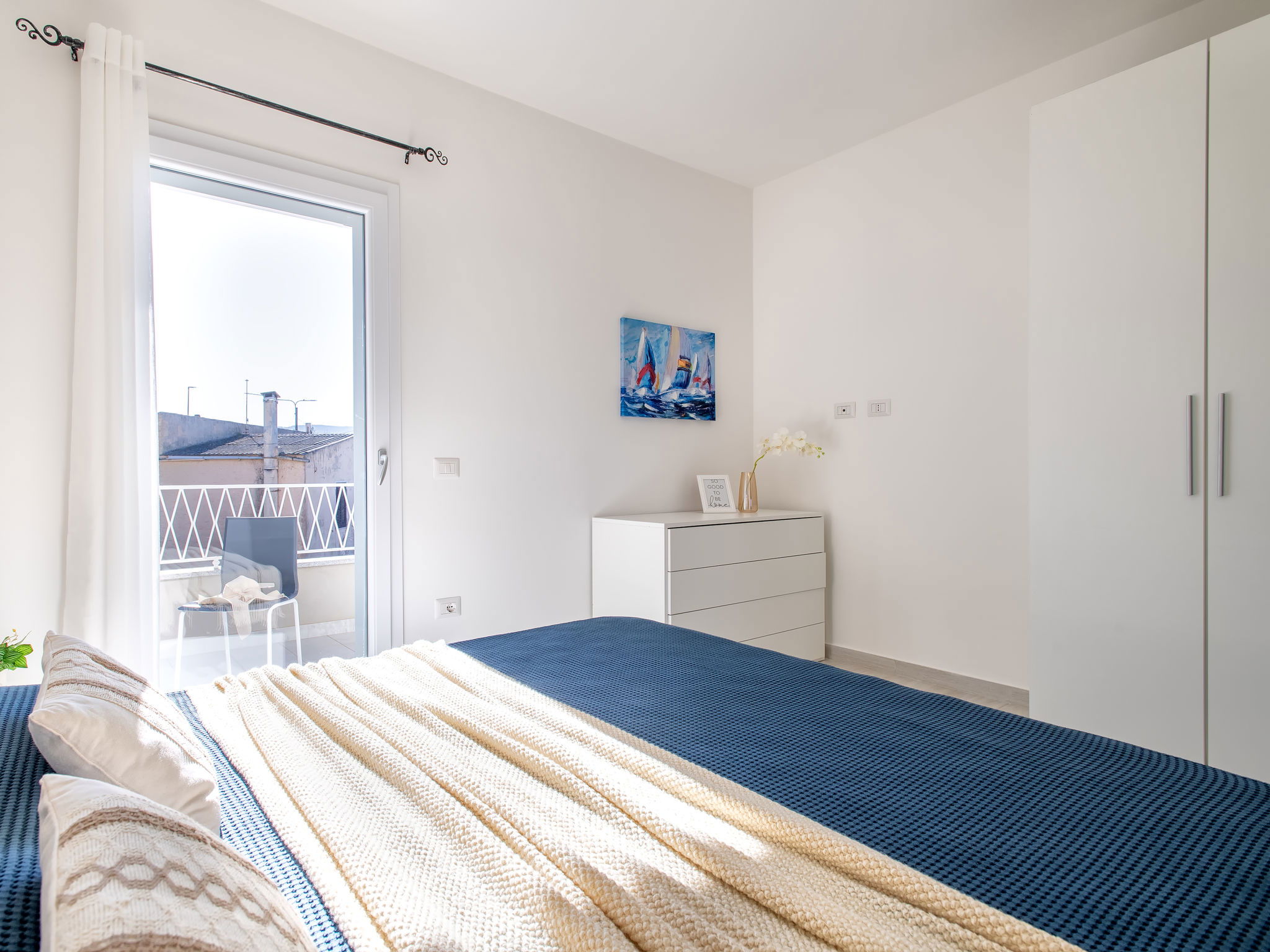 "Vista Blu", 3-room apartment 55 m2 on 1st floor. Comfortable and modern furnishings: living/dining room with 1 sofabed and TV (flat screen). Exit to the terrace. 1 double bedroom. 1 room with 1 x 2 bunk beds. Kitchenette (oven, dishwasher, 4 induction hot plates, toaster, kettle, microwave). Shower/bidet/WC. Air-conditioning, forced-air heating. Heating not available in all rooms. Terrace partly roofed. Terrace furniture. Very beautiful panoramic view of the sea. Facilities: washing machine, iron, hair dryer. Maximum 1 pet/ dog allowed. IT090079C2000S9312