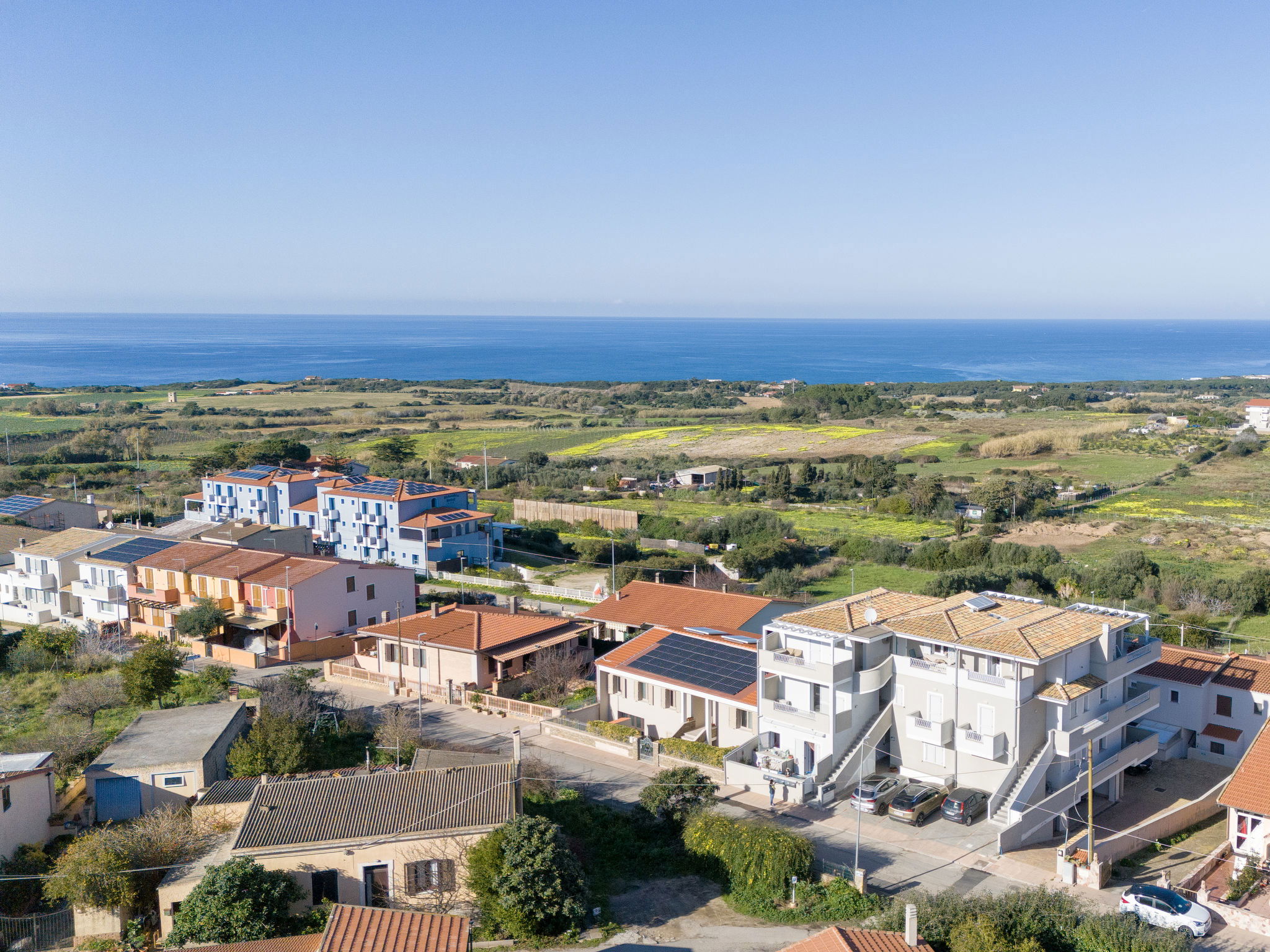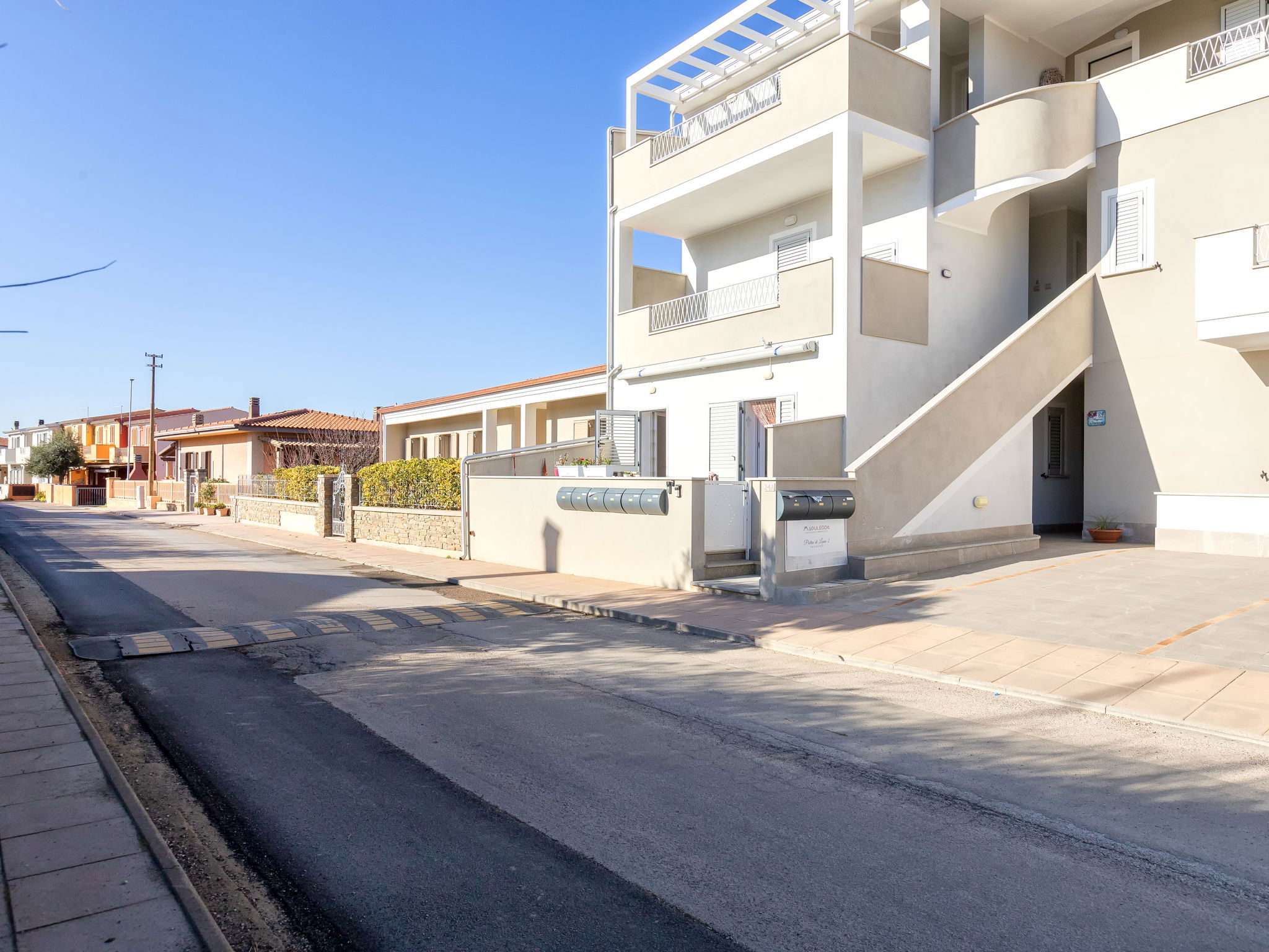 Modern residence "Pietra Di Luna 2", 2 storeys, built in 2020. 9 houses in the residence. In the centre of la Muddizza 4 km from the centre of Valledoria, in a quiet, sunny position, 1.1 km from the sea, 1.1 km from the beach. Stepped path (15 steps) to the house. Parking at the house. Supermarket 600 m, restaurant 400 m, bar 350 m, bus stop 300 m, sandy beach "Baia Verde" 1.1 km. Nearby attractions: Isola Rossa 20 km, Costa Paradiso 30 km, Stintino 78 km, Olbia 87 km, Porto Torres 48 km. Please note: car recommended.