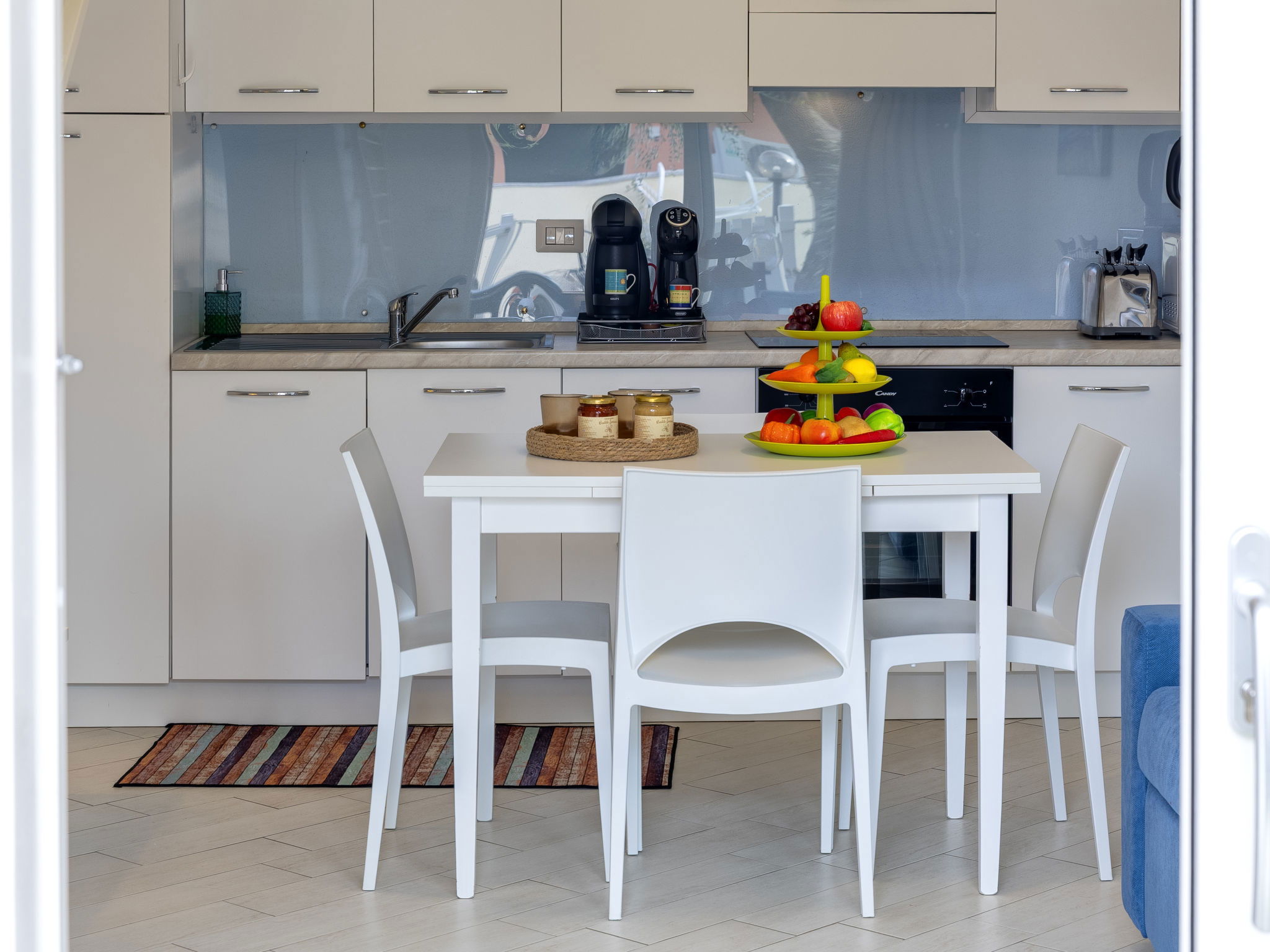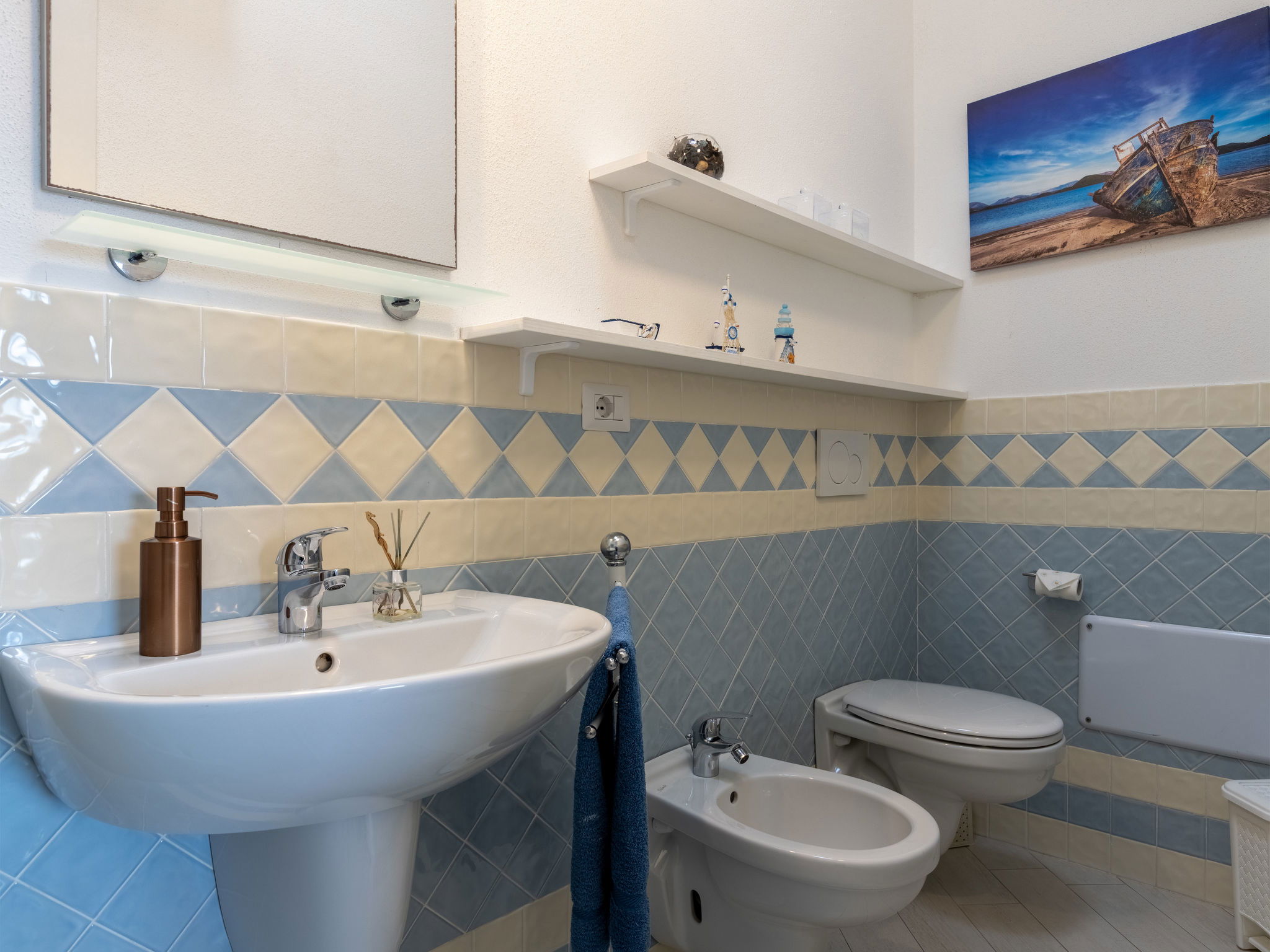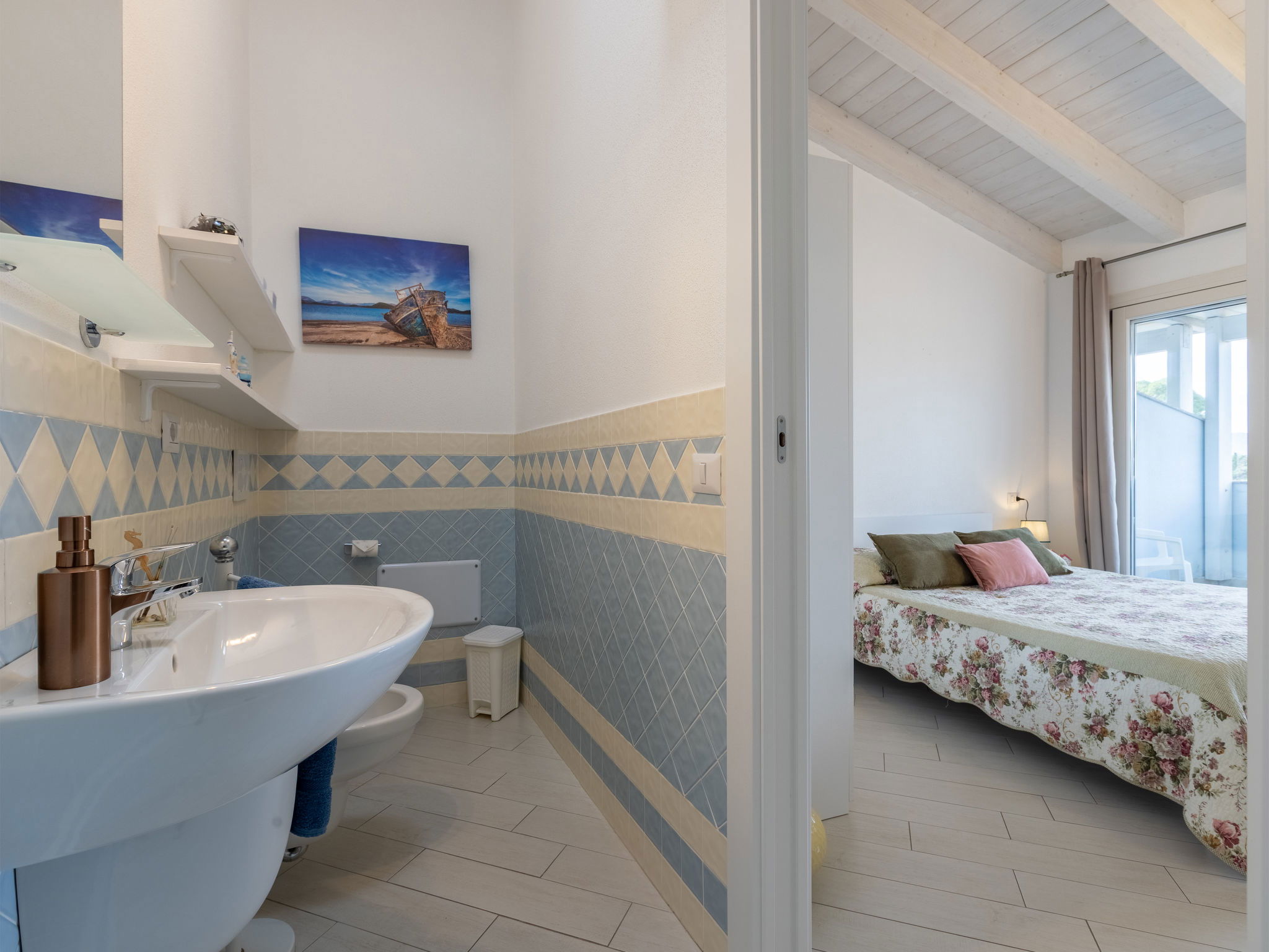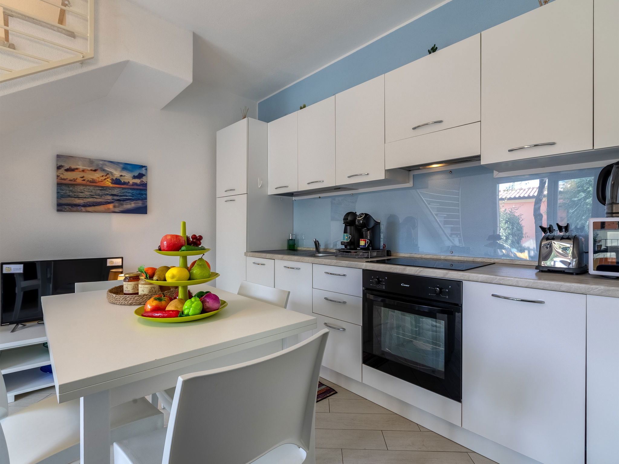 "Spritz Home", 2-room apartment 47 m2 on 2 levels, on the ground floor. Beautiful and tasteful furnishings: living/dining room with sliding door with 1 double sofabed and TV (flat screen). Exit to the garden. Kitchenette (oven, 4 induction hot plates, toaster, kettle, microwave, electric coffee machine). Upper floor: 1 double bedroom with panoramic window. Exit to the balcony. Shower/bidet/WC. Air-conditioning, boiler. Balcony furniture. Facilities: washing machine, iron, hair dryer. Internet (WiFi, free). Parking space n 33. Please note: suitable for families. Maximum 1 small pet/ dog allowed. Fire extinguisher. IT090082C2000Q8704