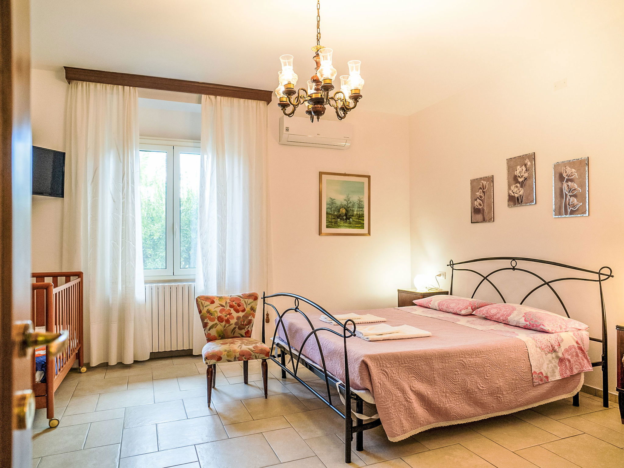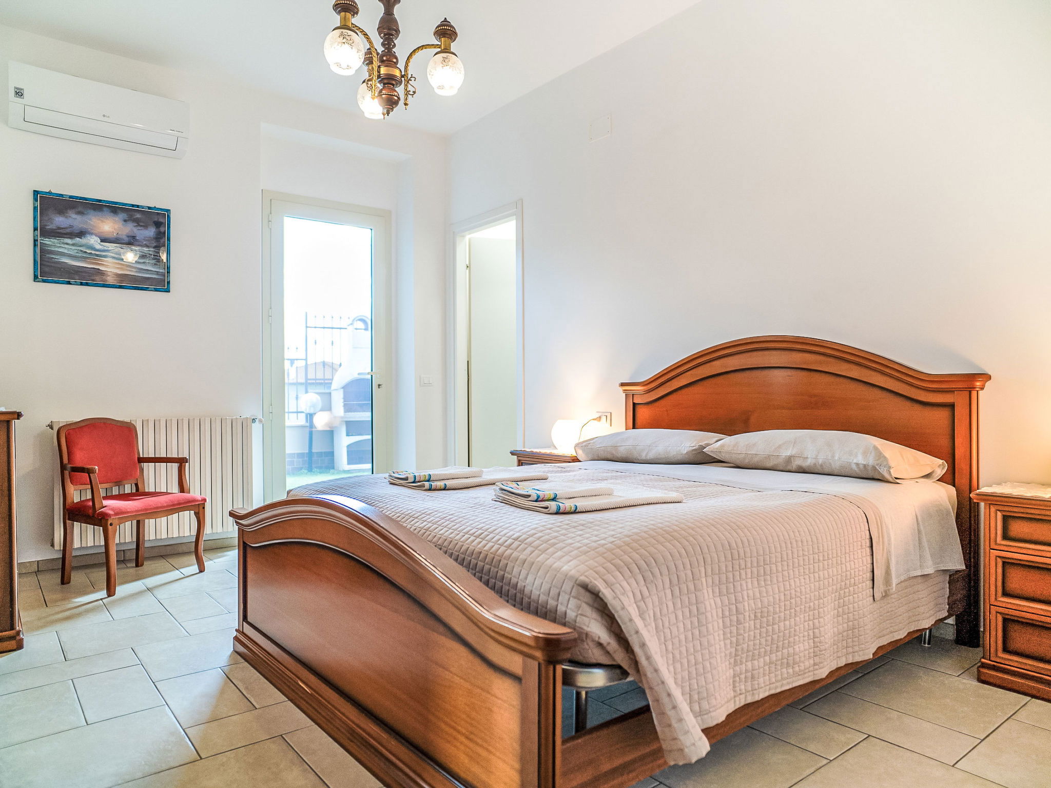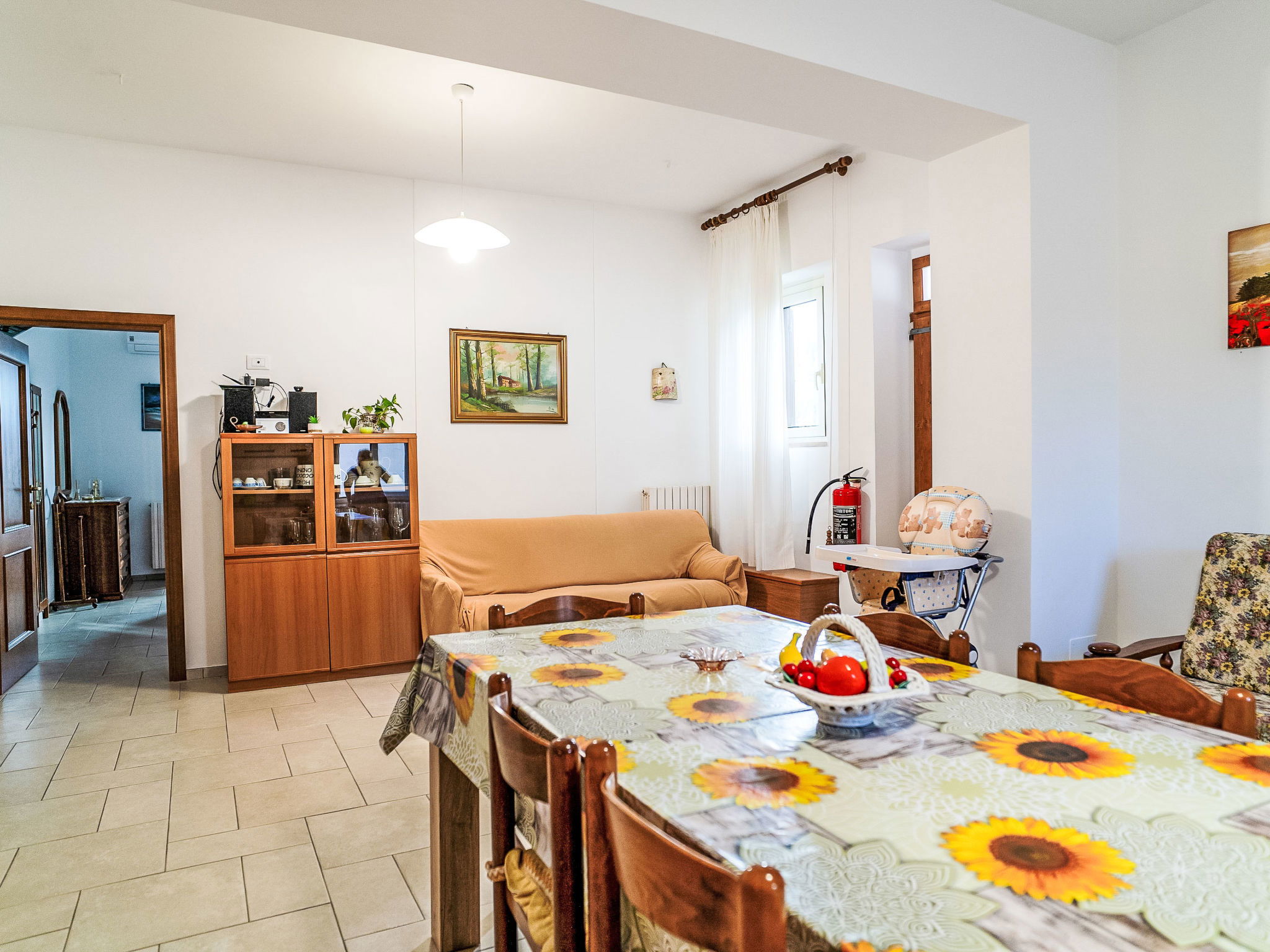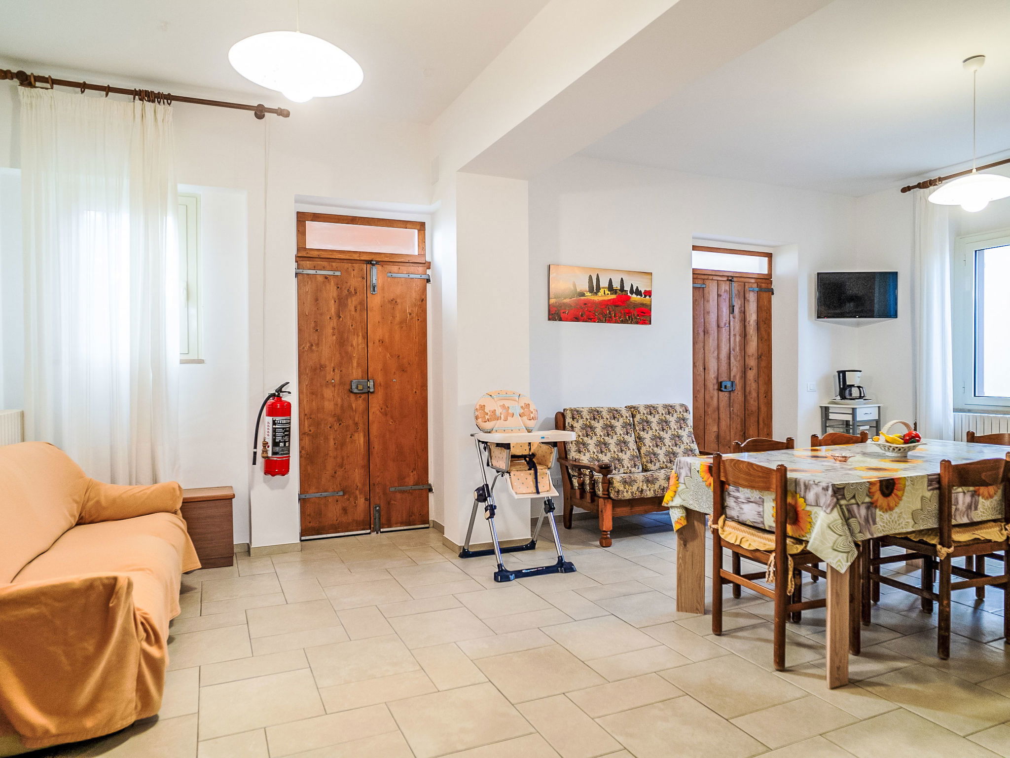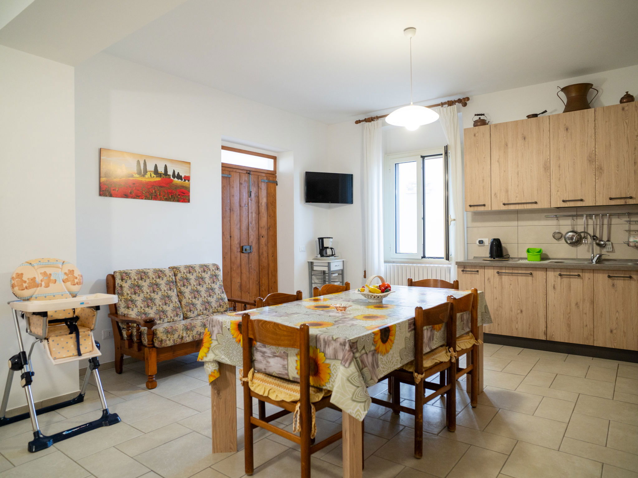"Dolce Vita ", 4-room apartment 110 m2, on the ground floor. Practical and rustic furnishings: living room with TV and hi-fi system. Exit to the terrace. 1 room with 1 french bed (160 cm), air conditioning. 1 room with 2 beds. 1 room with 1 french bed (160 cm), bathroom, shower/bidet/WC and air conditioning. Exit to the garden. Kitchen 30 m2 (4 hot plates, oven, dishwasher, microwave, freezer, electric coffee machine) with dining table. Exit to the terrace. Bathroom, shower/bidet/WC. Heating. Terrace roofed, patio roofed, lawn 350 m2. Terrace furniture, barbecue. Panoramic view. Facilities: washing machine, safe, iron, children's high chair, baby cot for up to 2 year olds. Internet (WiFi, free). Please note: suitable for families. Maximum 1 pet/ dog allowed. Private entrance. IT068015C2SEKPJ7U3