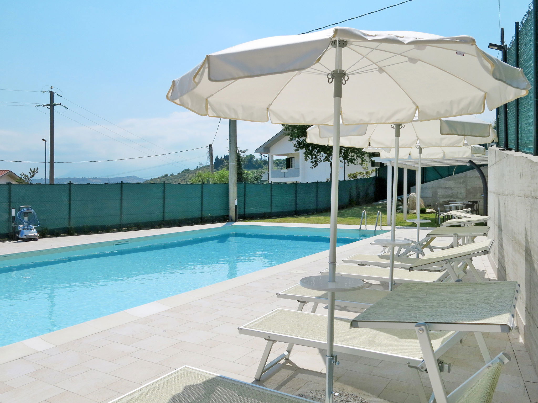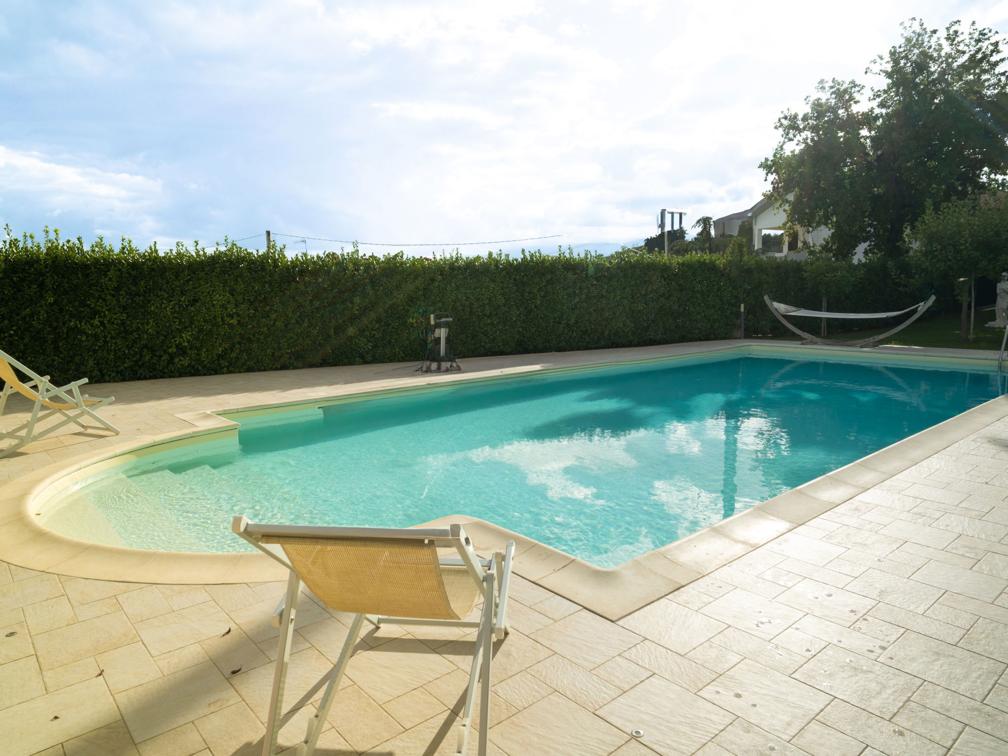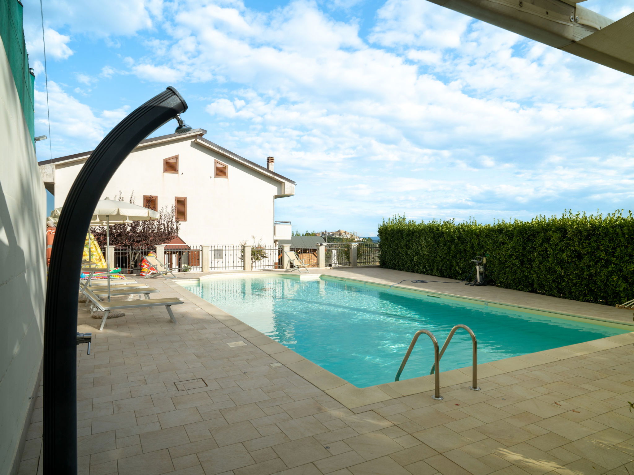 2-family house "Dolce Vita", renovated in 2024. 3 km from the centre of Collecorvino, 24 km from the centre of Pescara, outside the resort Collecorvino, on a slope, 21 km from the sea. For shared use: property 1'500 m2 (fenced), well-kept garden, courtyard. Private: swimming pool fenced (12 x 6 m, depth 120 - 190 cm, seasonal availability: 01.May. - 30.Oct.) with salt-electrolysis pool-cleaning system. Outdoor shower, terrace, garden furniture, barbecue house, parking (for 5 cars) on the premises. Shop 3 km, supermarket 3 km, bus stop 100 m, railway station "Pescara Centrale" 23 km, sandy beach "Montesilvano" 21 km. Nearby attractions: Chiostro e convento 3 km, Castello con la sua torretta 7 km, Parco Fluviale 10 km. Please note: Loading and unloading of baggage is possible at the holiday house. Residence with electric gates. The owner lives in the same residence. Motorway 20 km from the property. Airfield 25 km from the property.