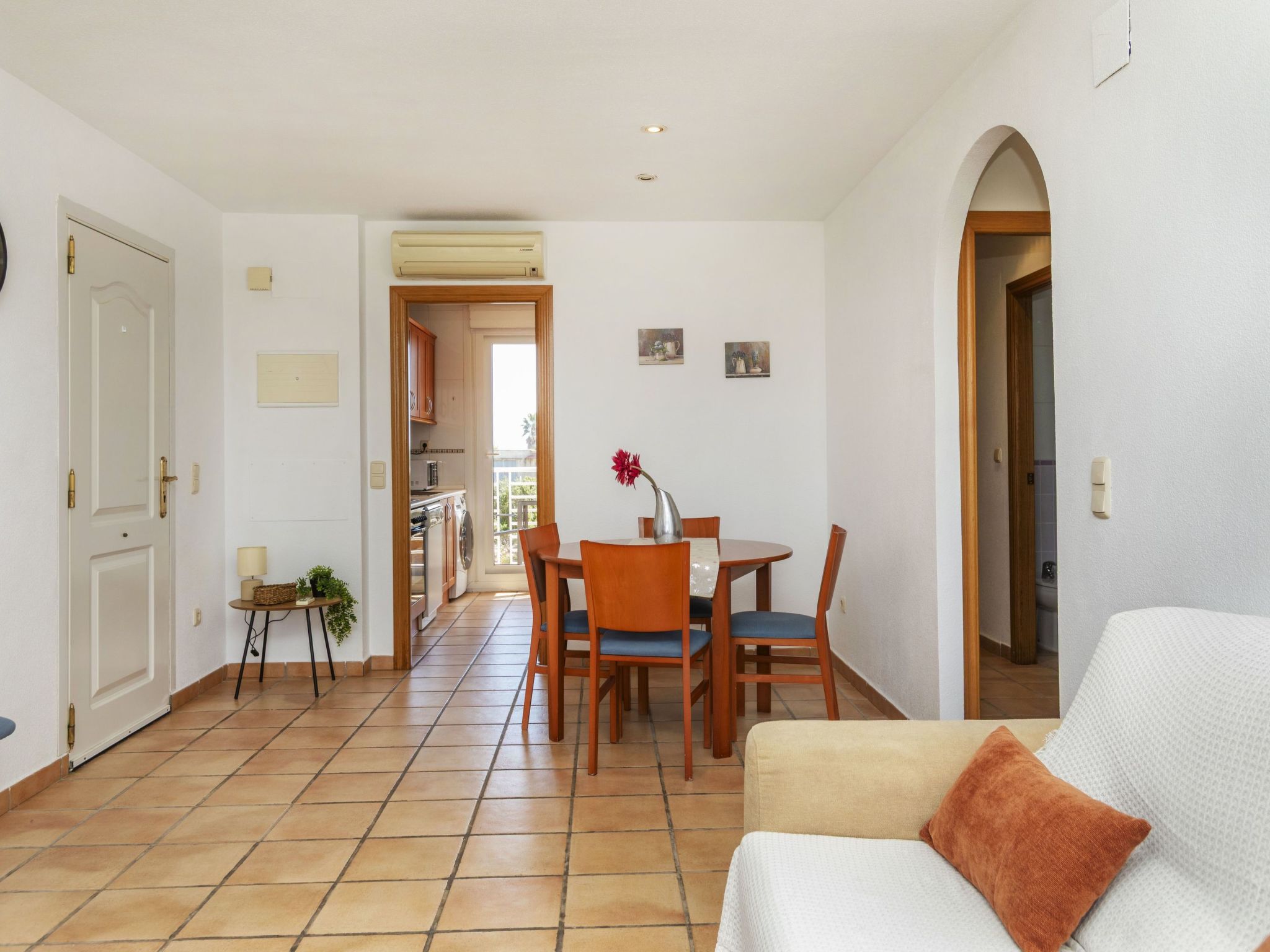 "Montero Golf V", 3-room apartment 60 m2 on 1st floor. Practical and comfortable furnishings: living/dining room with dining table, digital TV, air conditioning and forced-air heating. Exit to the terrace. 1 room with 1 french bed (1 x 135 cm, length 190 cm), air conditioning and forced-air heating. 1 room with 2 beds (90 cm, length 190 cm), air conditioning and forced-air heating. Large kitchen (oven, 3 ceramic glass hob hotplates, toaster, electric coffee machine). Exit to the terrace. Bath/WC, shower/WC. 2 terraces. Terrace furniture. View of golf course. Facilities: washing machine, iron, hair dryer. Internet (WiFi, free). Parking space n 116. Please note: non-smokers only. Maximum 1 pet/ dog allowed. TV only ES. No lift. R00000001