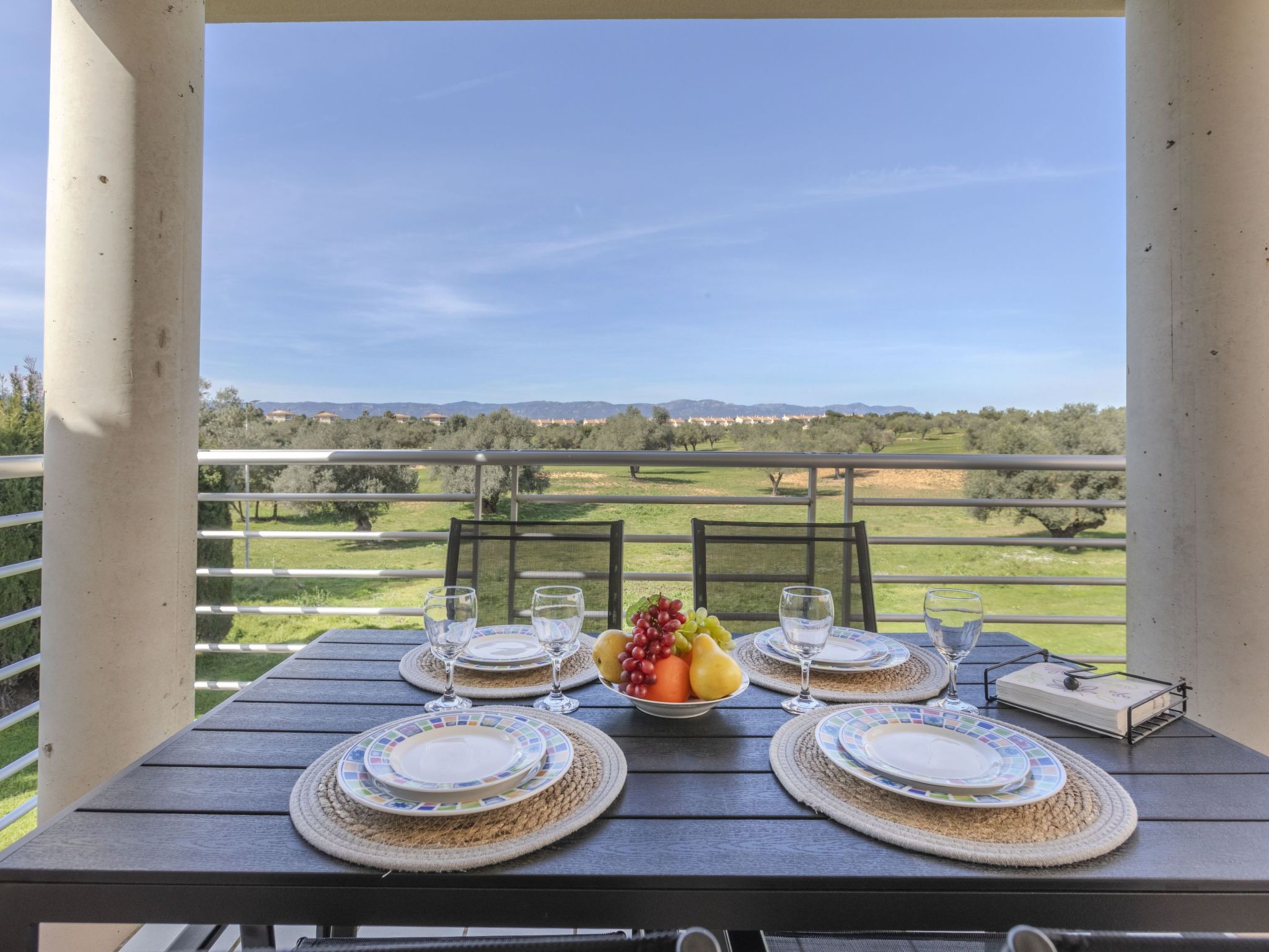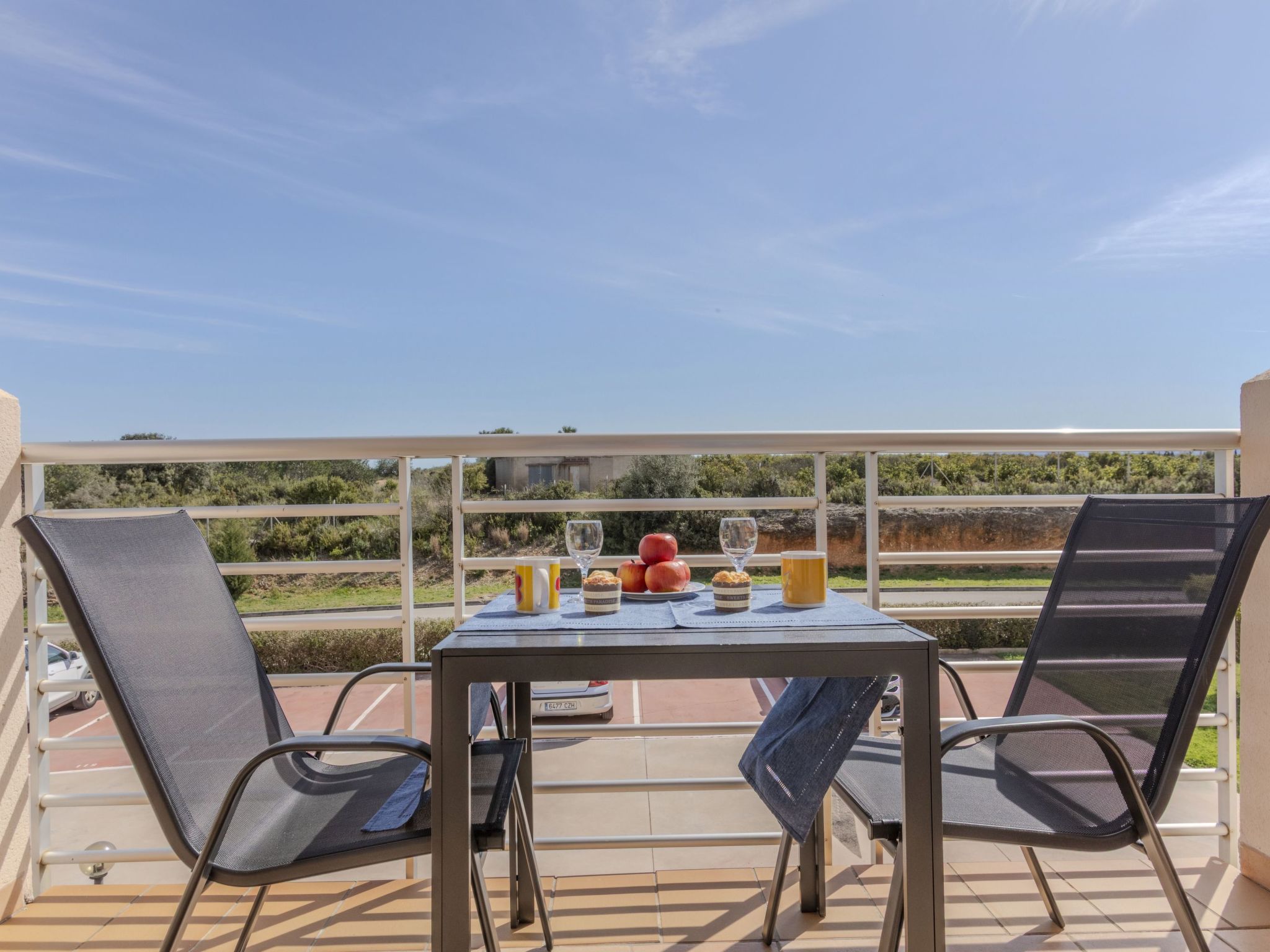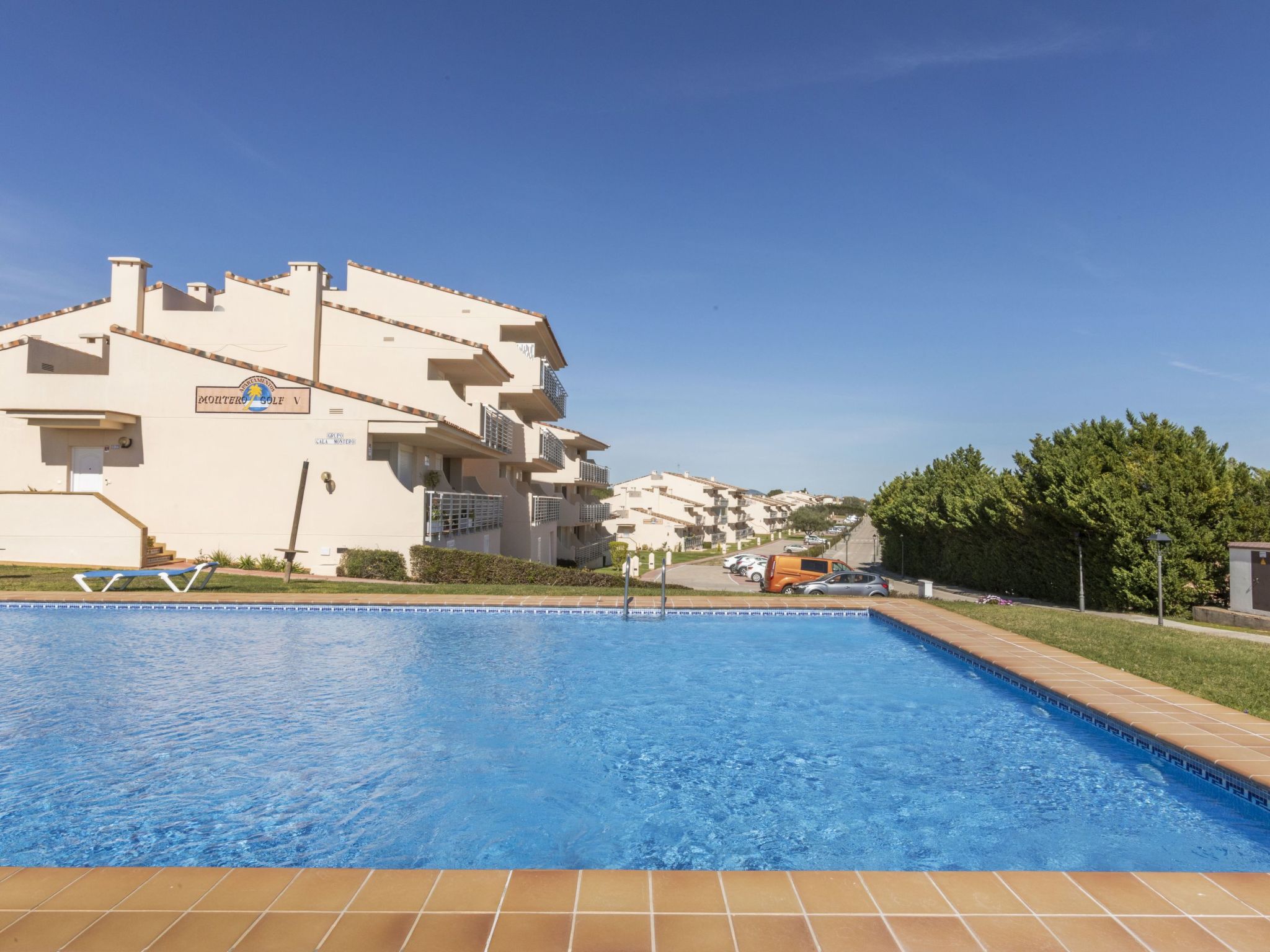Panorámica Golf: Cosy apartment block "Montero Golf V", 2 storeys, surrounded by fields. 6 apartments in the property. 60 apartments in the residence. In a quiet position, 18 km from the sea, 18 km from the beach, on the golf course. For shared use: swimming pool angular (15 x 5 m, depth 60 - 190 cm, seasonal availability: 01.Jun. - 30.Sep. pool opening hours: 09:00-21:00). Outdoor shower, parking. Grocery 300 m, supermarket 6 km, shopping centre 15 km, restaurant, bar 300 m, bus stop "Sant Jordi" 6 km, railway station "Vinaroz" 15 km, sandy beach "Vinaroz" 18 km. Golf course (18 hole) 500 m, walking paths from the house 100 m. Nearby attractions: Peñiscola 30 km, Vinaroz 15 km, Port Aventura 15 km, Ciudad de las Artes y las Ciencias 150 km, Delta del Ebro 50 km, Morella 55 km. Well-known lakes can easily be reached: Pantano de la Senia 30 km. Hiking paths: La Foradada Sant Carles de la Rapita 30 km, Parque Natural Sierra de Irta 35 km. Please note: car recommended, no lift. Groups of teenagers on request only. Neighbourhood highly sensitive to noise. Quietness and good behaviour expected.