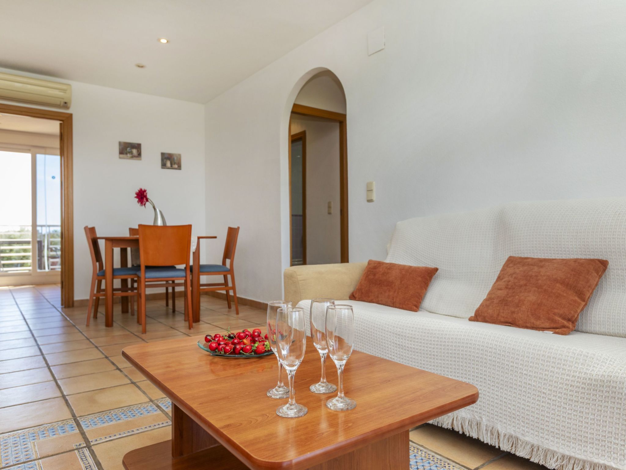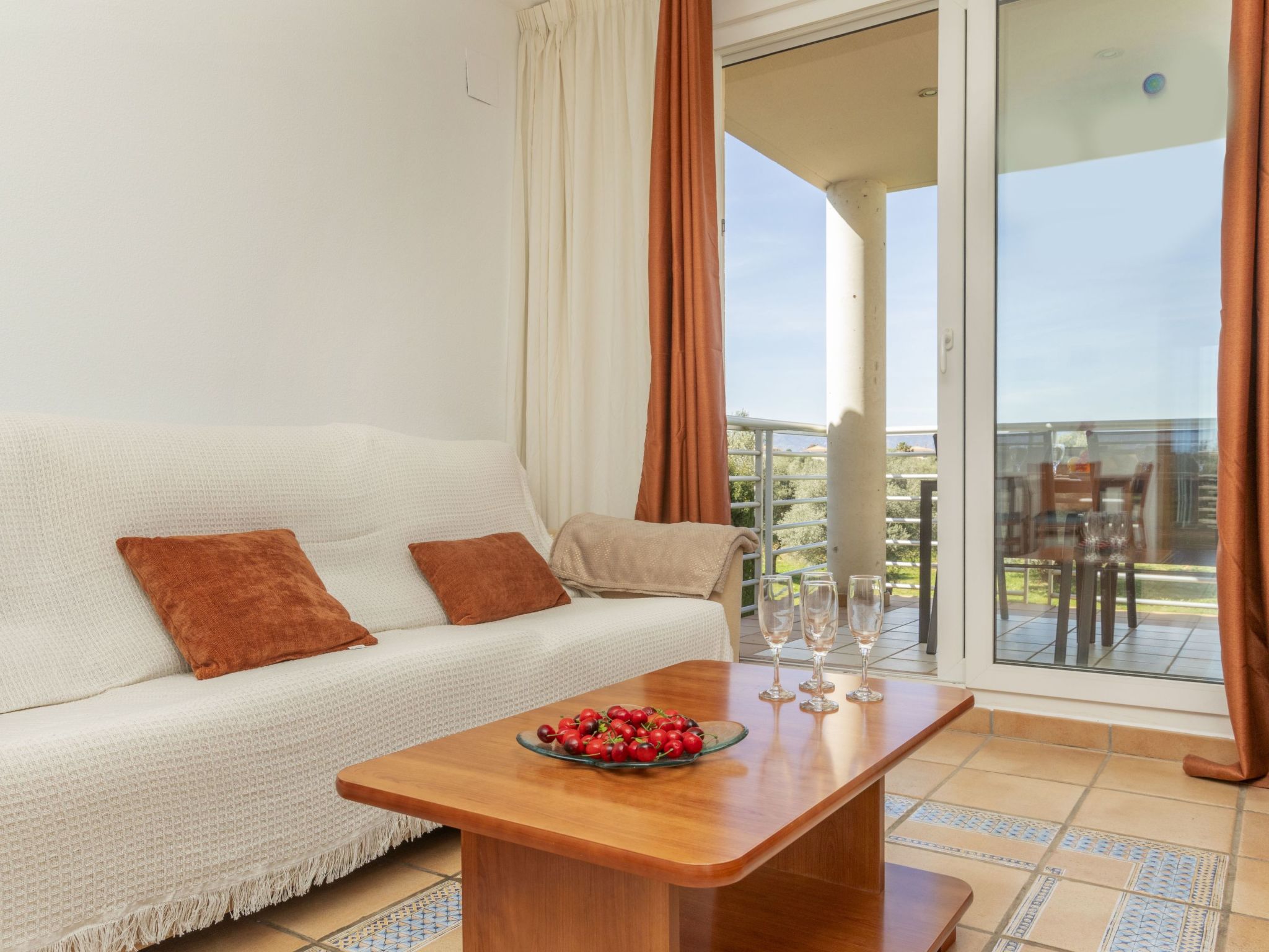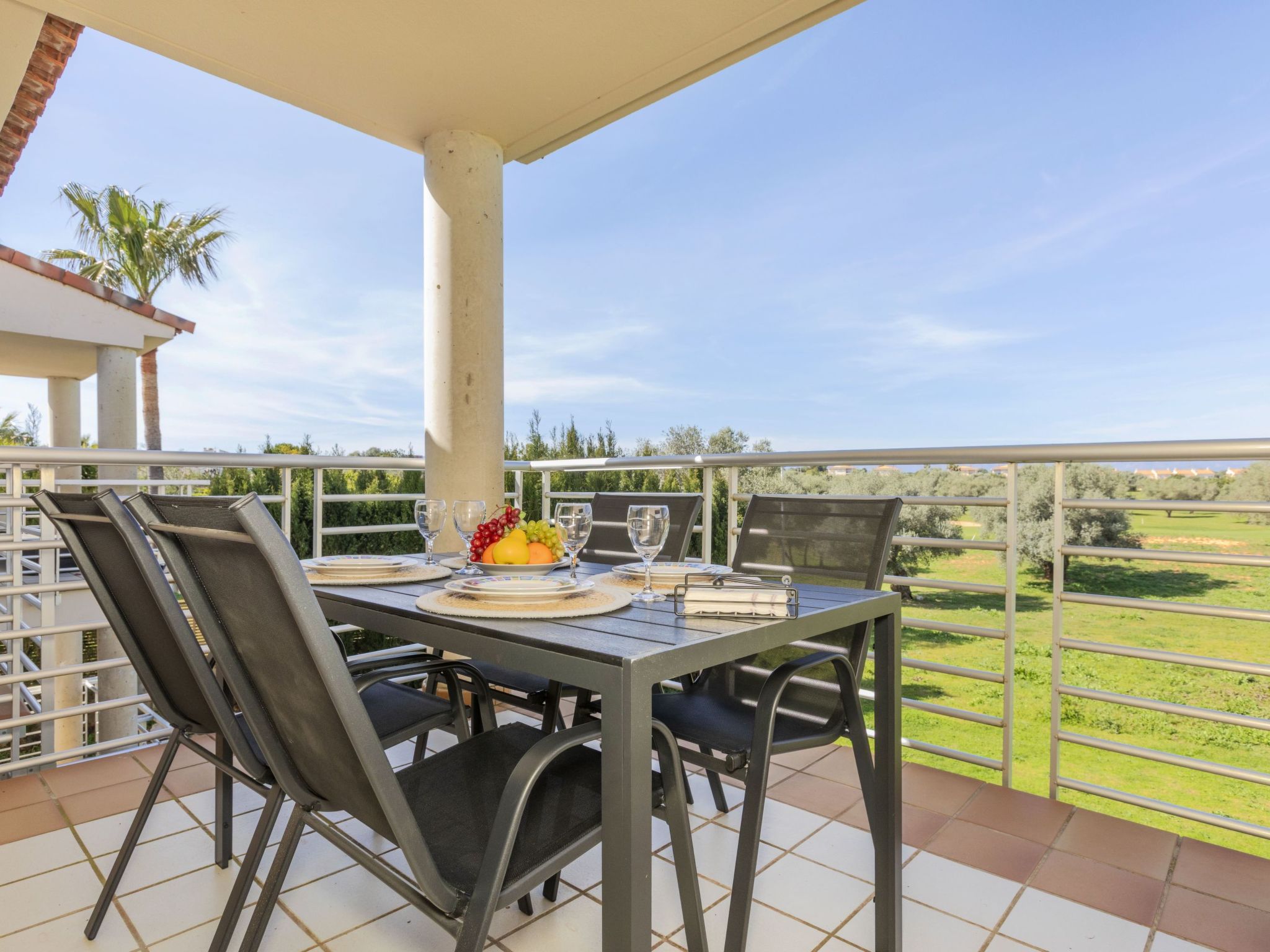 Panorámica Golf: Cosy apartment block "Montero Golf V", 2 storeys, surrounded by fields. 6 apartments in the property. 60 apartments in the residence. In a quiet position, 18 km from the sea, 18 km from the beach, on the golf course. For shared use: swimming pool angular (15 x 5 m, depth 60 - 190 cm, seasonal availability: 01.Jun. - 30.Sep. pool opening hours: 09:00-21:00). Outdoor shower, parking. Grocery 300 m, supermarket 6 km, shopping centre 15 km, restaurant, bar 300 m, bus stop "Sant Jordi" 6 km, railway station "Vinaroz" 15 km, sandy beach "Vinaroz" 18 km. Golf course (18 hole) 500 m, walking paths from the house 100 m. Nearby attractions: Peñiscola 30 km, Vinaroz 15 km, Port Aventura 15 km, Ciudad de las Artes y las Ciencias 150 km, Delta del Ebro 50 km, Morella 55 km. Well-known lakes can easily be reached: Pantano de la Senia 30 km. Hiking paths: La Foradada Sant Carles de la Rapita 30 km, Parque Natural Sierra de Irta 35 km. Please note: car recommended, no lift. Groups of teenagers on request only. Neighbourhood highly sensitive to noise. Quietness and good behaviour expected.