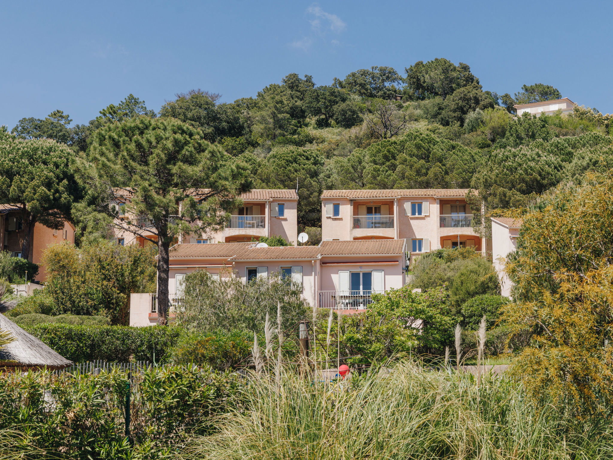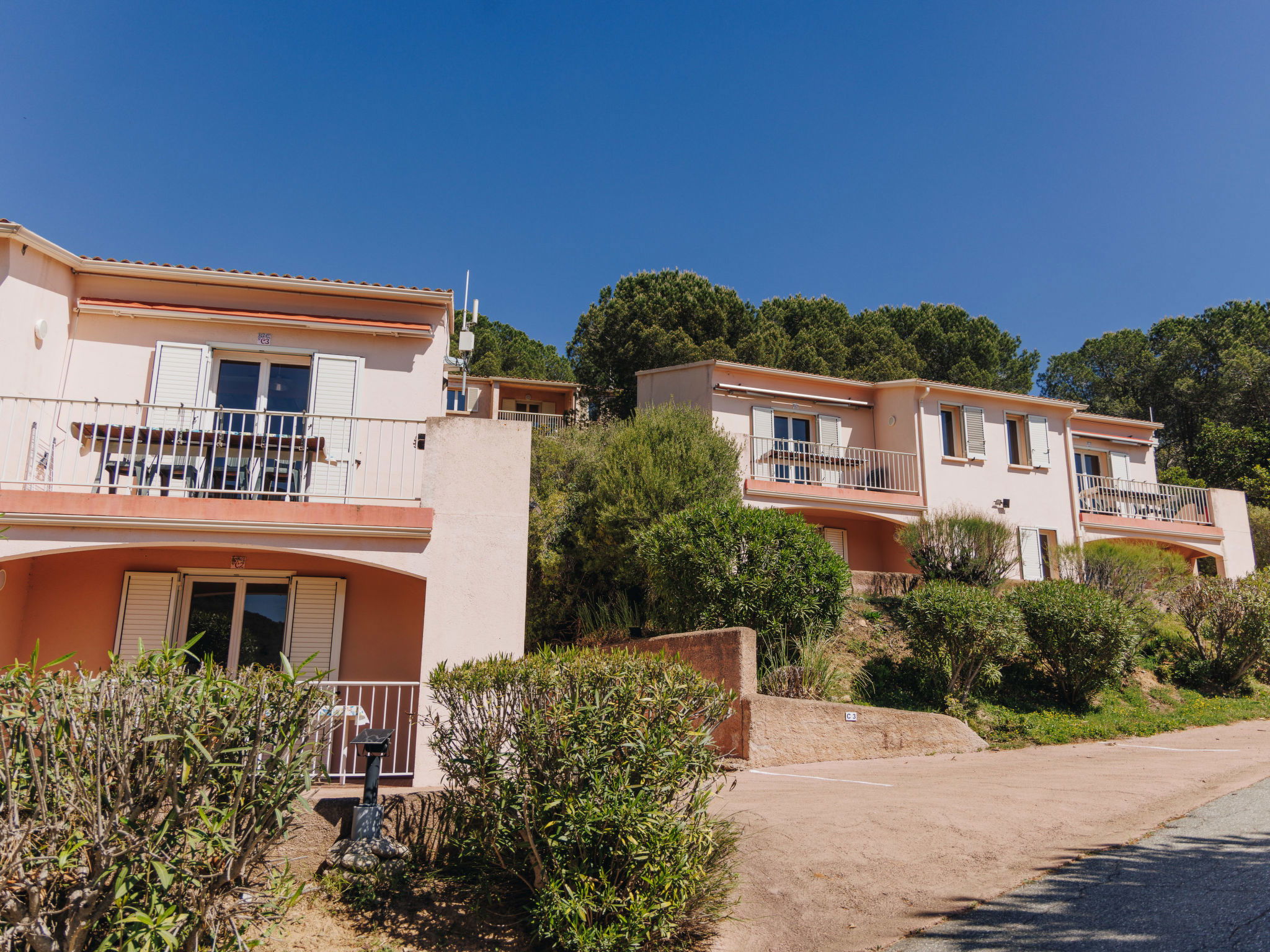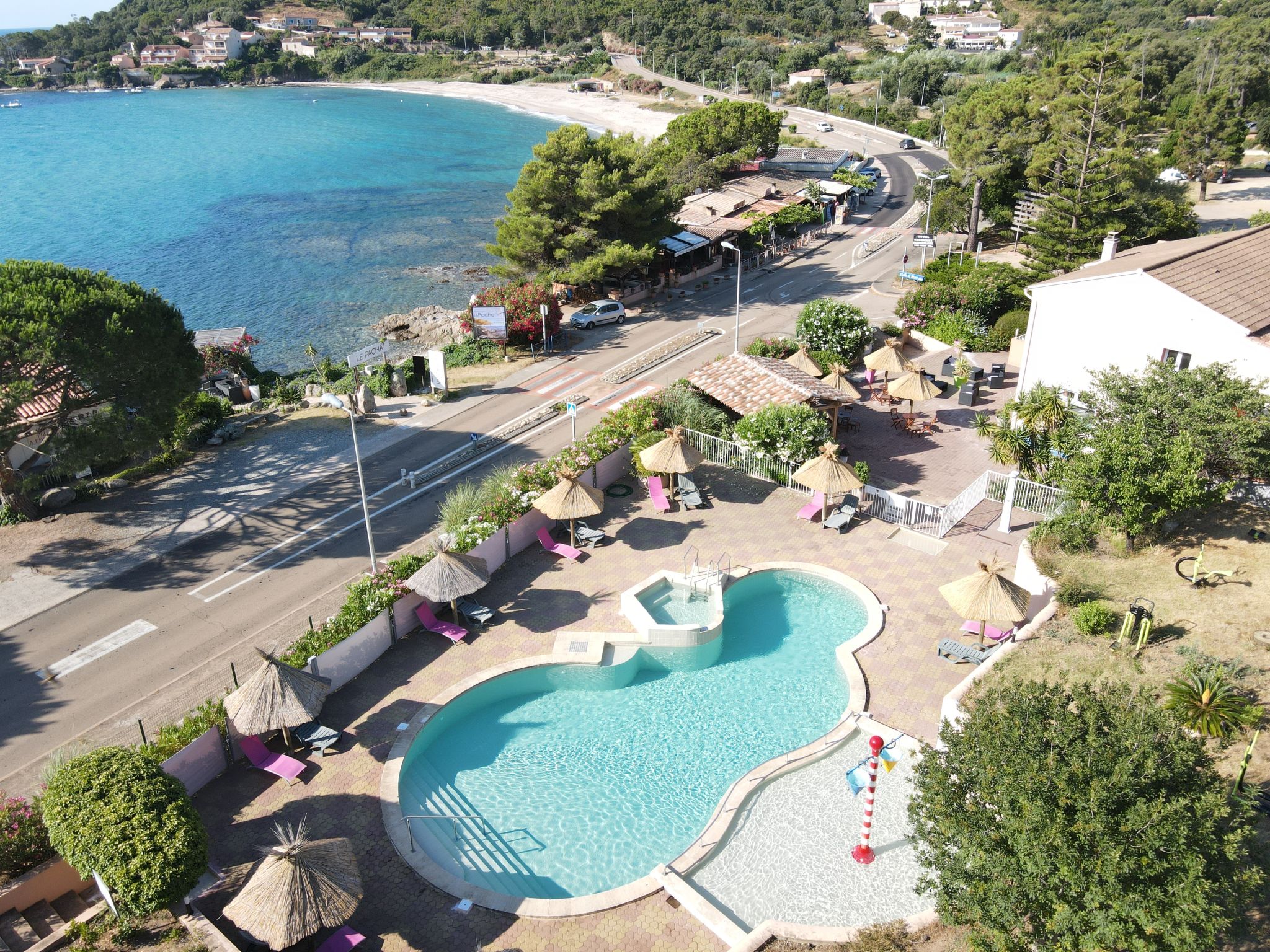Tarco: Residence "Le Télémaque". 32 apartments in the residence. 100 m from the sea, 100 m from the beach, road to cross. For shared use: property 2 ha (fenced), swimming pool kidney-shaped heated (depth 150 cm, seasonal availability: 01.Apr. - 03.Nov.). Shower/WC in the pool area, children's pool, boccia, children's playground. In the house: reception, bar, breakfast room, WiFi, laundry, washing machine (extra), tumble dryer (for shared use, extra). Parking at the house. Grocery 50 m, supermarket 10 km, restaurant 40 m, bus stop 3 km, sandy beach "Tarco" 100 m. Sports harbour 13 km. Nearby attractions: Cavu 16 km, Porto-Vecchio 25 km, Bonifacio 53 km. Hiking paths: GR20 16 km, Cavu 16 km, Aiguilles de Bavella 44 km. Please note: car recommended. Suitable for families, baby equipment on request (extra). The photograph shows a typical example.