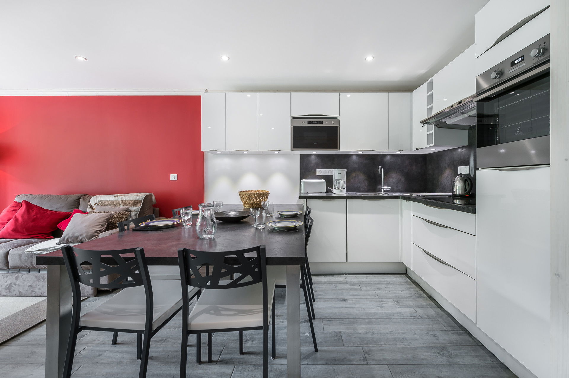 - Open kitchen with ceramic hob, oven, refrigerator, microwave, dishwasher