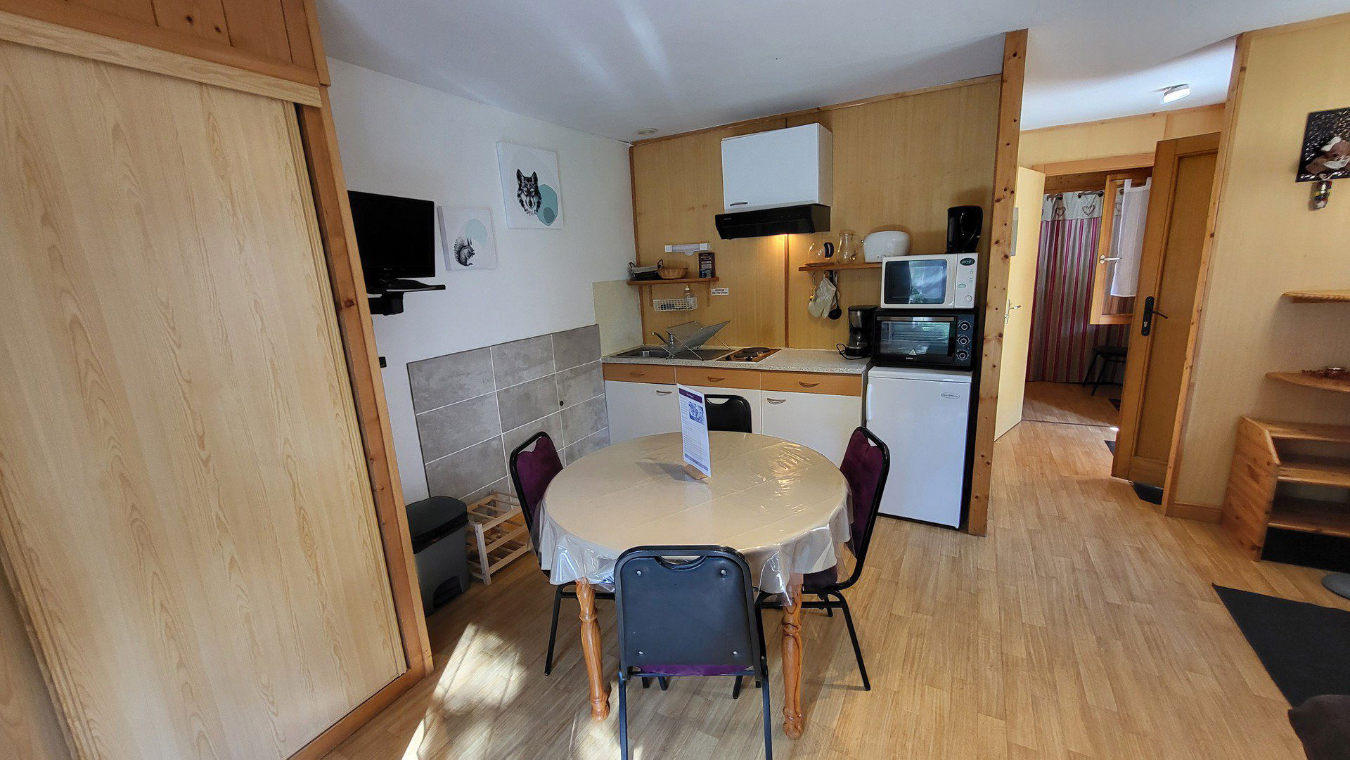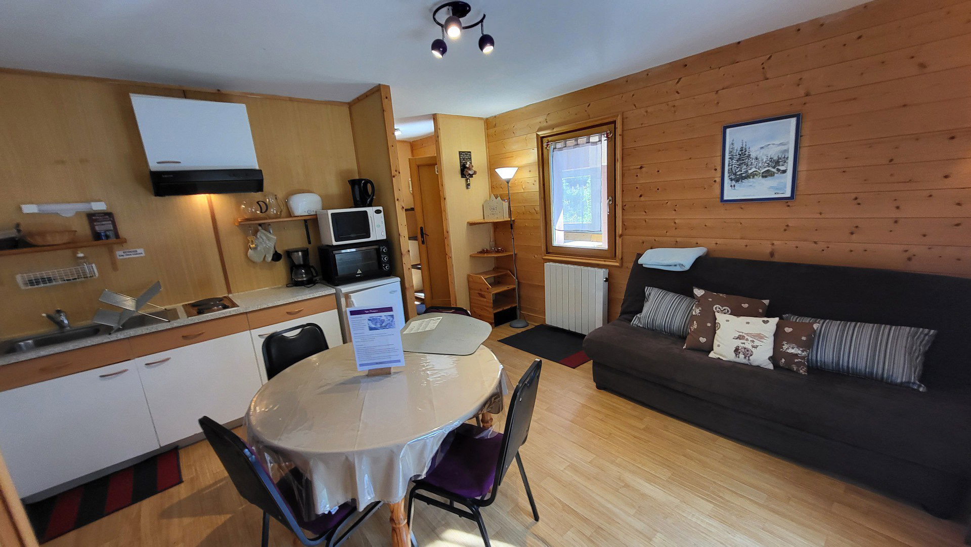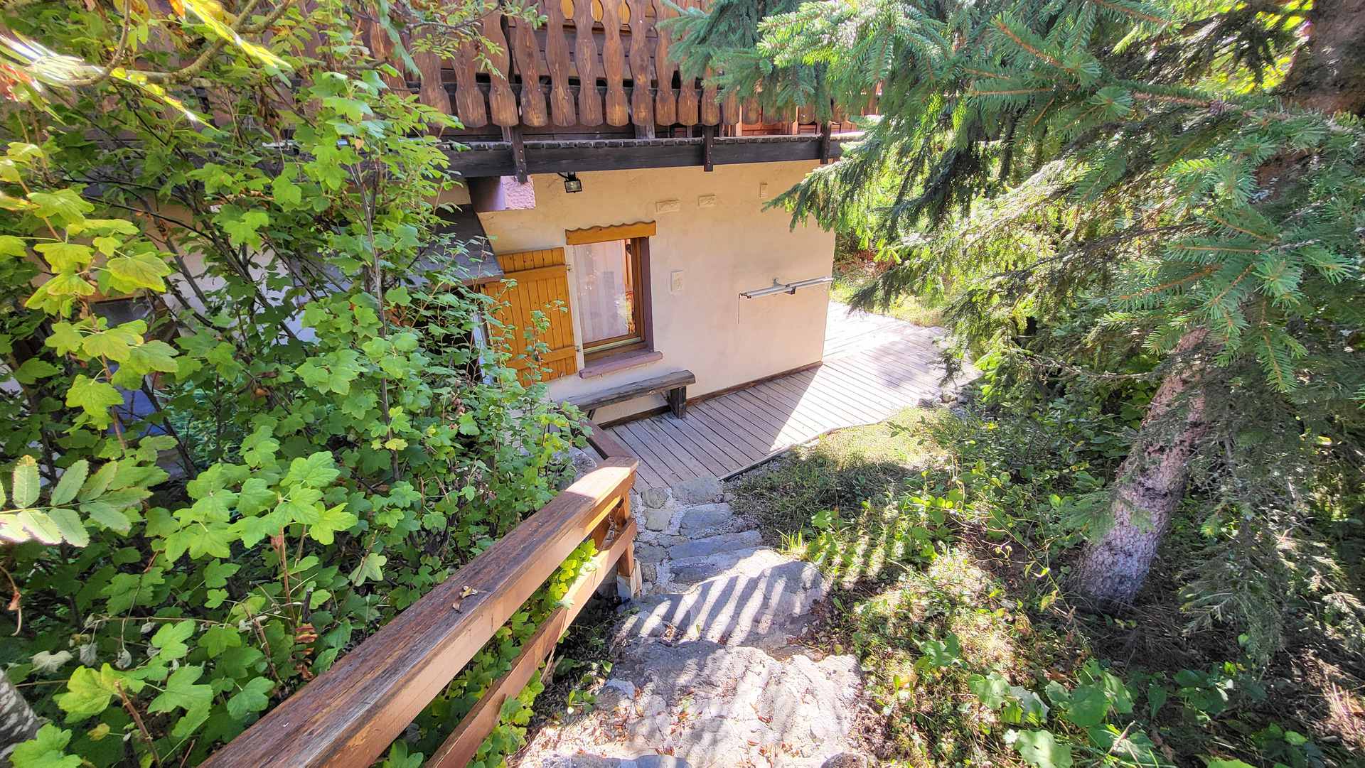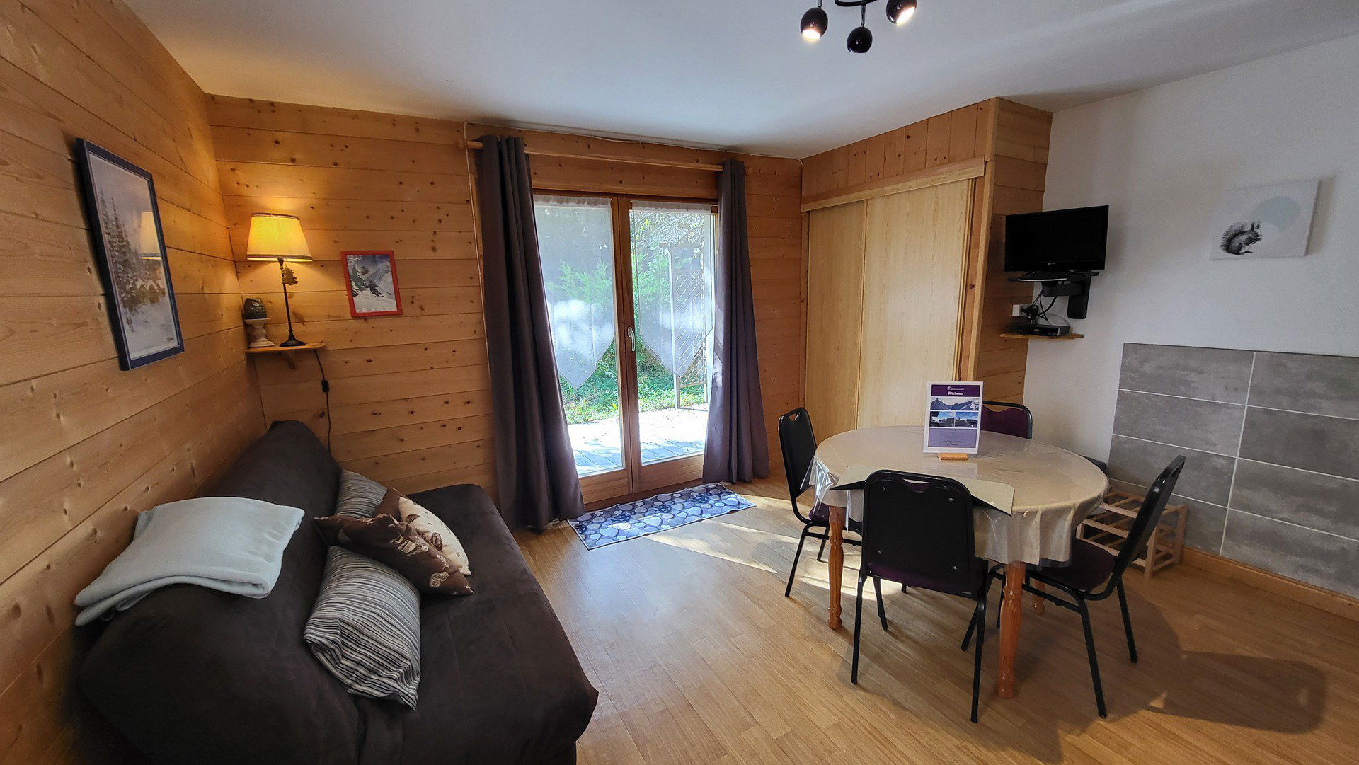 2 rooms of 31sq-m for 4 people maximum, located on level -1 of a chalet. Large shared terrace facing south east overlooking the forest and courtyard with picnic table in front of the entrance.