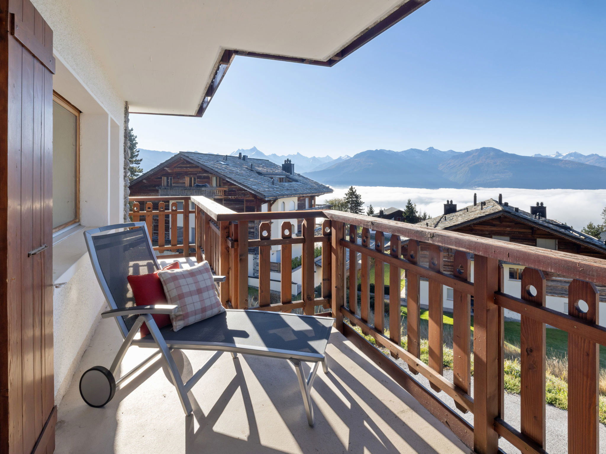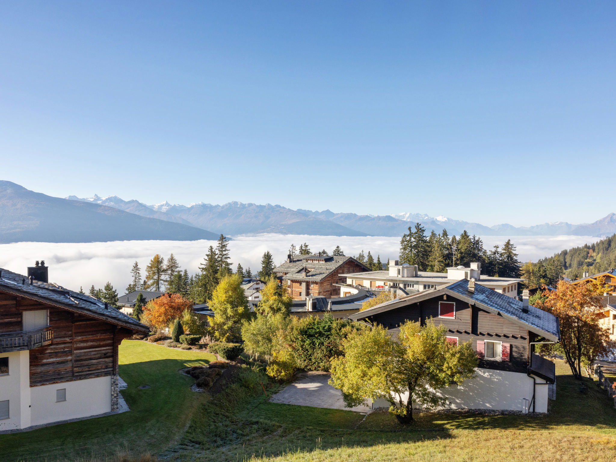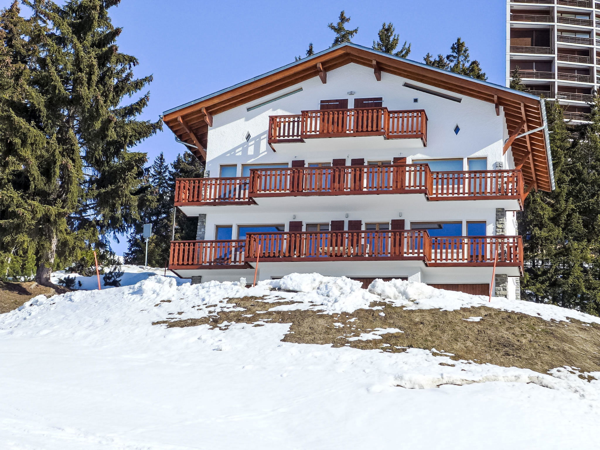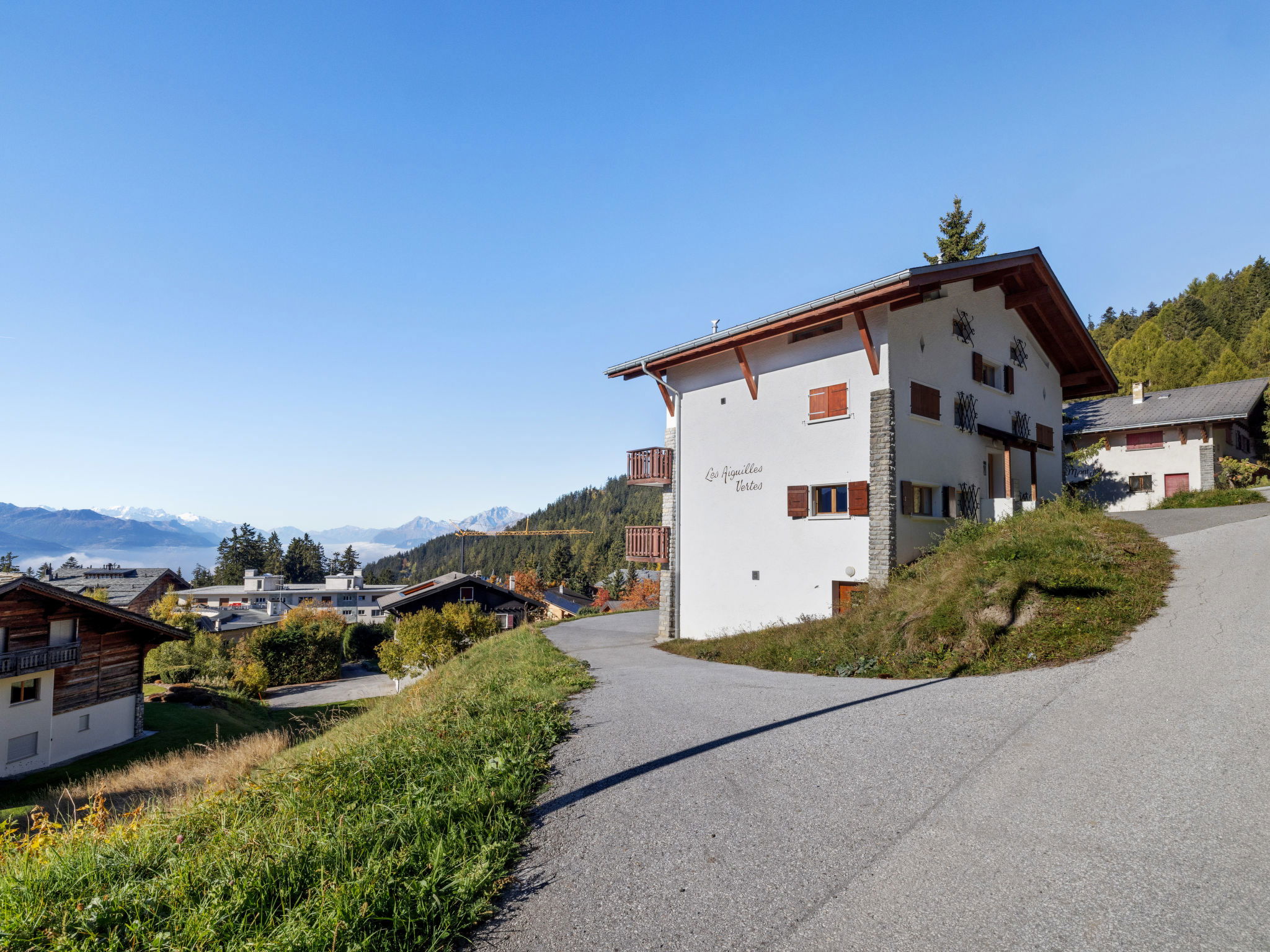Comfortable 3-family house "Les Aiguilles Vertes", 4 storeys, built in 1962, renovated in 2015. In the district of Vermala, 1.7 km from the centre of Montana, in a quiet, elevated position, 1.5 km from the lake, 1.1 km from the skiing area, south-west facing position. For shared use: natural state property 1'273 m2. In the house: storage room for skis, central heating system, washing machine, tumble dryer (for shared use), ski boot dryer. Motor access (ramp). Single garage. Shop 1.7 km, supermarket 1.9 km, restaurant 1.5 km, bakery 2 km, bus stop "Vermala Centre" 200 m, railway station "Funiculaire Montana Gare" 2.1 km, bathing lake "Moubra" 2.7 km, lake Grenon 1.5 km. Golf course (18 hole) 2.8 km, skisport facilities 1.1 km. Well-known ski regions can easily be reached: Etang Long 2.9 km. Please note: ski bus (free of charge). Additional accommodations can be booked.