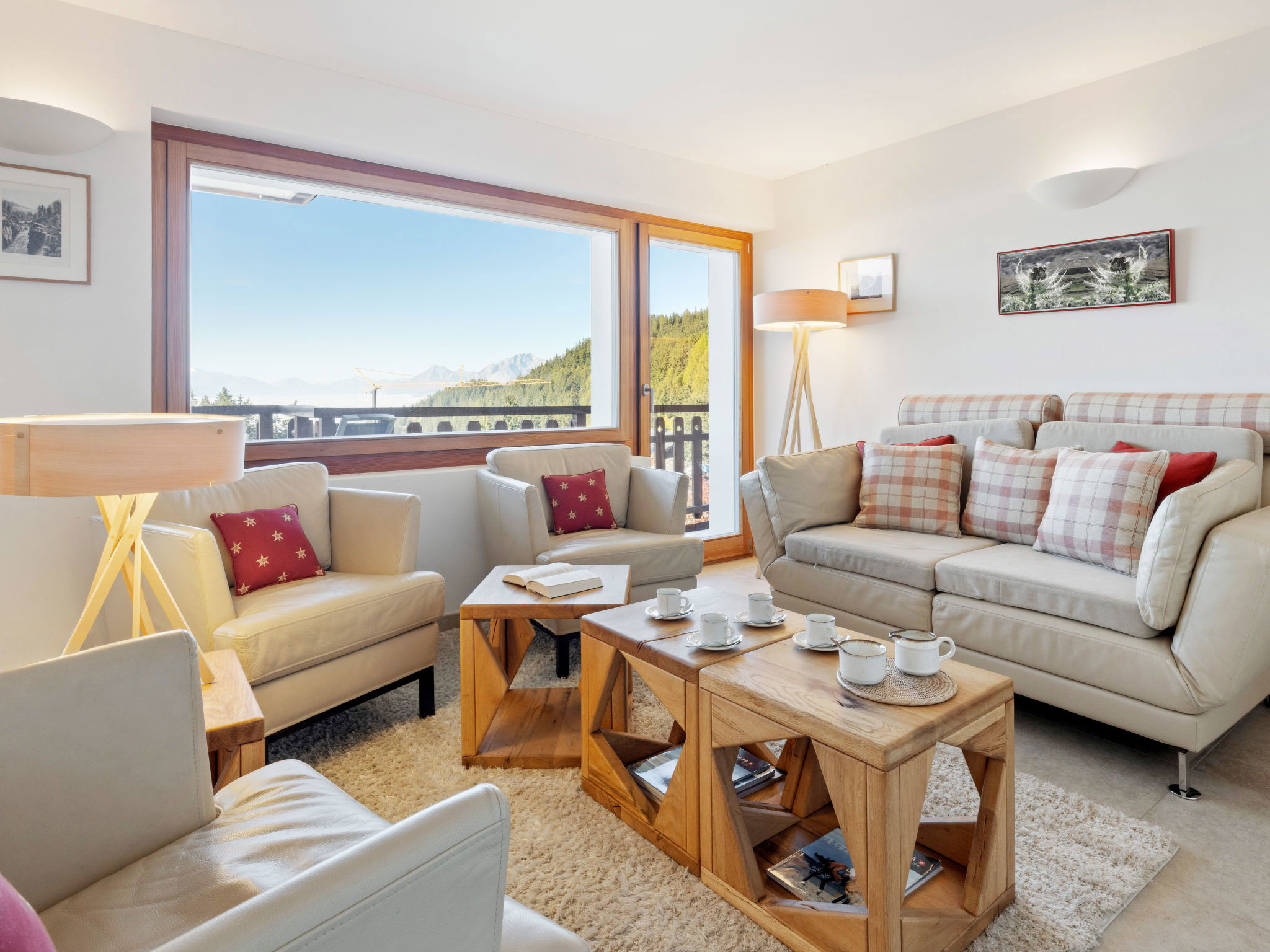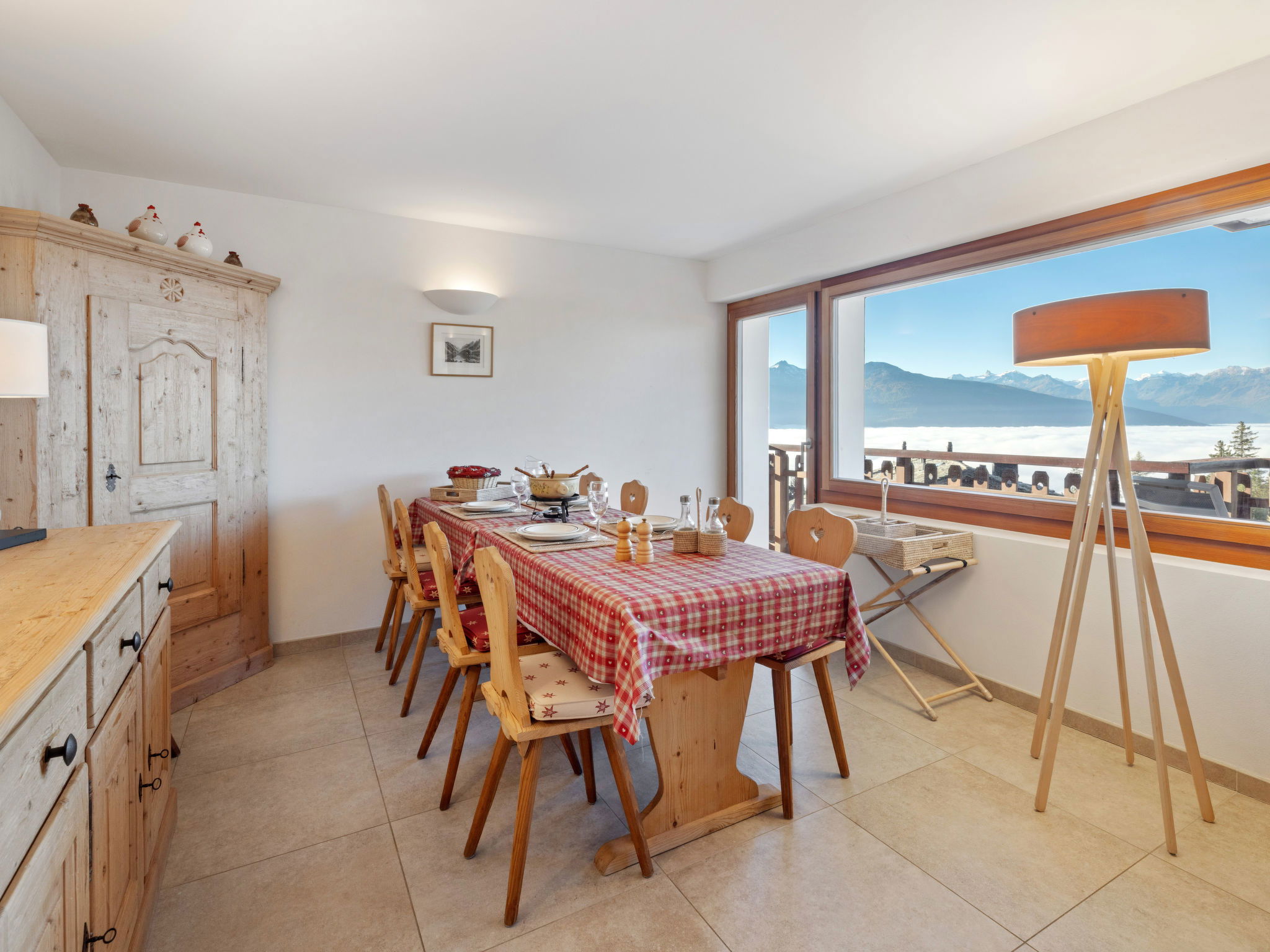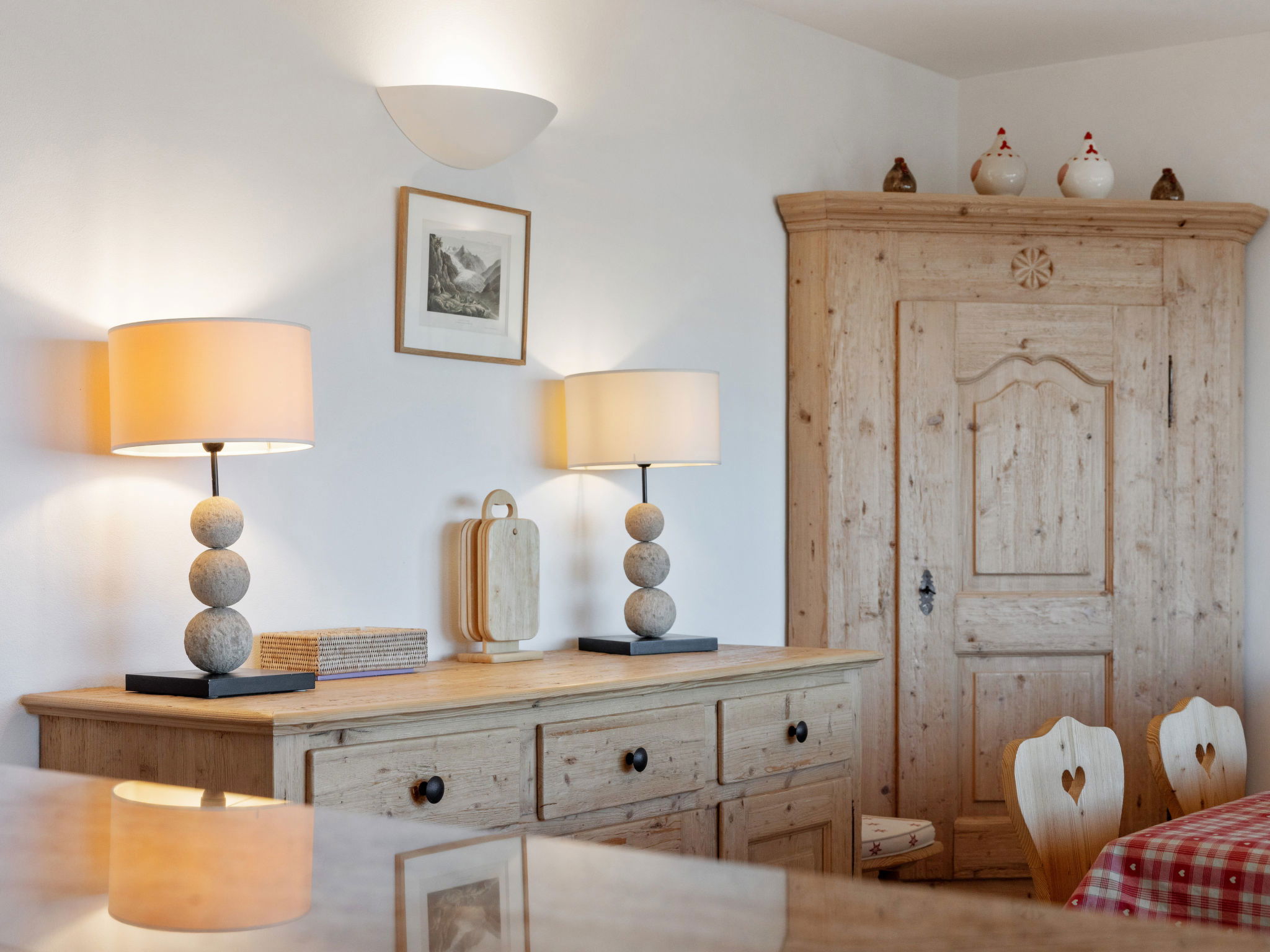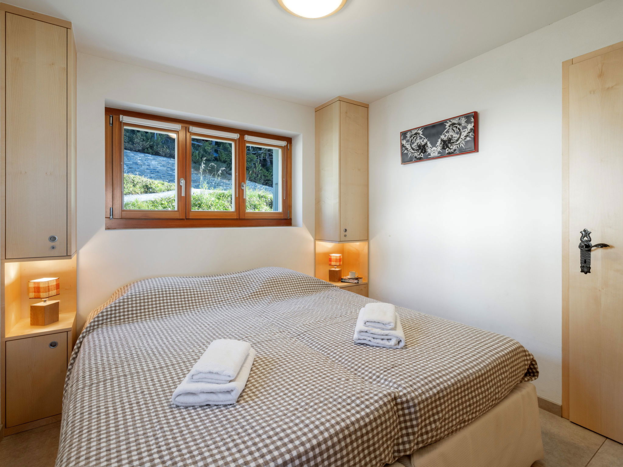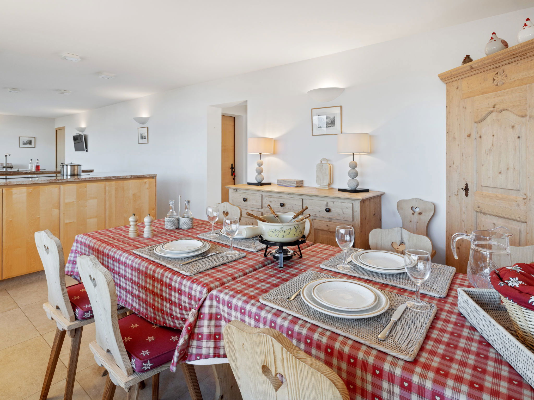 "Les Aiguilles Vertes Rez inférieur", 3-room apartment 70 m2, on the upper ground floor. Comfortable and cosy furnishings: living/dining room with cable TV. Exit to the balcony. 1 room with 2 beds (90 cm, length 200 cm), bath/WC. 1 room with 2 beds (90 cm, length 200 cm). Kitchen-/living room (oven, dishwasher, 4 induction hot plates, toaster, kettle, microwave, electric coffee machine, Capsules for coffee machine (Nespresso) extra, raclette grill, fondue Set (chinoise, cheese)). Shower/WC. Large balcony 20 m2, south-west facing position. Balcony furniture, deck chairs (2). Very beautiful view of the mountains and the countryside. Facilities: iron, hair dryer. Internet (WiFi, free). Garage space n 2, height 190 cm, width 230 cm. Please note: non-smokers only. Maximum 1 pet/ dog allowed. No lift.