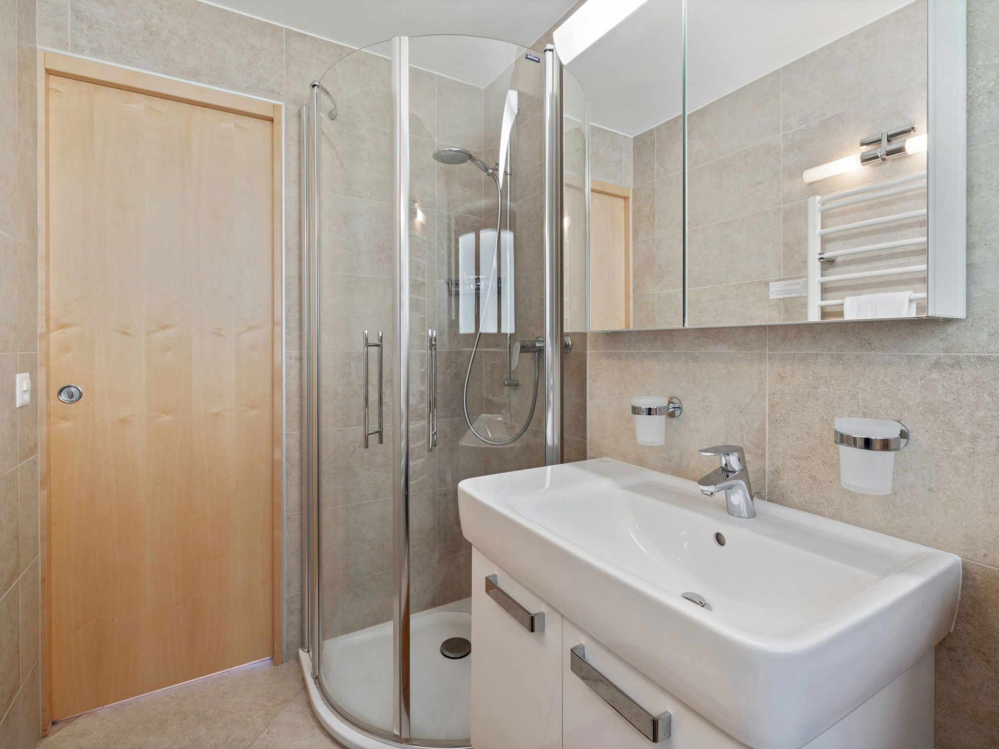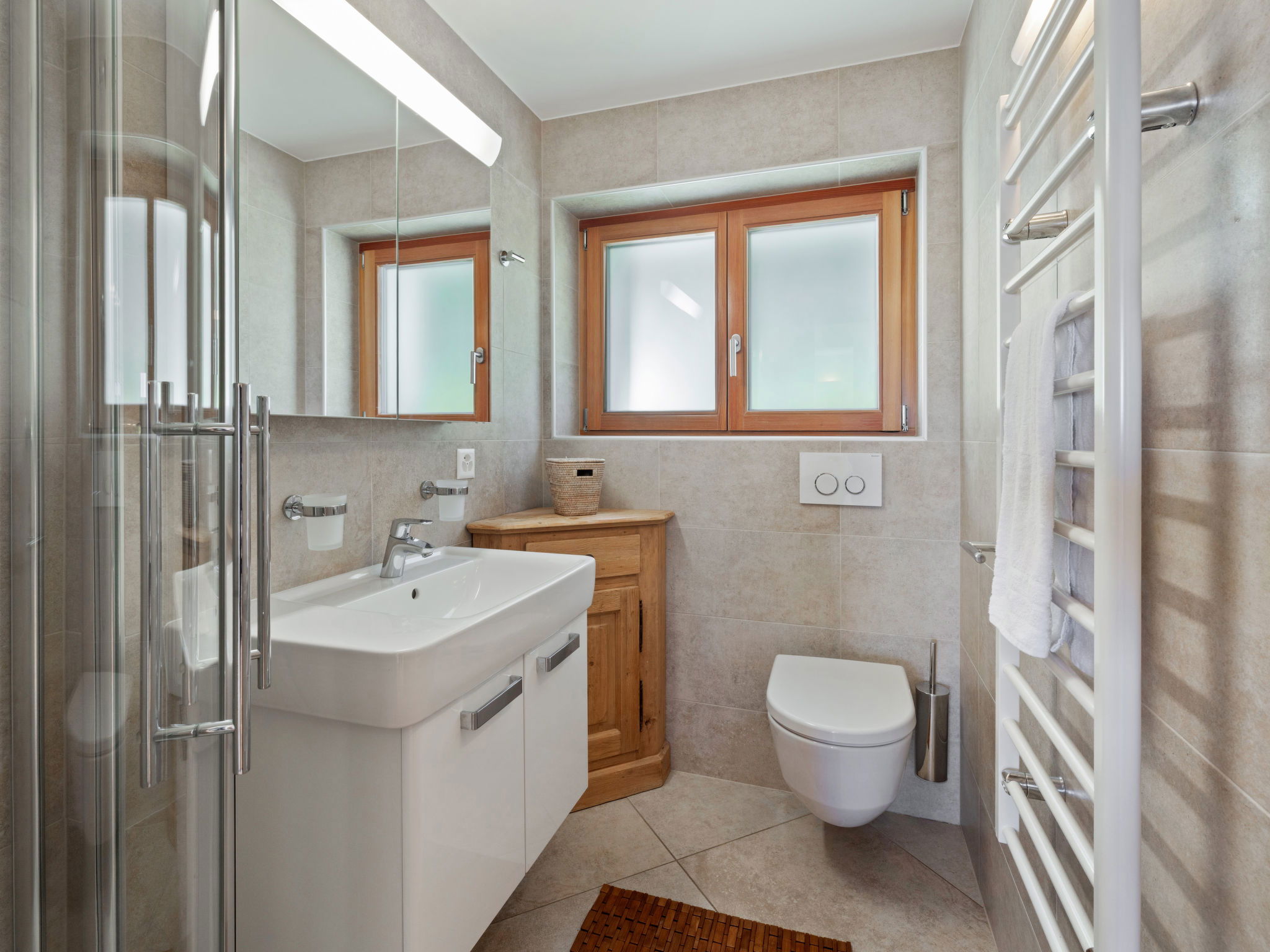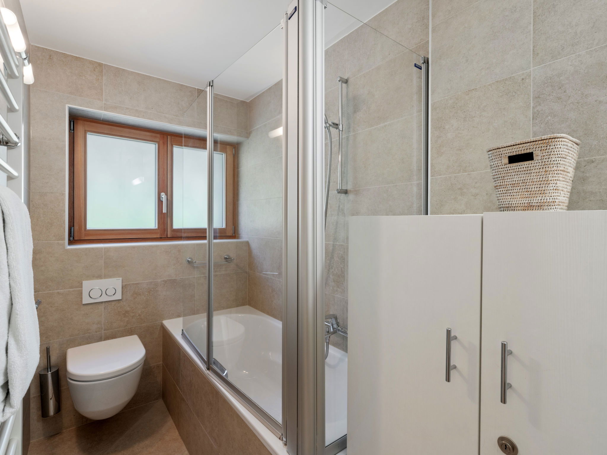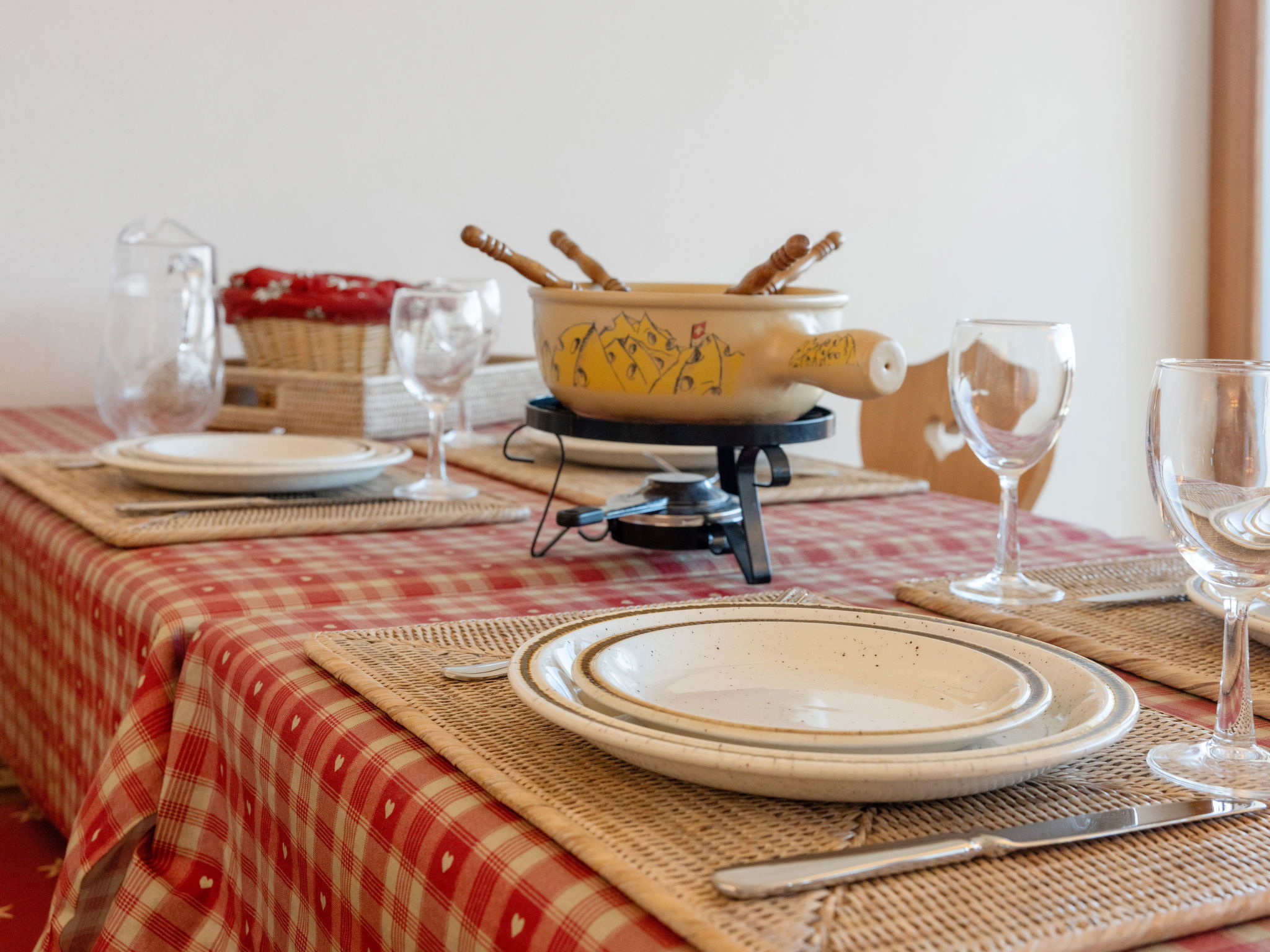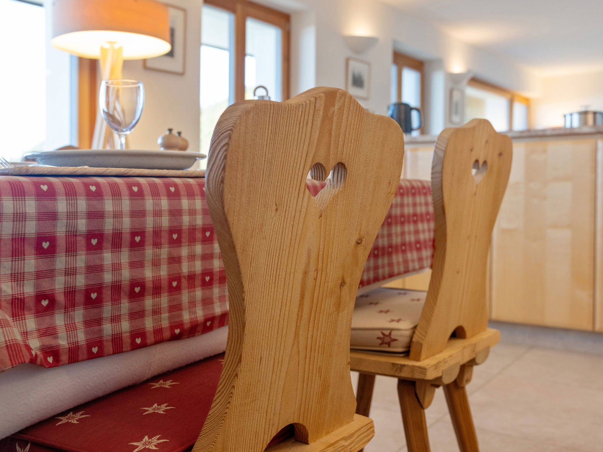 "Les Aiguilles Vertes Rez inférieur", 3-room apartment 70 m2, on the upper ground floor. Comfortable and cosy furnishings: living/dining room with cable TV. Exit to the balcony. 1 room with 2 beds (90 cm, length 200 cm), bath/WC. 1 room with 2 beds (90 cm, length 200 cm). Kitchen-/living room (oven, dishwasher, 4 induction hot plates, toaster, kettle, microwave, electric coffee machine, Capsules for coffee machine (Nespresso) extra, raclette grill, fondue Set (chinoise, cheese)). Shower/WC. Large balcony 20 m2, south-west facing position. Balcony furniture, deck chairs (2). Very beautiful view of the mountains and the countryside. Facilities: iron, hair dryer. Internet (WiFi, free). Garage space n 2, height 190 cm, width 230 cm. Please note: non-smokers only. Maximum 1 pet/ dog allowed. No lift.