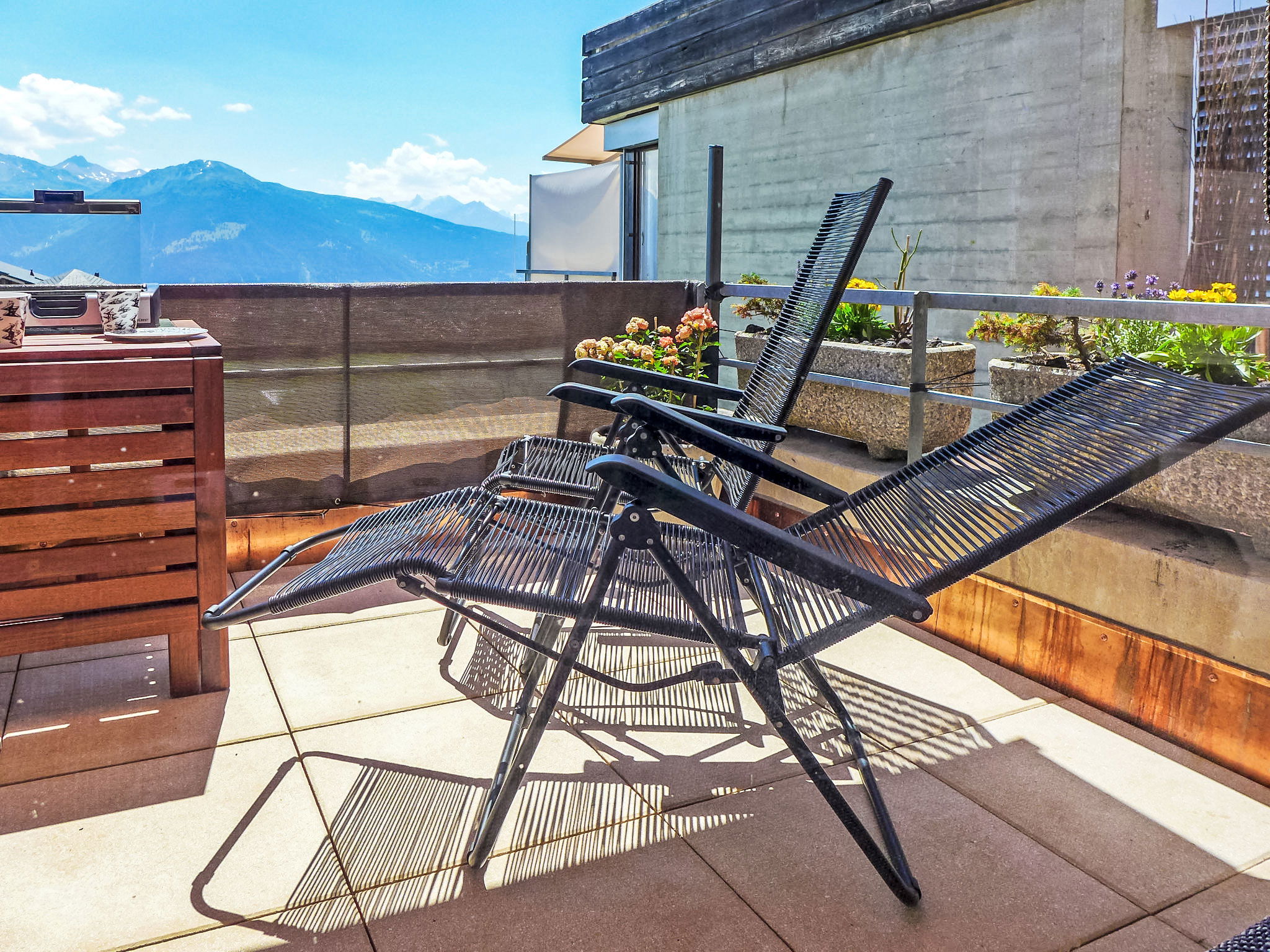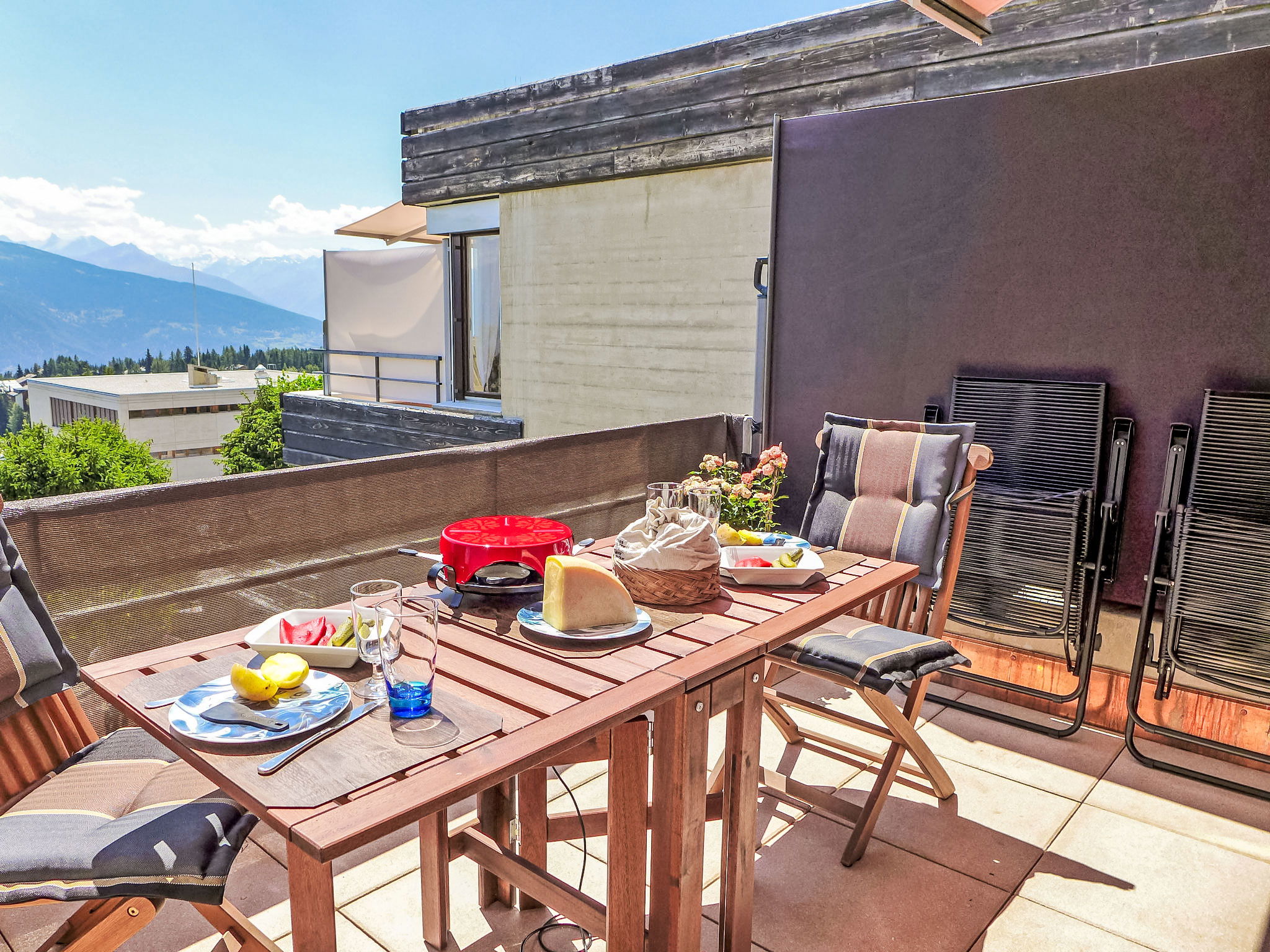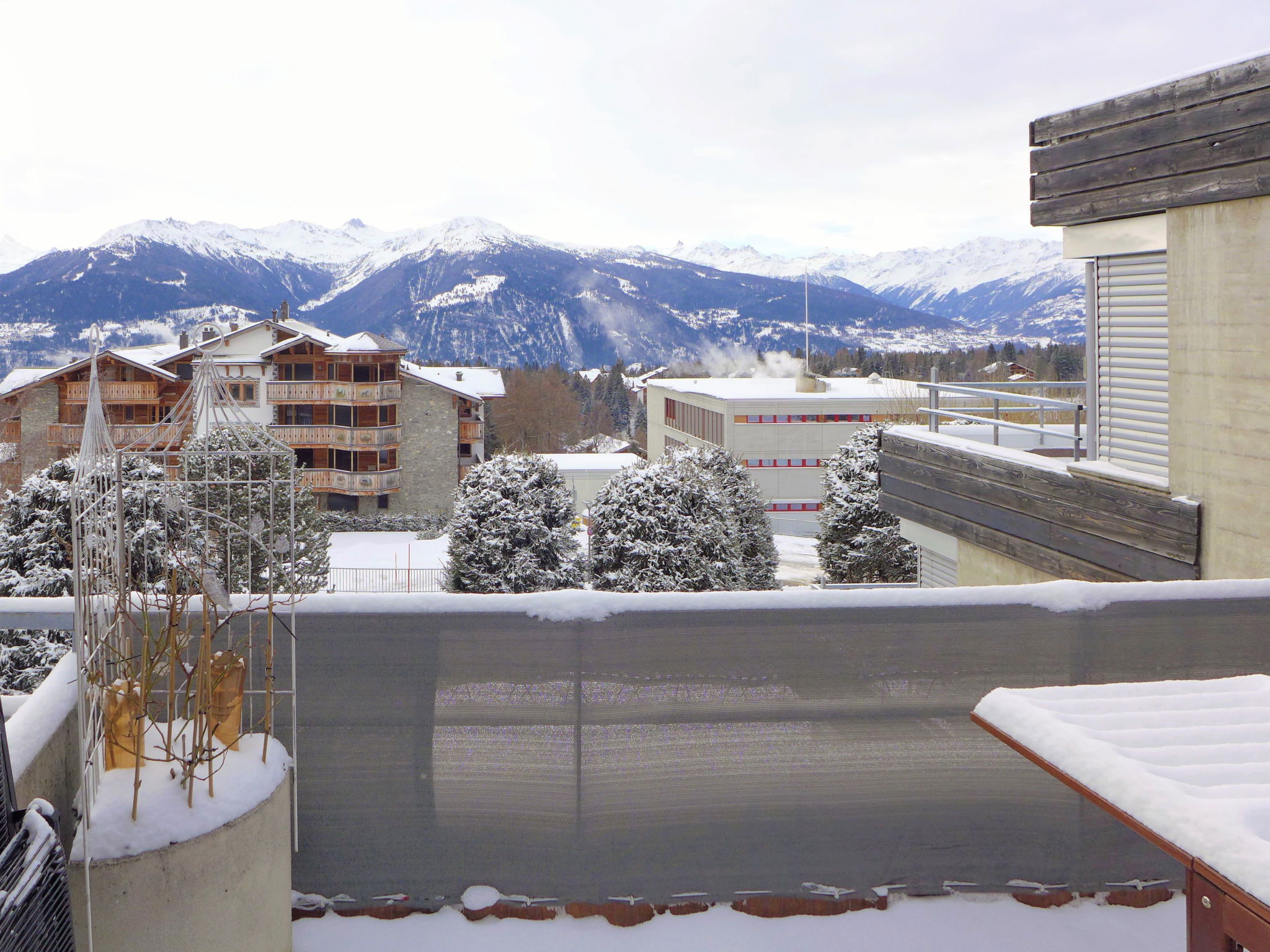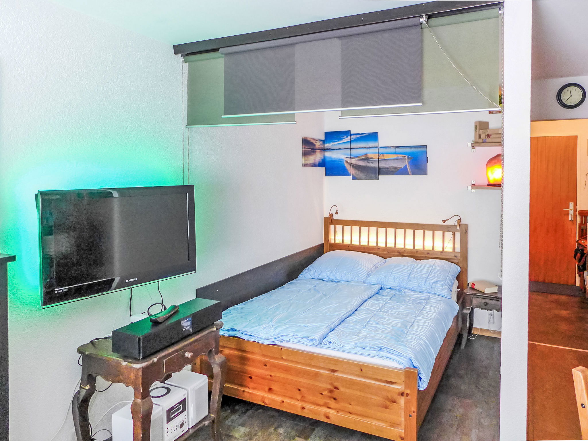 "Jeanne D'Arc Apt. E-36", 1-room studio 33 m2 on 2nd floor. Beautiful furnishings: living/sleeping room with 1 french bed (140 cm, length 200 cm), cable TV (flat screen), radio and CD-player. Exit to the balcony, south facing position. Kitchen (oven, dishwasher, 4 induction hot plates, toaster, kettle, microwave, electric coffee machine, Capsules for coffee machine (Nespresso) extra, raclette grill, fondue Set (chinoise, cheese)). Bath/WC. Balcony, south facing position. Balcony furniture, electric barbecue. Beautiful view of the mountains. Facilities: hair dryer. Internet (WiFi, free). Garage space n 66, height 200 cm, width 210 cm. Please note: non-smokers only. Maximum 1 pet/ dog allowed. Washing machine and dryer available in the building / sector E.