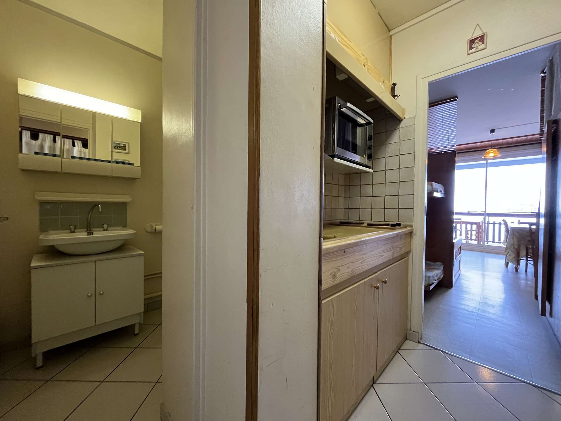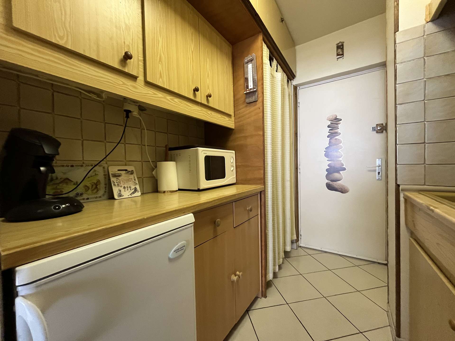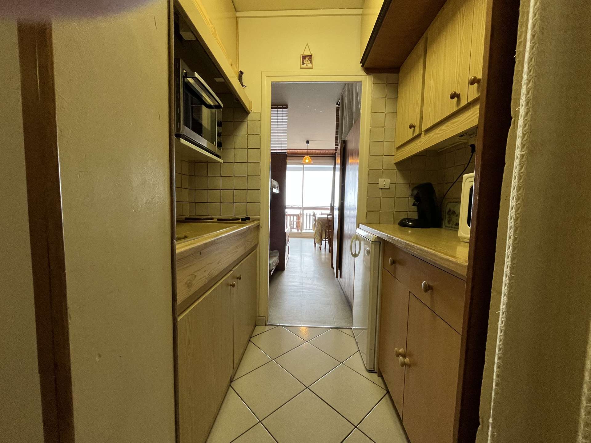 It includes an entrance hall leading to the shower room/WC, a separate kitchen equipped with a microwave, oven, electric hob, electric coffee maker and raclette grill...