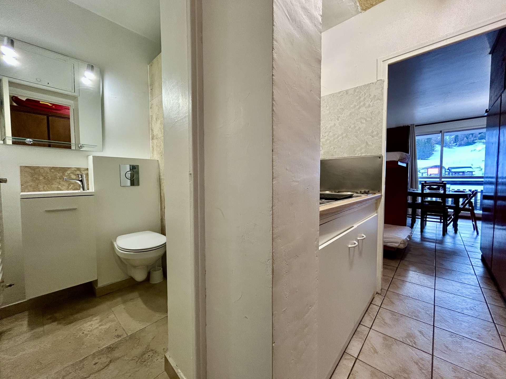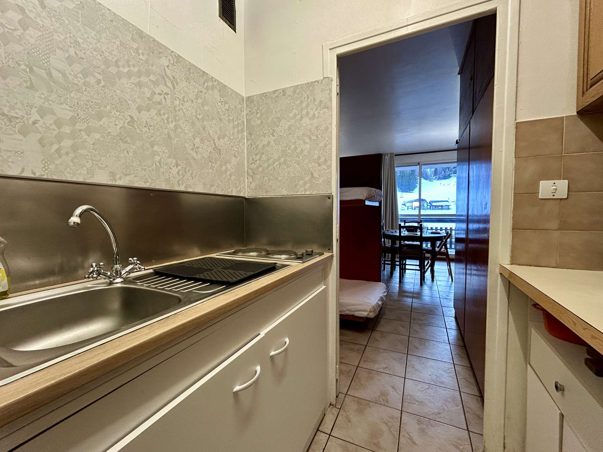 It includes an entrance leading to the bathroom with WC, a separate kitchen equipped with a microwave, a refrigerator, a mini oven, 2 electric hobs, a Senseo coffee maker, a raclette machine... The living room includes the sleeping area with a bunk bed in 80x190, a sofa bed in 140x190 with TV.