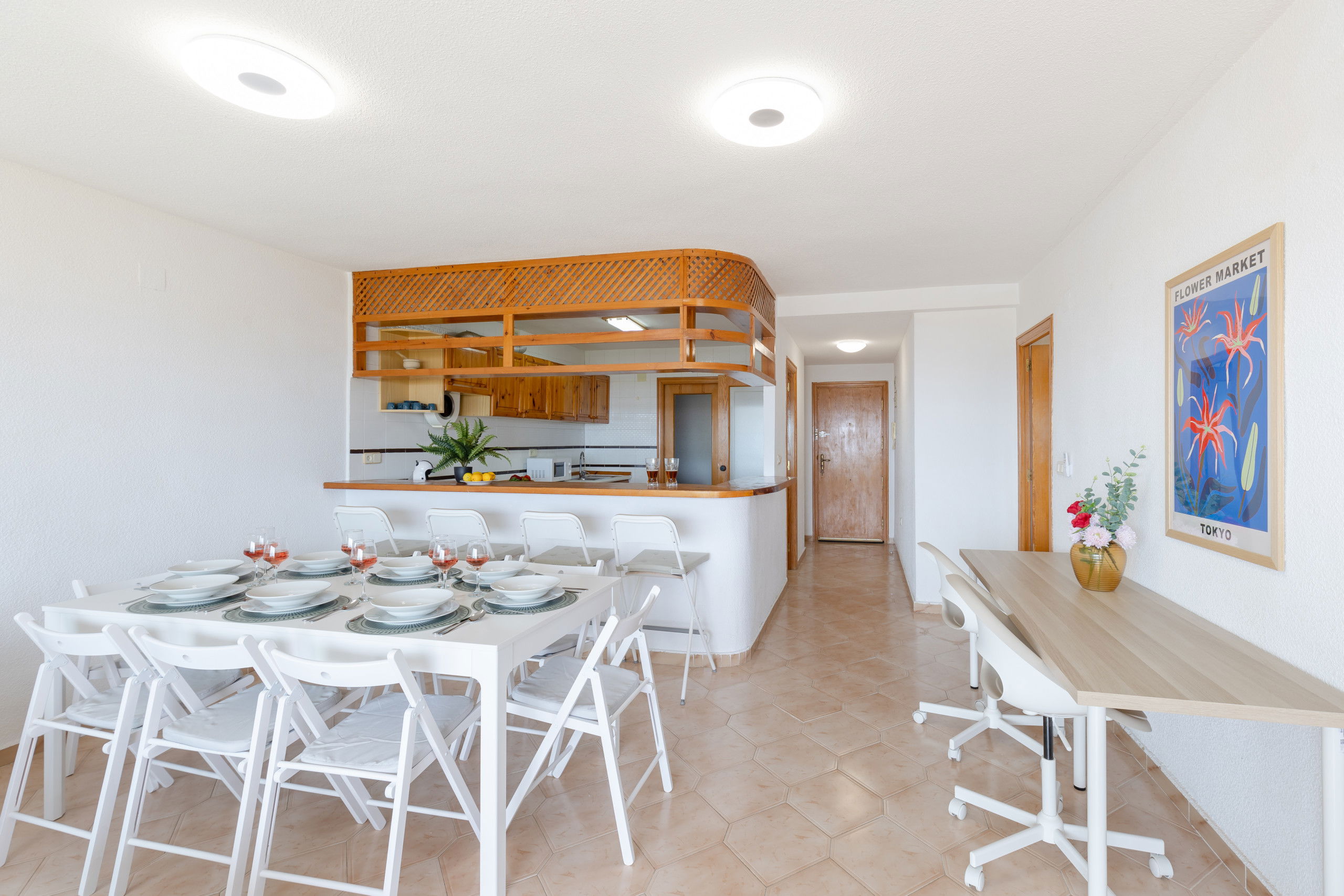 Upon entering, you will be greeted by an American-style kitchen fully equipped, complete with a modern bar that invites lively conversations while preparing delicious meals. The two bathrooms ensure comfort and privacy for all guests, with impeccable facilities and fresh towels always at hand.