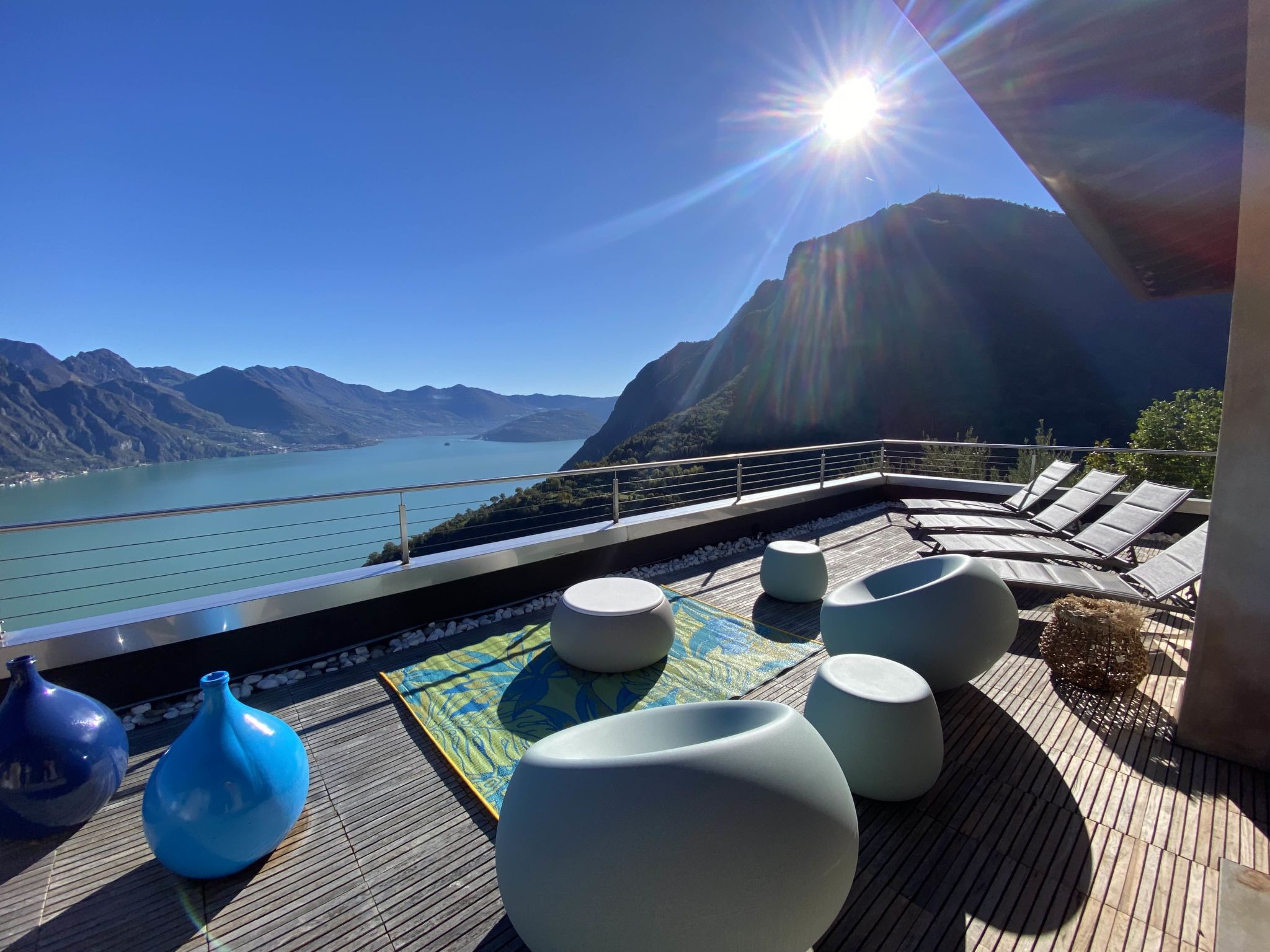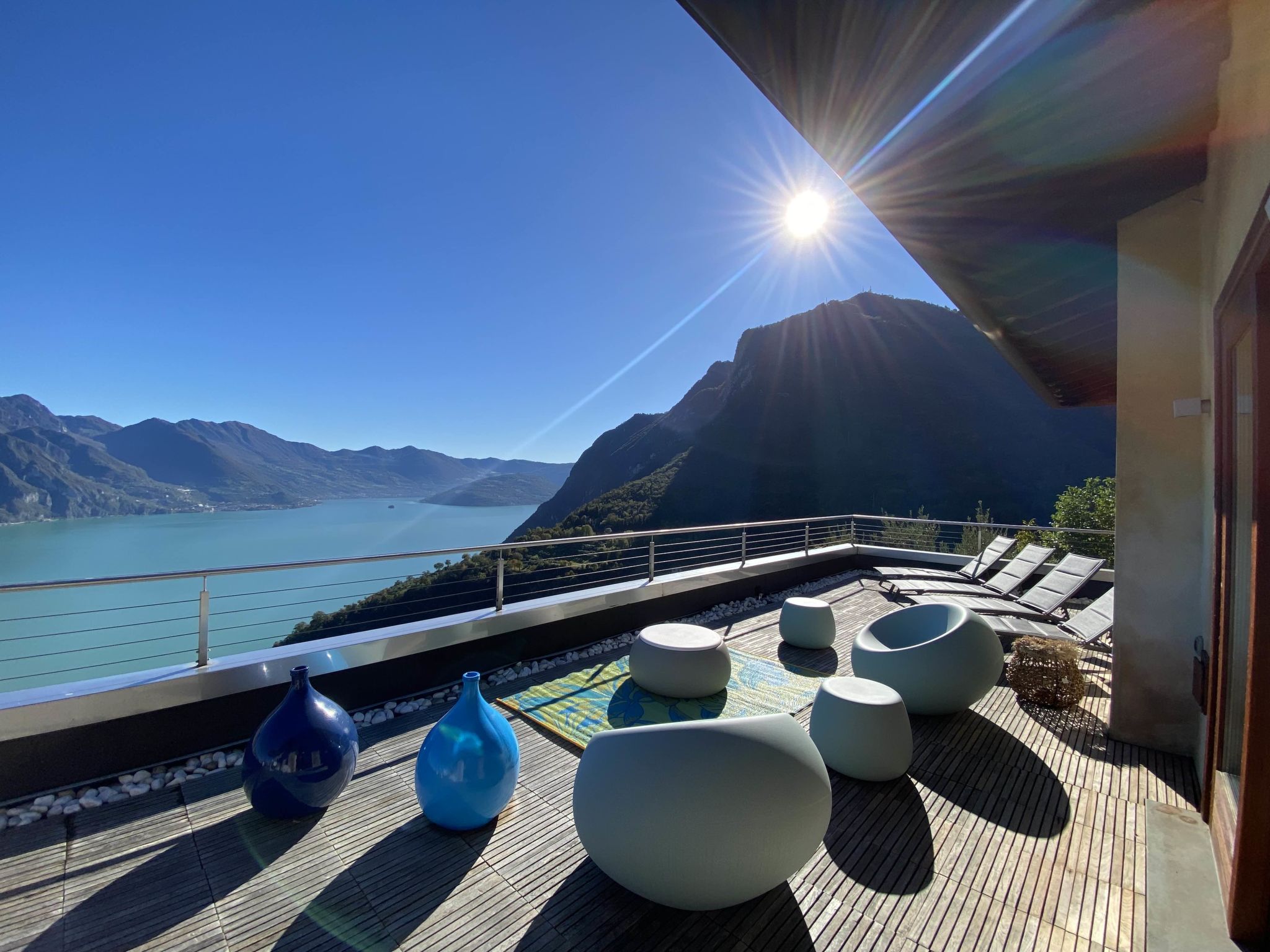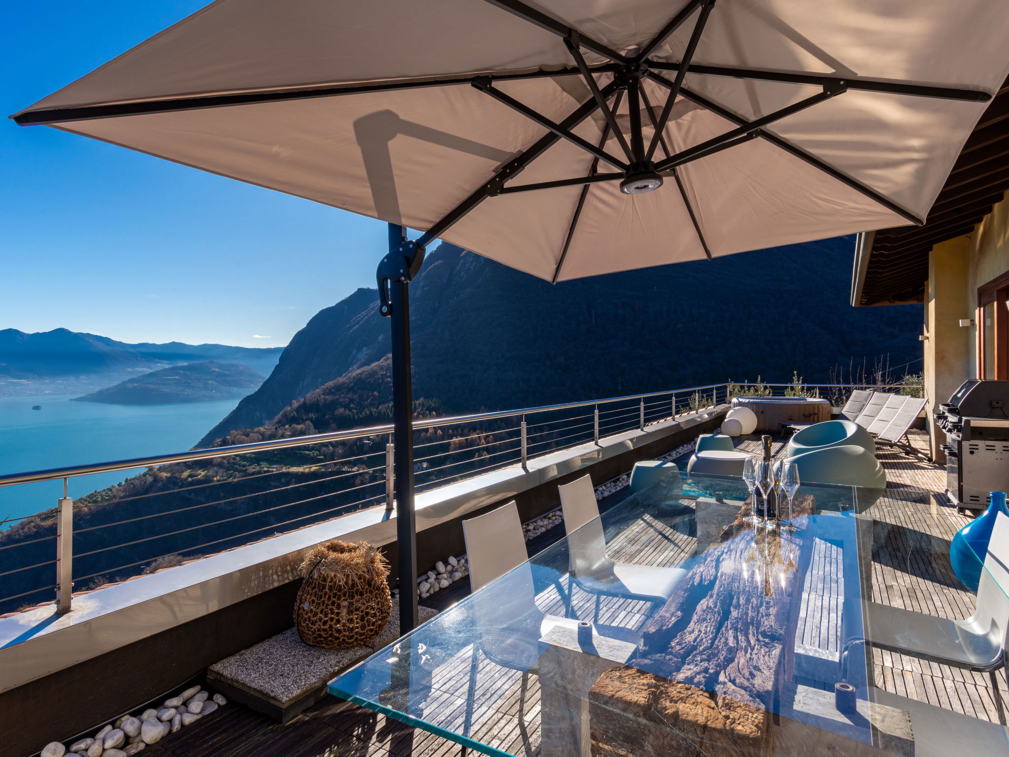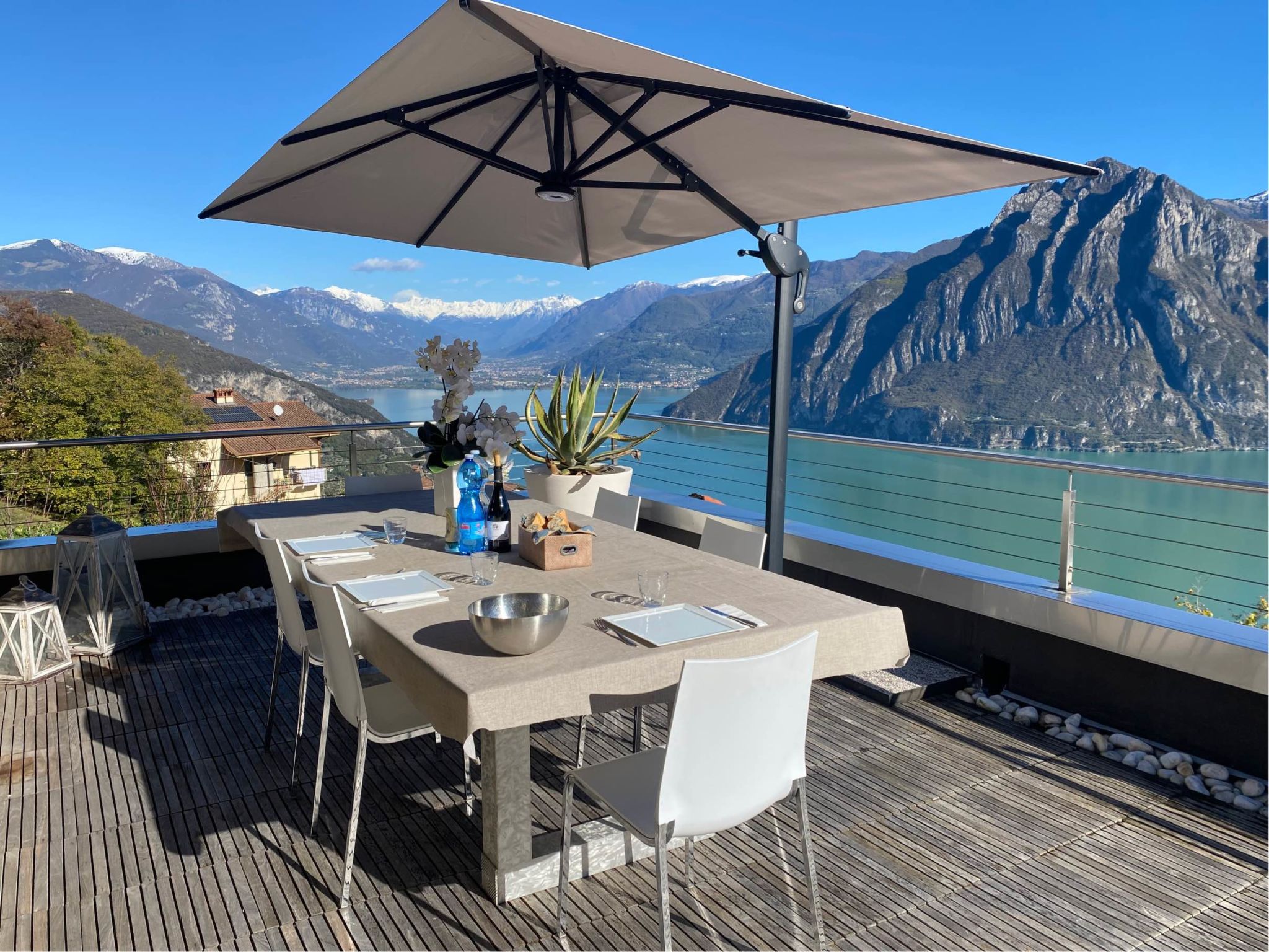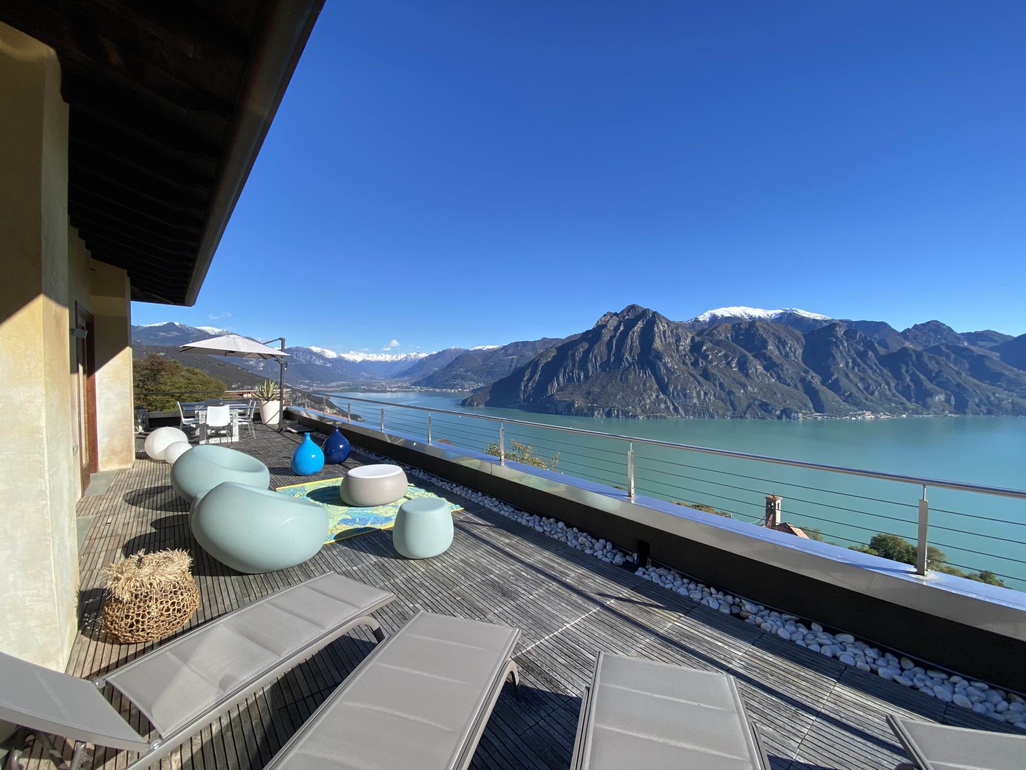 4-room apartment 160 m2 on 2nd floor, east facing position. Spacious and bright, modern and stylish furnishings: large living/dining room with panoramic window with Scandinavian wood stove (only for decoration), dining table, TV, hi-fi system and air conditioning. Exit to the terrace. 1 double bedroom with panoramic window with bath/bidet/WC, TV and air conditioning. Exit to the terrace. 1 double bedroom with 1 french bed (140 cm, length 190 cm), shower/bidet/WC. 1 double bedroom. Exit to the terrace. Open kitchen (oven, dishwasher, 4 induction hot plates, 5 gas rings, toaster, kettle, electric coffee machine, Capsules for coffee machine (Nespresso), cooking island, combination microwave) with double hand-basin. Shower/bidet/WC, sep. WC, hydro massage bath. Heating. Parquet floors, natural stone floors. Large terrace, garden, lawn. Terrace furniture, barbecue, deck chairs (6). Very beautiful panoramic view of the lake and the mountains. Facilities: washing machine, iron, children's high chair, baby cot, hair dryer. Internet (WiFi, free). Please note: fridge without freezer, non-smoking house. Maximum 1 pet/ dog allowed. Private entrance. No mandatory extra charges to be paid on-site. IT016102C2Z3PYG6HL