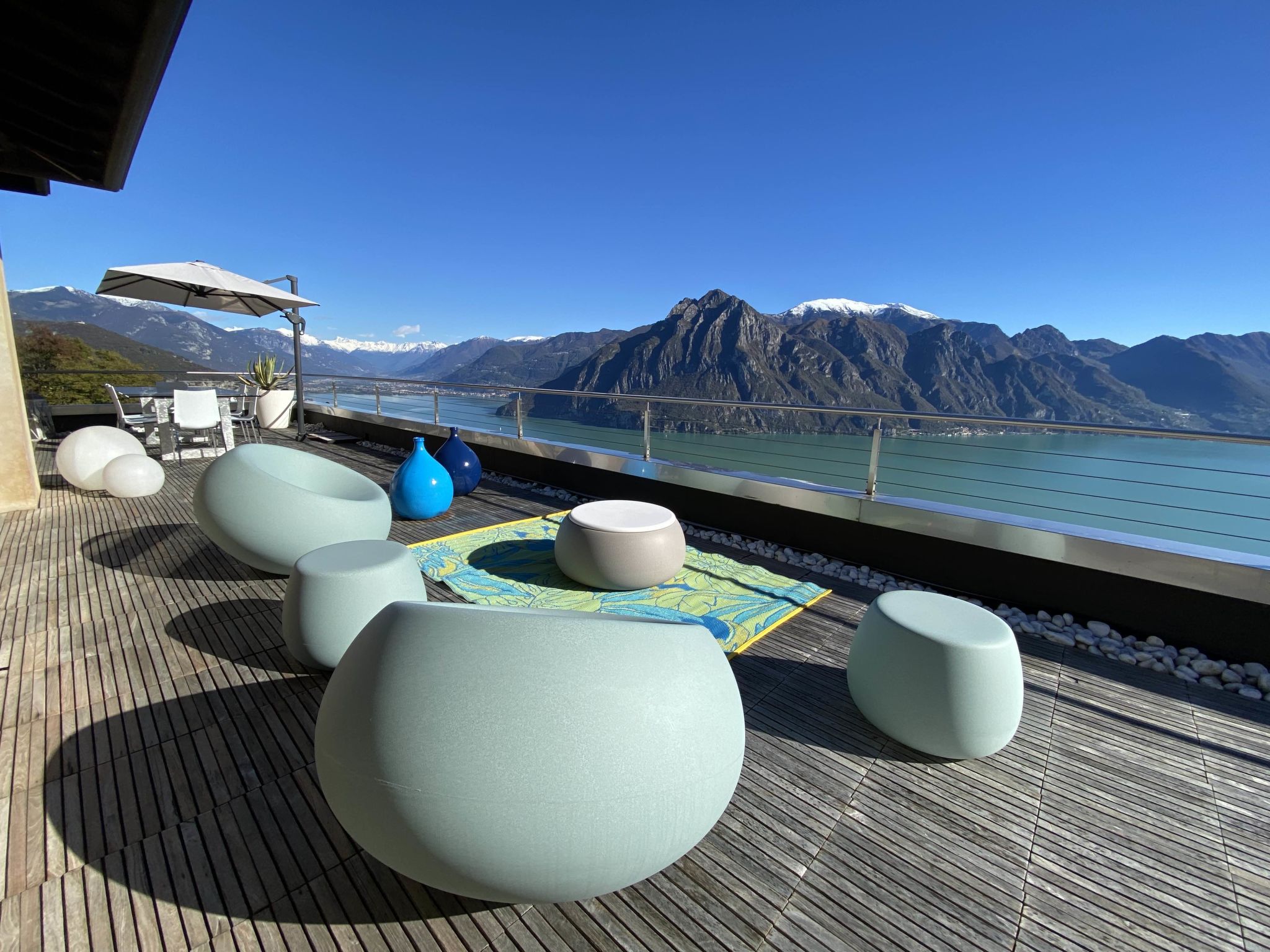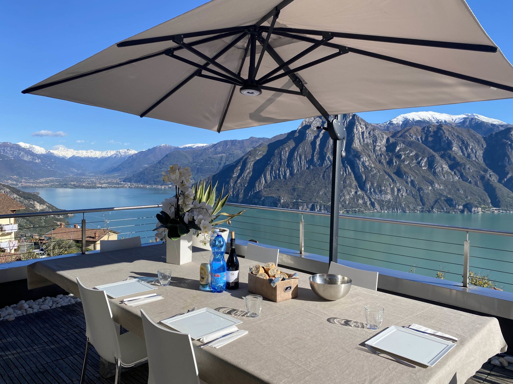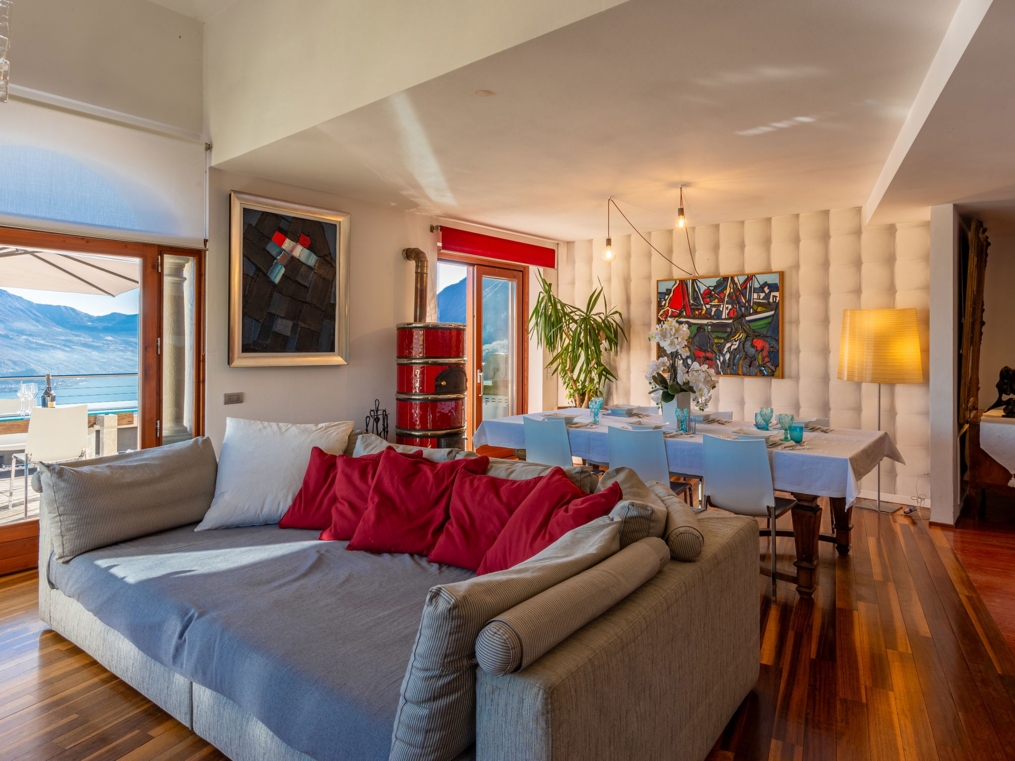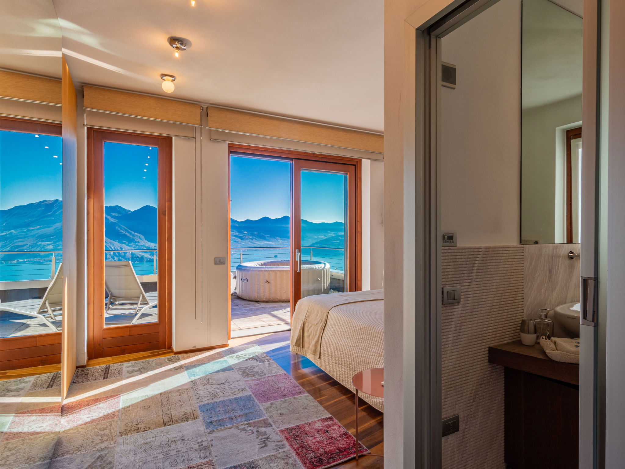 4-room apartment 160 m2 on 2nd floor, east facing position. Spacious and bright, modern and stylish furnishings: large living/dining room with panoramic window with Scandinavian wood stove (only for decoration), dining table, TV, hi-fi system and air conditioning. Exit to the terrace. 1 double bedroom with panoramic window with bath/bidet/WC, TV and air conditioning. Exit to the terrace. 1 double bedroom with 1 french bed (140 cm, length 190 cm), shower/bidet/WC. 1 double bedroom. Exit to the terrace. Open kitchen (oven, dishwasher, 4 induction hot plates, 5 gas rings, toaster, kettle, electric coffee machine, Capsules for coffee machine (Nespresso), cooking island, combination microwave) with double hand-basin. Shower/bidet/WC, sep. WC, hydro massage bath. Heating. Parquet floors, natural stone floors. Large terrace, garden, lawn. Terrace furniture, barbecue, deck chairs (6). Very beautiful panoramic view of the lake and the mountains. Facilities: washing machine, iron, children's high chair, baby cot, hair dryer. Internet (WiFi, free). Please note: fridge without freezer, non-smoking house. Maximum 1 pet/ dog allowed. Private entrance. No mandatory extra charges to be paid on-site. IT016102C2Z3PYG6HL