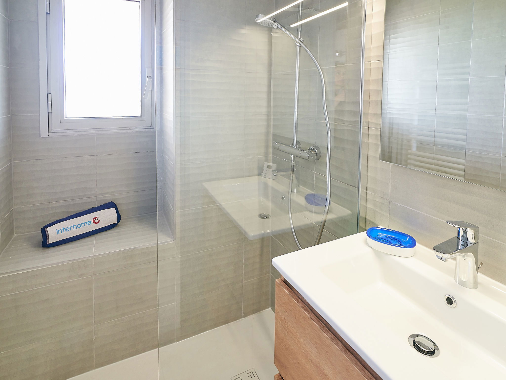 2-room apartment 27 m2 on 3rd floor. Living/dining room with 1 double sofabed (1 x 140 cm, length 190 cm), TV, electric heating and air conditioning. Exit to the terrace. 1 room with 1 french bed (1 x 140 cm, length 190 cm), air conditioning. Kitchenette (2 ceramic glass hob hotplates, toaster, kettle, electric coffee machine, combination microwave). Shower, sep. WC. Electric heating. Terrace 12 m2, south-east facing position terrace 6 m2, south-west facing position. View of the sea. Facilities: washing machine, iron, hair dryer. Internet (WiFi, extra). Parking space n 6. Please note: non-smokers only. Maximum 1 pet/ dog allowed. Smoke alarm.