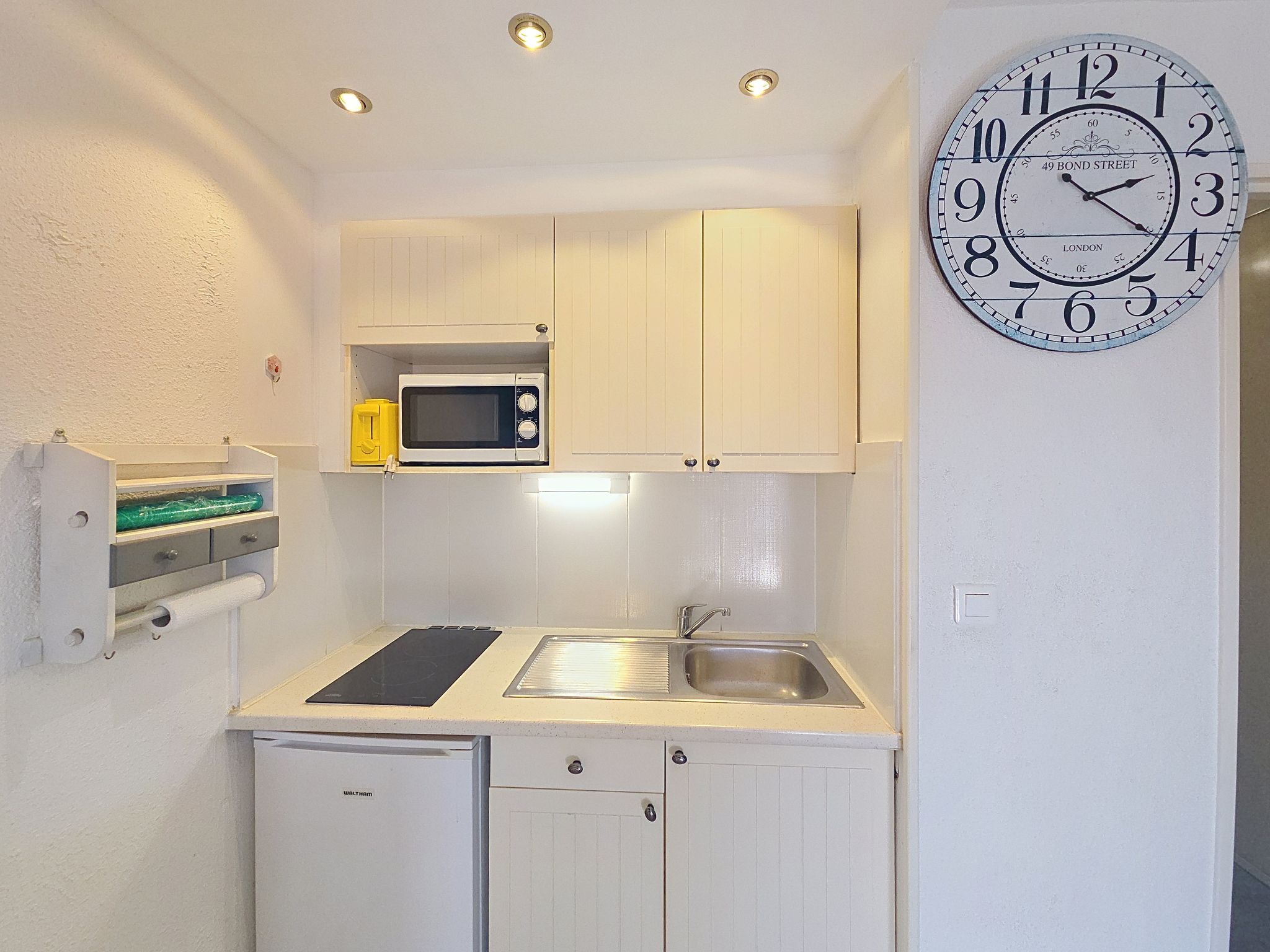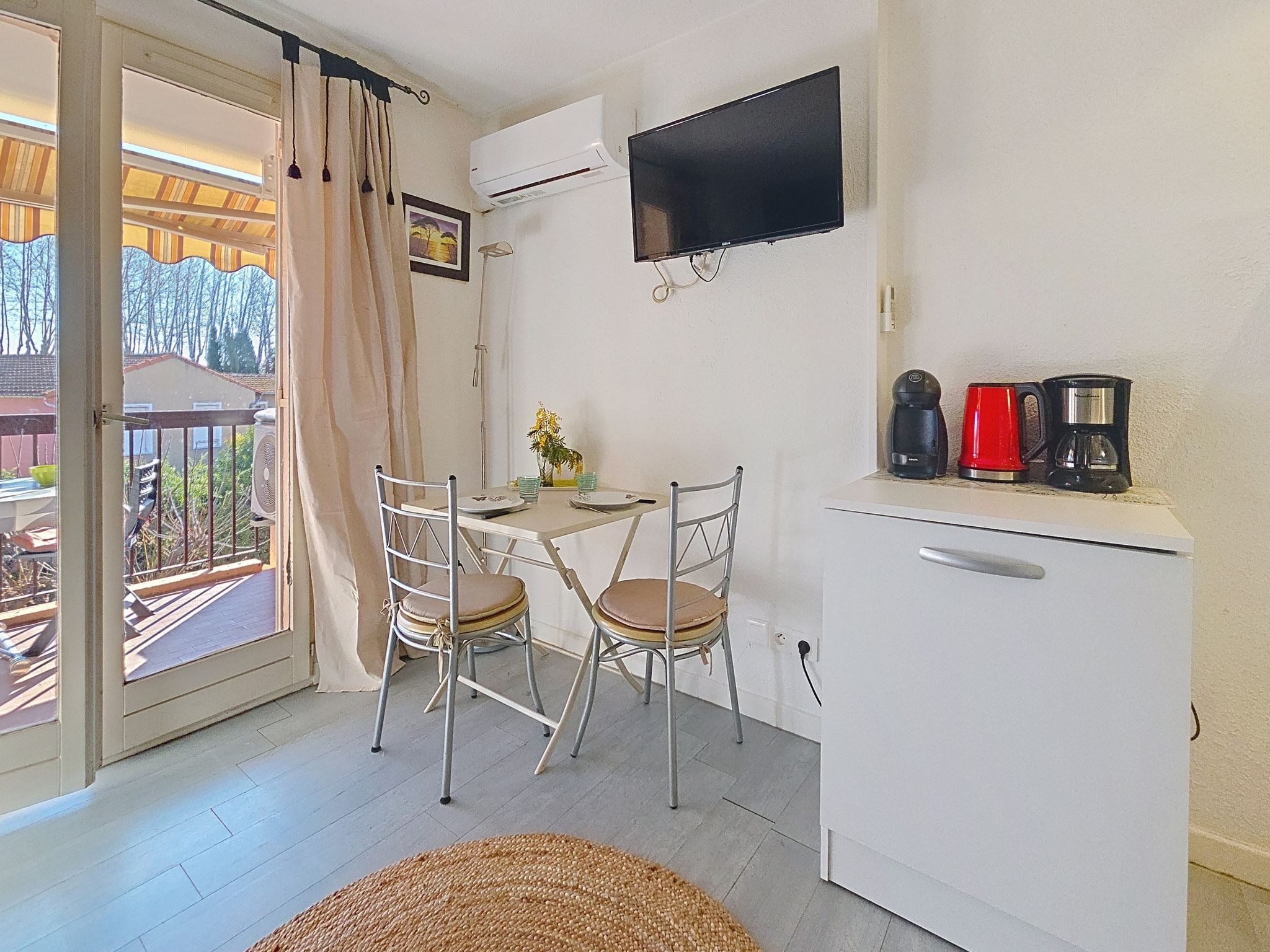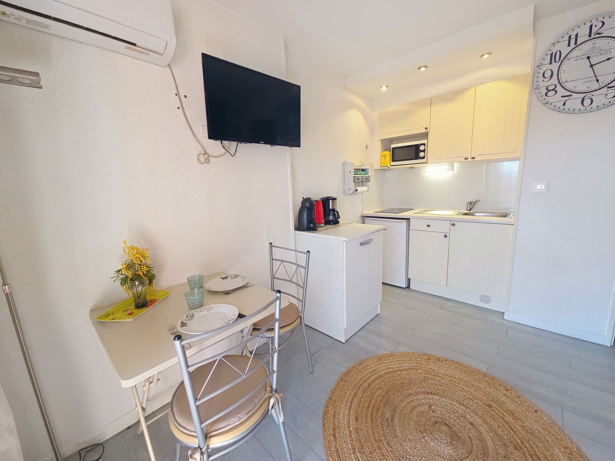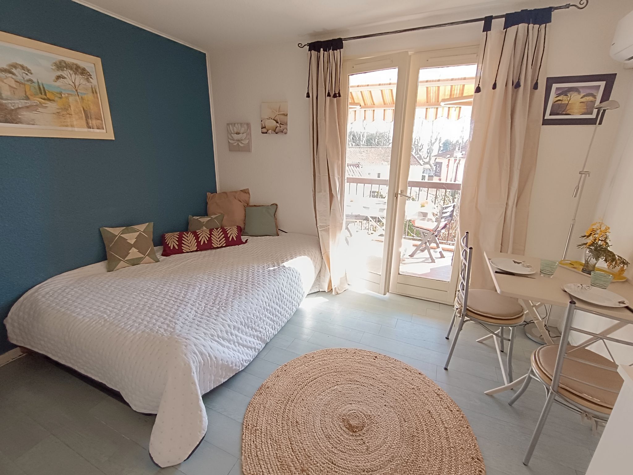 1-room studio 20 m2 on 2nd floor. Living/sleeping room with 1 double sofabed (1 x 140 cm, length 190 cm), TV and air conditioning. Exit to the terrace. Kitchenette (2 induction hot plates, toaster, kettle, microwave, electric coffee machine, Capsules for coffee machine (Dolce Gusto) extra) with dining table. Shower/WC. Electric heating. Terrace 6 m2, east facing position. Terrace furniture. Facilities: iron, hair dryer. Internet (WiFi, extra). Parking space n 30. Please note: maximum 1 small pet/ dog allowed. TV only FR. Smoke alarm. Offer by a private individual according to  Art. 155, IV of CGI. FJS3203HTH