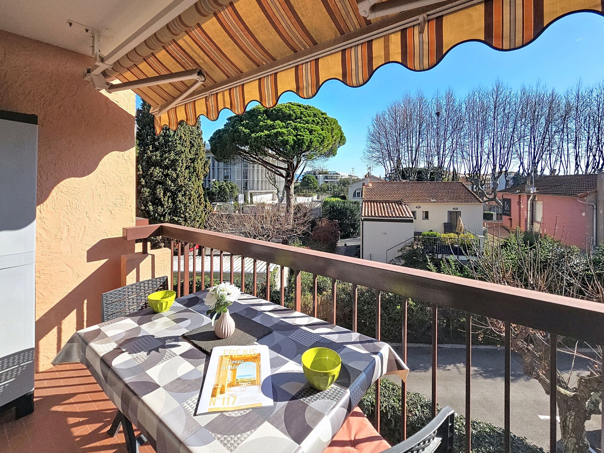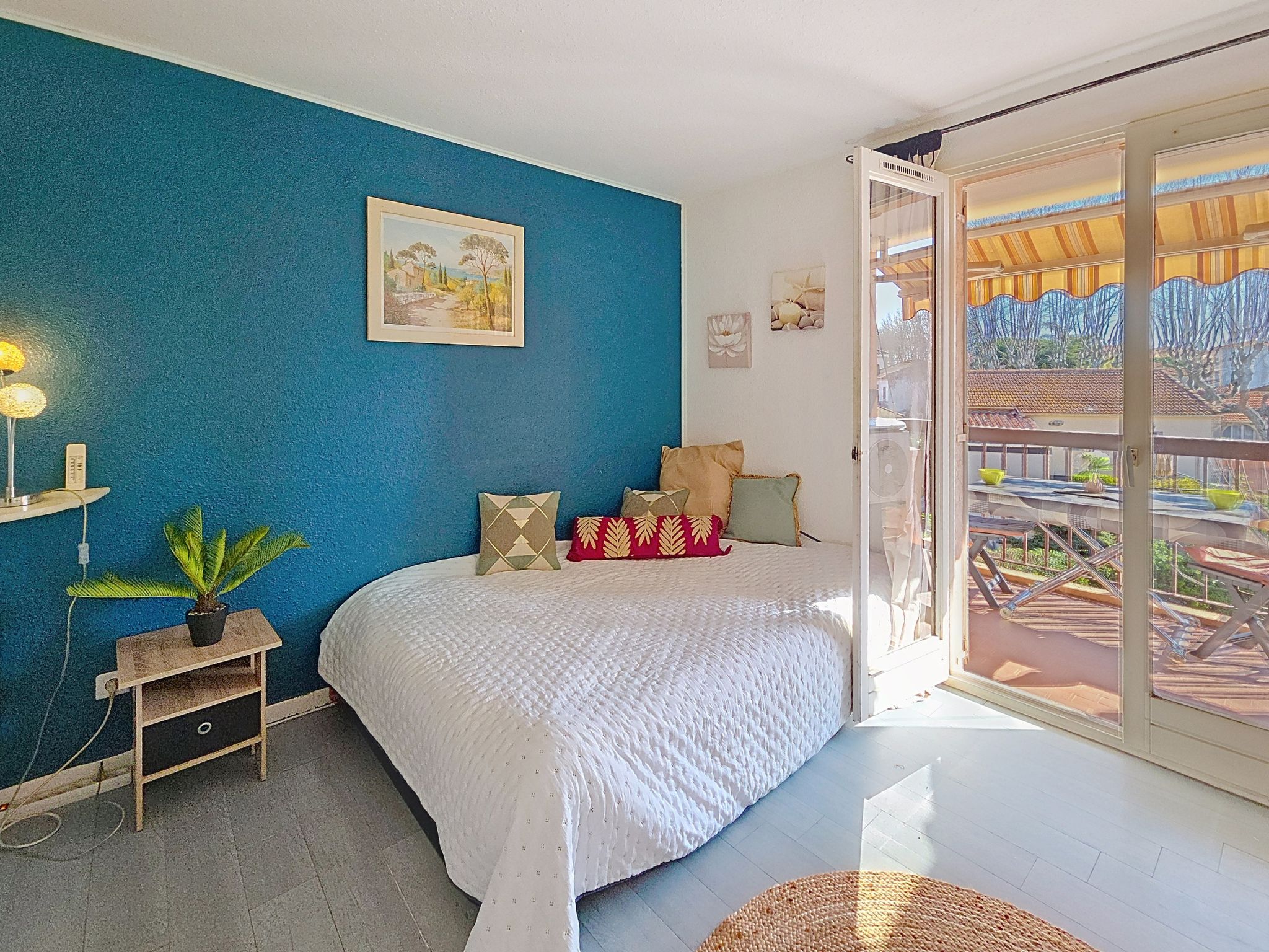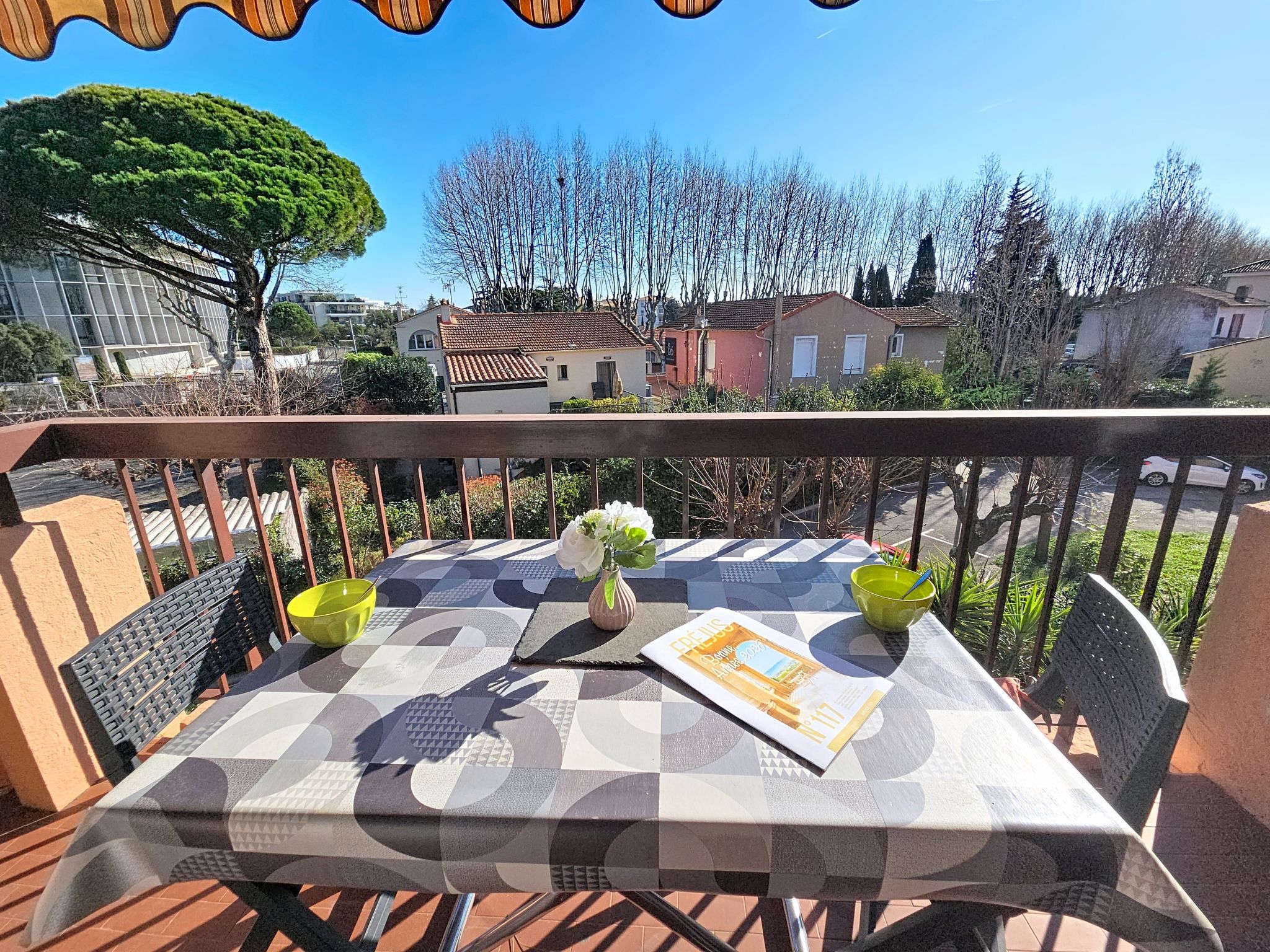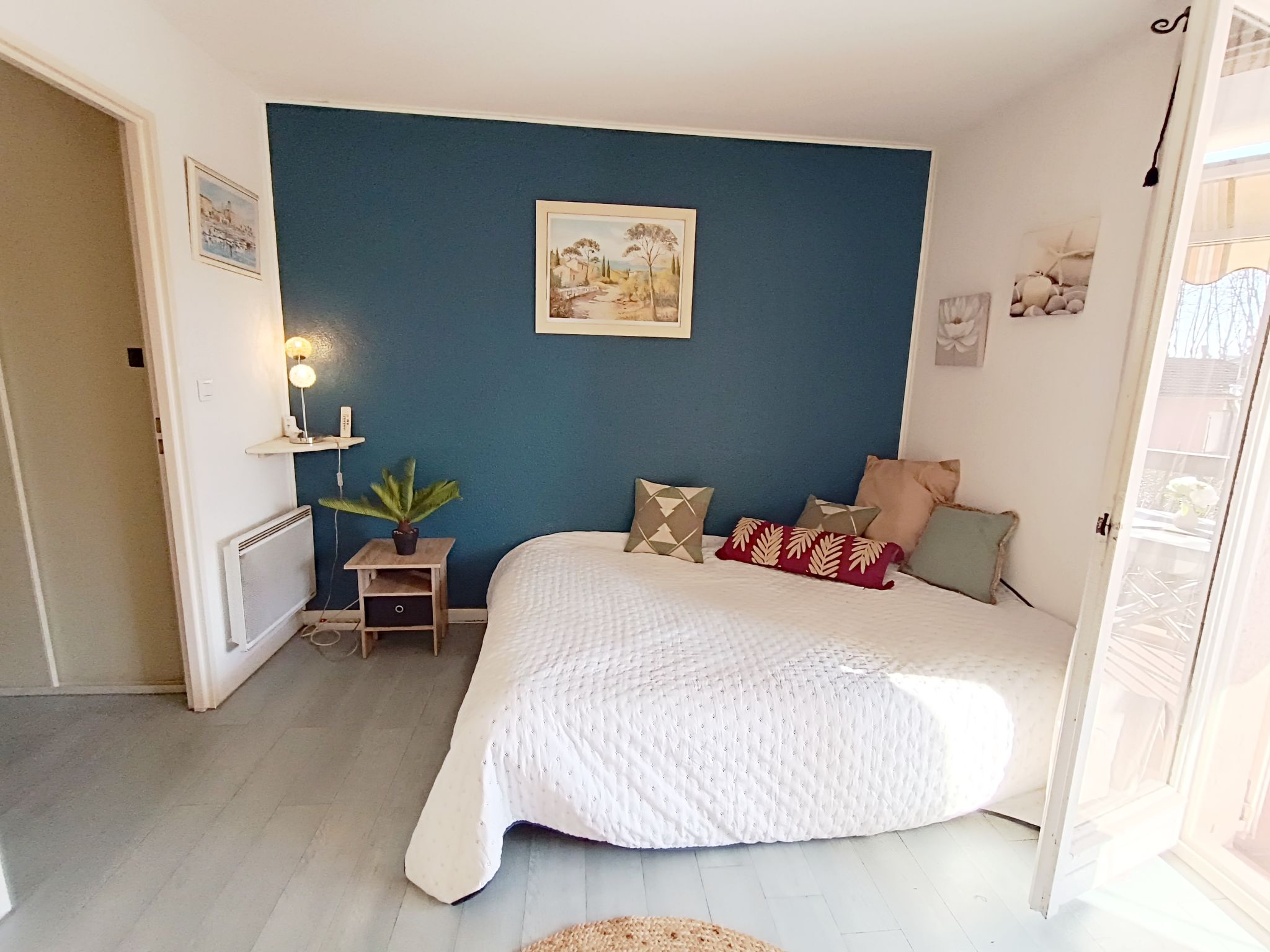 1-room studio 20 m2 on 2nd floor. Living/sleeping room with 1 double sofabed (1 x 140 cm, length 190 cm), TV and air conditioning. Exit to the terrace. Kitchenette (2 induction hot plates, toaster, kettle, microwave, electric coffee machine, Capsules for coffee machine (Dolce Gusto) extra) with dining table. Shower/WC. Electric heating. Terrace 6 m2, east facing position. Terrace furniture. Facilities: iron, hair dryer. Internet (WiFi, extra). Parking space n 30. Please note: maximum 1 small pet/ dog allowed. TV only FR. Smoke alarm. Offer by a private individual according to  Art. 155, IV of CGI. FJS3203HTH