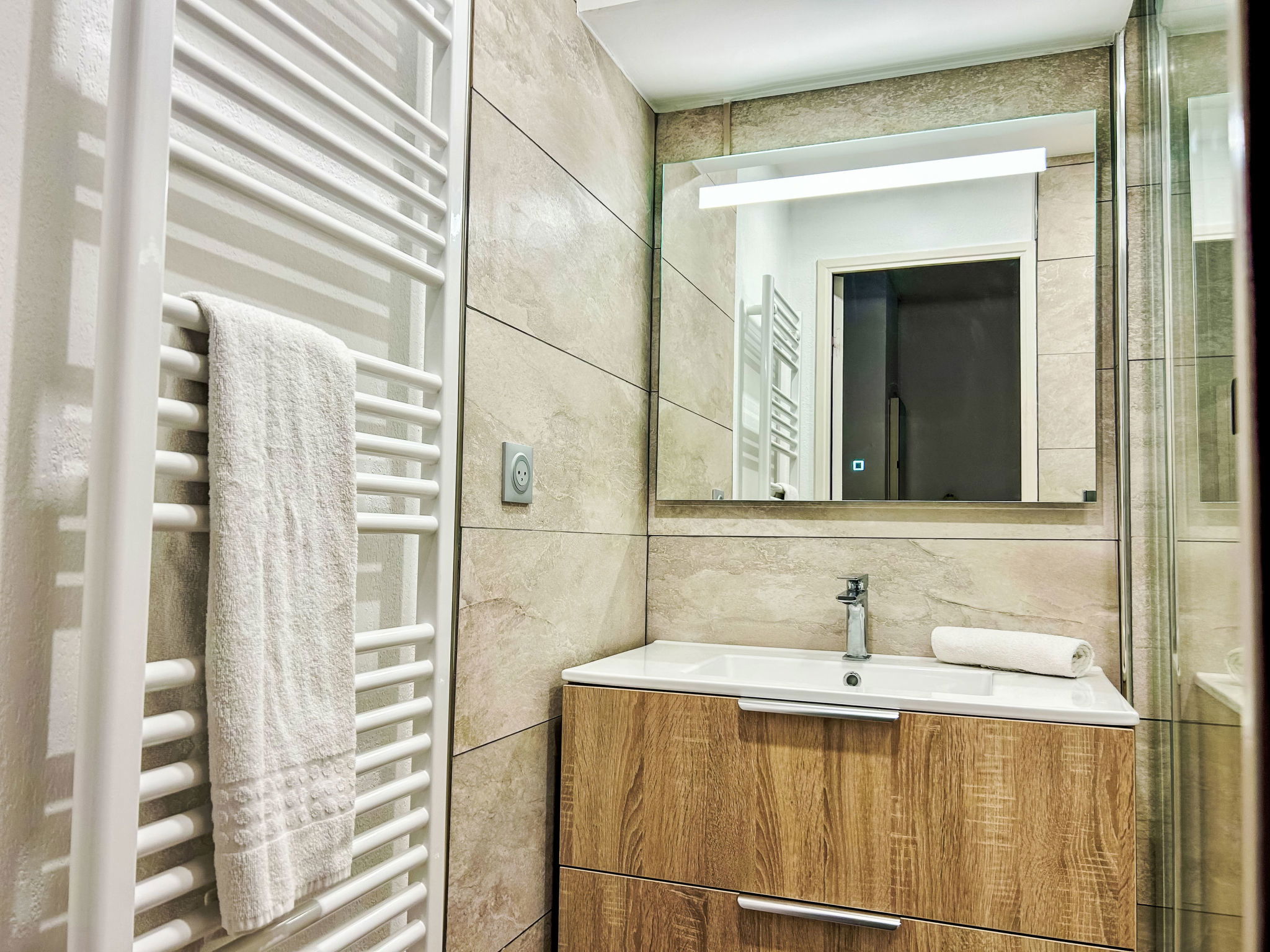 "Les Marines de Gassin 1", 2-room apartment 32 m2 on 2nd floor. Object suitable for 2 adults + 2 children. Renovated in 2016, comfortable and beautiful furnishings: living/dining room with 1 double sofabed (120 cm, length 190 cm), TV (flat screen), air conditioning. Exit to the terrace. 1 room with 1 french bed (140 cm, length 190 cm). Kitchenette (2 hot plates, oven, dishwasher, electric coffee machine, cooking island). Bathroom, sep. WC. Electric heating. Terrace 9 m2. Terrace furniture. View of the sea. Facilities: Internet (WiFi, free). Please note: maximum 1 small pet/ dog allowed. Smoke alarm. 83065000069LG