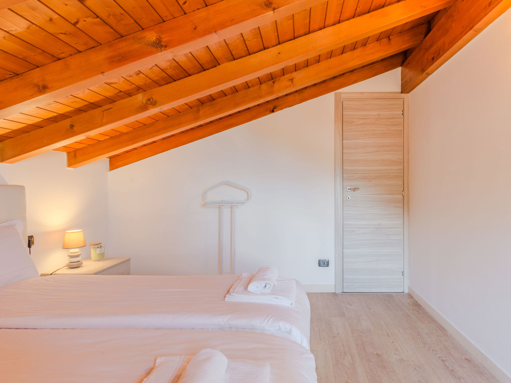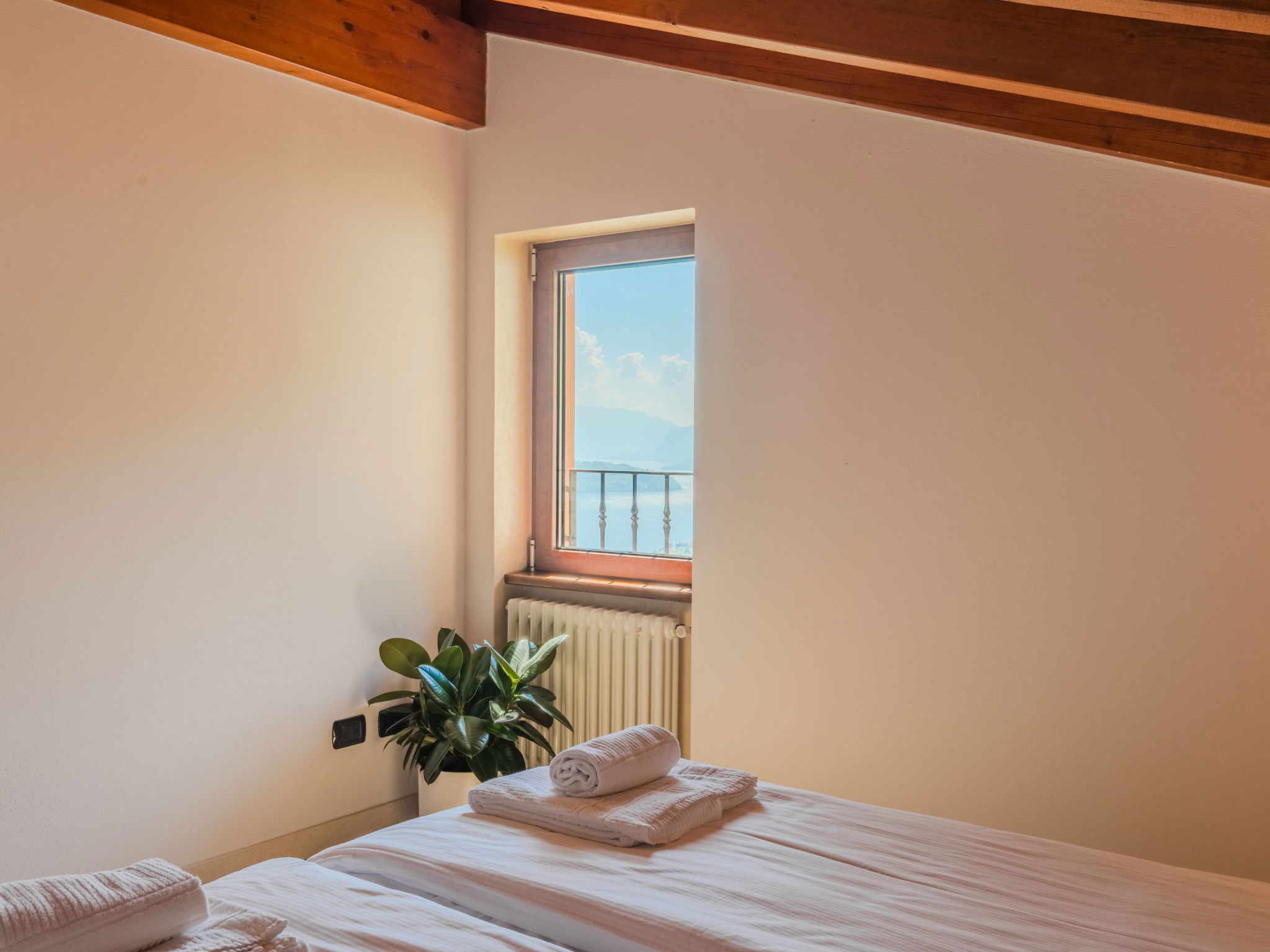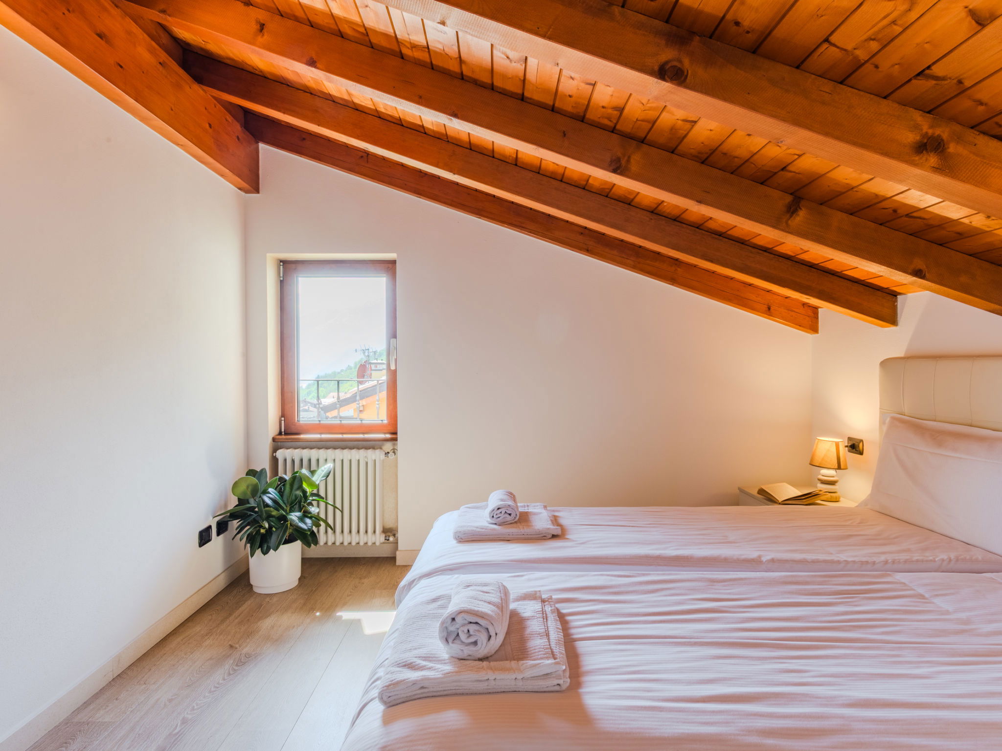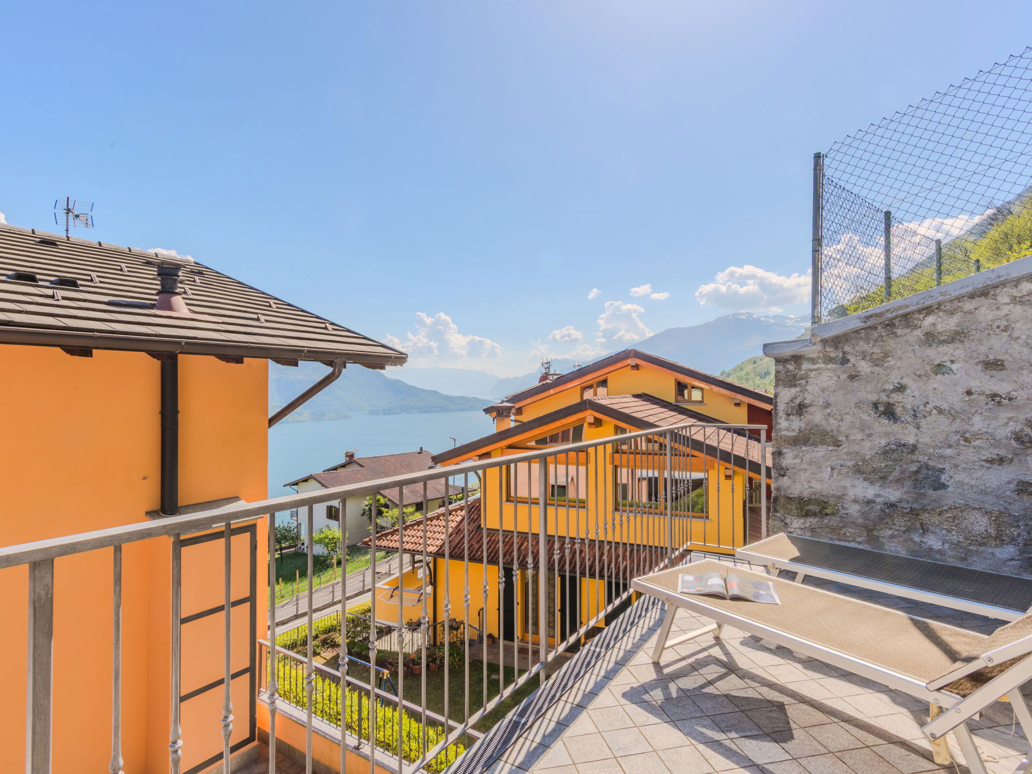 "Robinia", 4-room apartment 100 m2 on 2 levels. Bright, beautiful furnishings: 2nd upper floor: (exterior staircase) living room with open-hearth fireplace (only for decoration), satellite TV. Exit to the balcony. Open kitchen (oven, dishwasher, 4 induction hot plates, toaster, kettle, freezer, electric coffee machine) with dining table. Shower/WC. 3nd upper floor: 1 room with sloping ceilings with 1 french bed (160 cm). 1 room with sloping ceilings with 1 french bed (160 cm). 1 room with sloping ceilings with 1 bed. Bath/WC. Gas heating. Balcony, 2 terraces. Terrace furniture, balcony furniture, barbecue, deck chairs (4). Beautiful panoramic view of the lake and the mountains. Facilities: washing machine. Internet (WiFi, free). Parking (1 car). Please note: non-smokers only. Maximum 1 pet/ dog allowed. Private entrance. IT013226C2N7HHLBFE