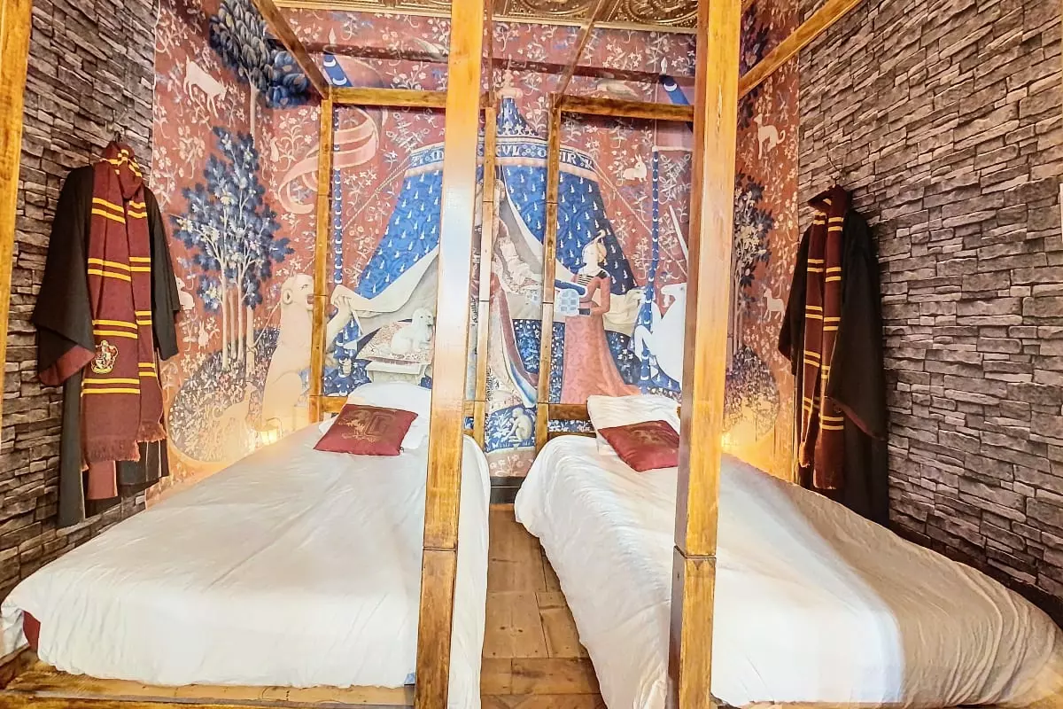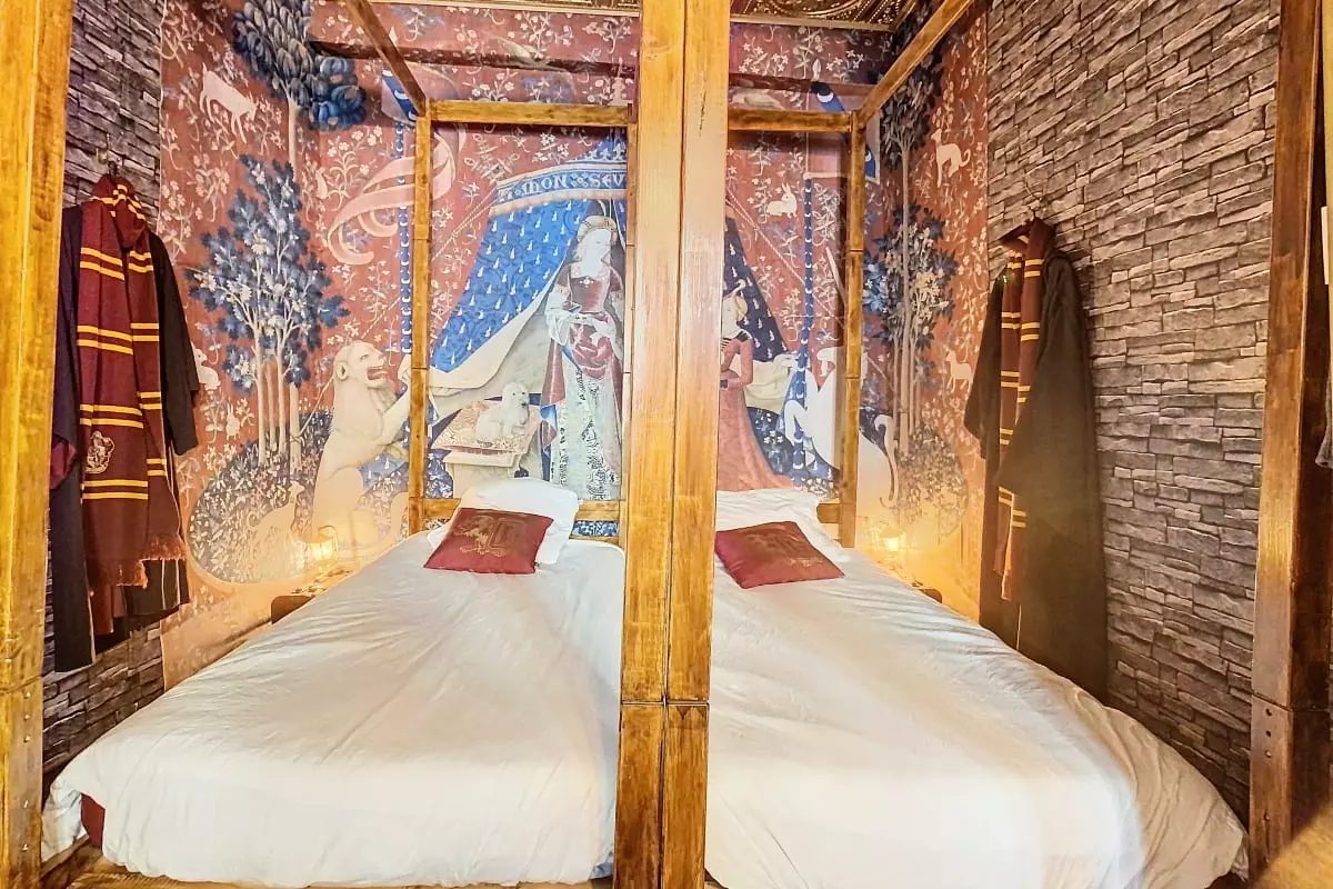 ⚡️ The dormitory area is separated from the common room by red and gold curtains. You will have two single four-poster beds.