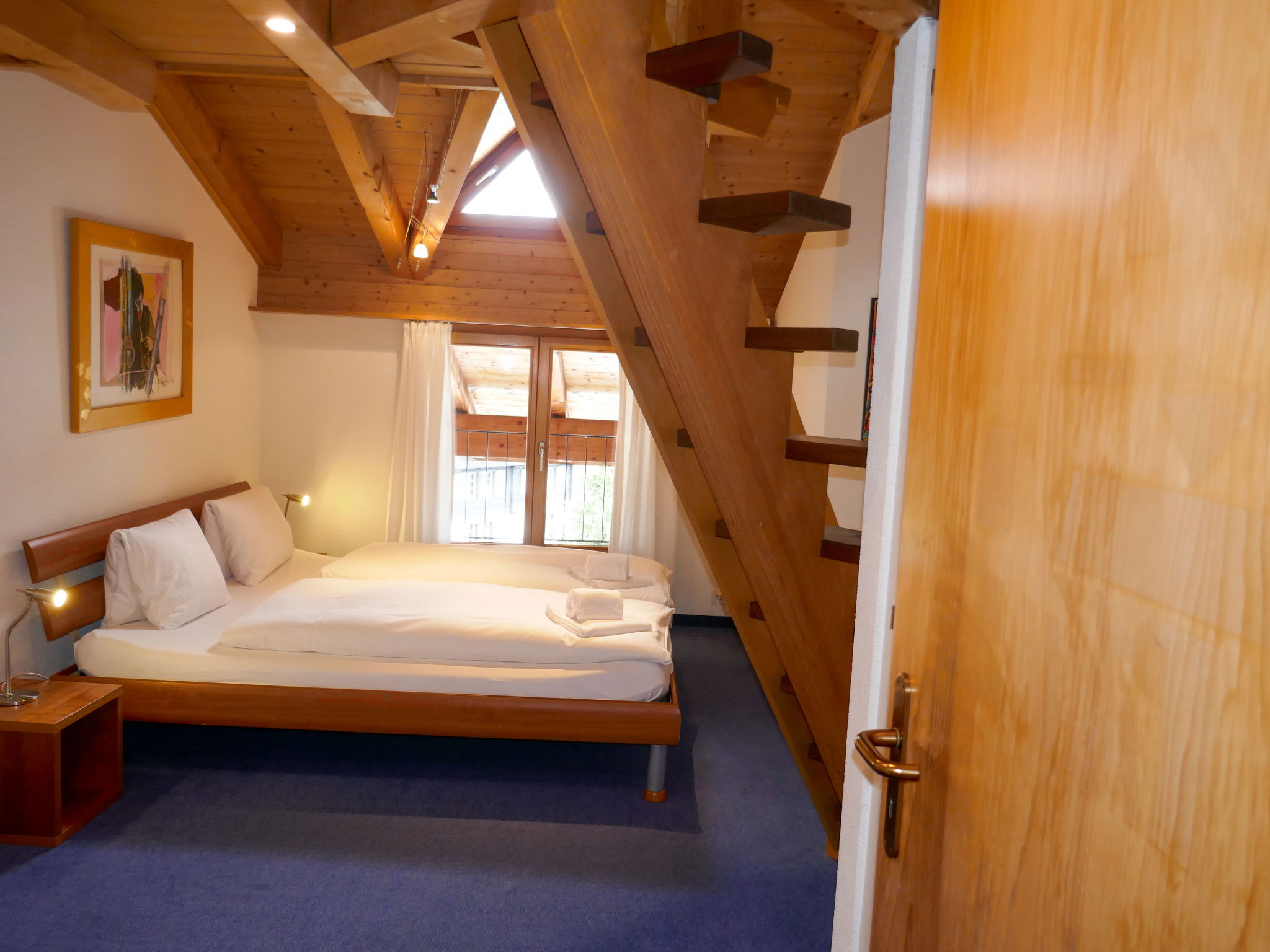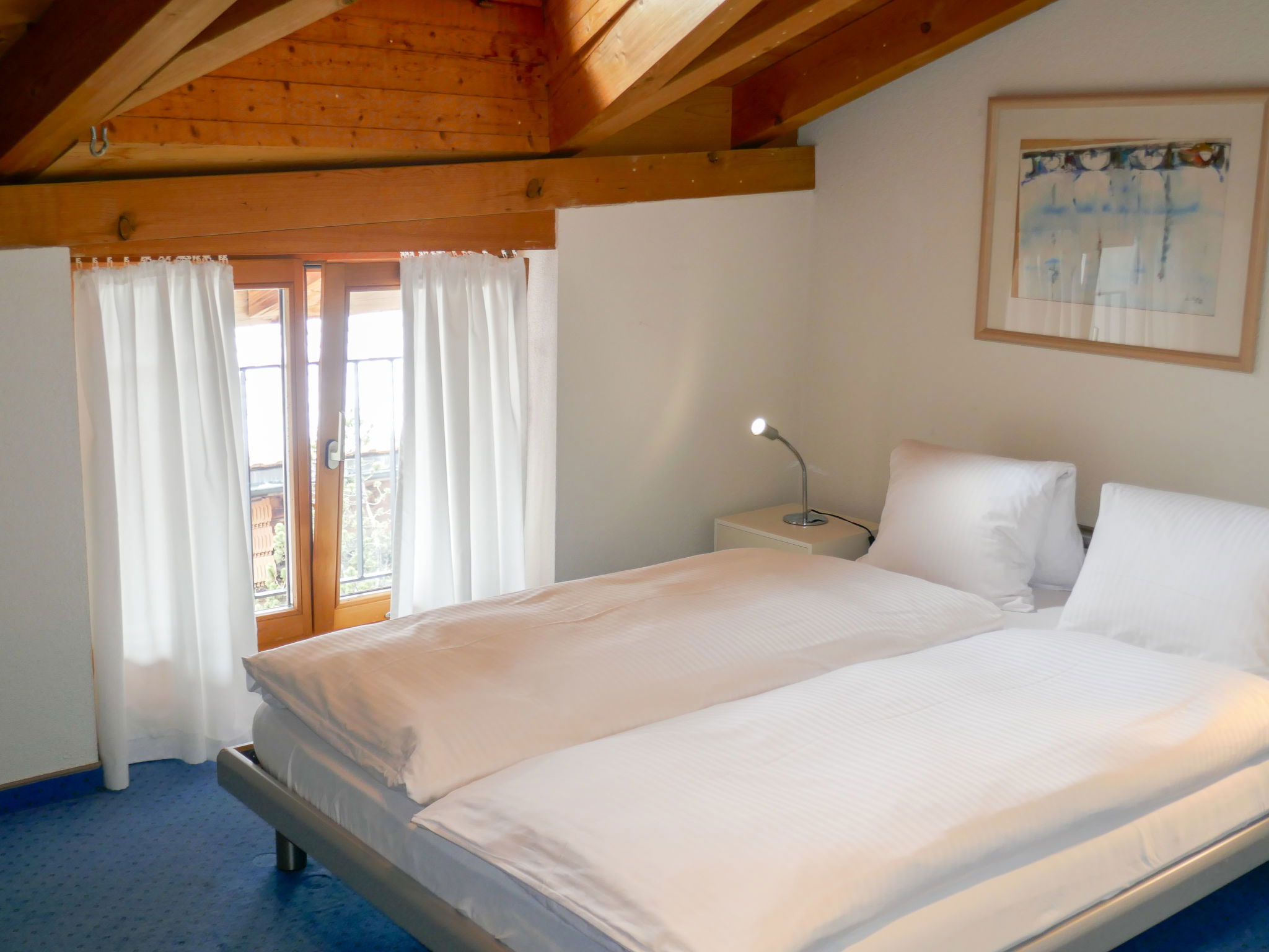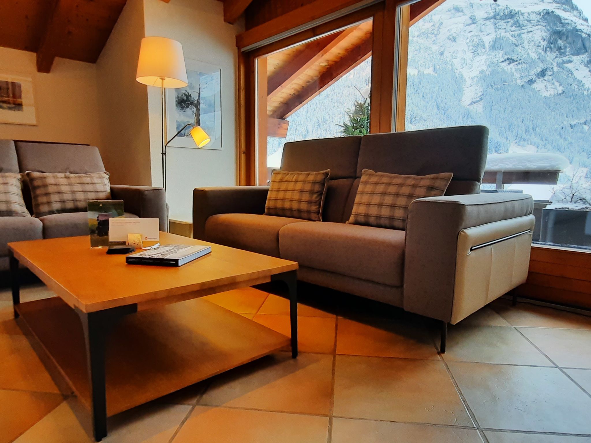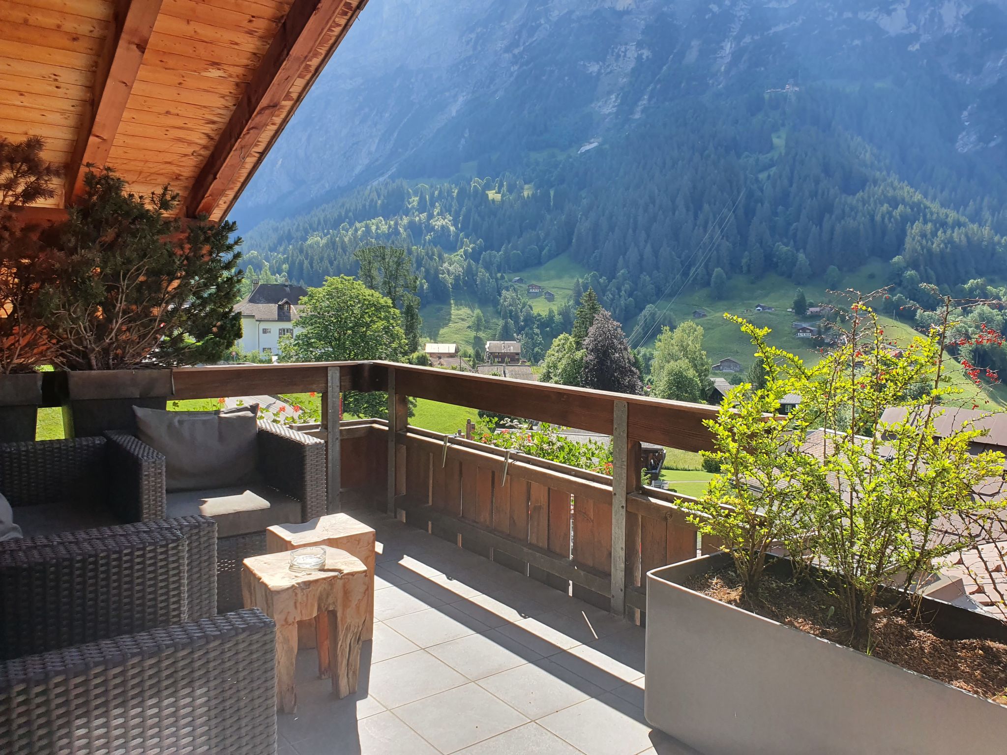4-room apartment 124 m2, on the top floor. Partly with sloping ceilings, comfortable and cosy furnishings: living/dining room with open-hearth fireplace and cable TV (flat screen). Exit to the balcony, south facing position. 1 room with 1 french bed (180 cm, length 200 cm). 1 room with 1 french bed (140 cm, length 200 cm). 1 double bedroom with 2 beds (90 cm, length 190 cm), bath/shower/WC and cable TV. Open kitchen (oven, dishwasher, 4 ceramic glass hob hotplates, toaster, kettle, microwave, electric coffee machine, Capsules for coffee machine (Nespresso) extra). Bath/WC, sep. WC. Balcony 16 m2, south facing position. Terrace furniture. Marvellous view of the mountains and Eiger. Facilities: hair dryer. Internet (WiFi, free). Please note: non-smokers only. Maximum 1 pet/ dog allowed. A fondue set (meat or cheese) and a raclette oven can be borrowed from reception. Access to the apartment by elevator and stairs.